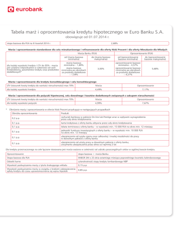 Tabela marż i oprocentowania kredytu hipotecznego w Euro Banku S.A. obowiązuje od 01.07.2014 r. stopa bazowa dla PLN na III kwartał 2014 r. 2,68% Marża i oprocentowanie standardowe dla celu mieszkaniowego i refinansowanie dla oferty Niski Procent i dla oferty Mieszkanie dla Młodych Marża Banku (PLN) od (marża bazowa minimalna) dla każdej wysokości kredytu i LTV do 95% - marża jest ustalana indywidualnie w zależności od cech Kredytobiorcy, parametrów kredytu oraz produktów dodatkowych* Oprocentowanie (PLN) do (marża bazowa maksymalna) od (oprocentowanie bazowe minimalne) do (oprocentowanie bazowe maksymalne) 3,00% oprocentowanie bazowe minimalne – 4,57% oprocentowanie bazowe minimalne po obniżkach za produkty dodatkowe – 4,27% 5,68% marża bazowa minimalna – 1,89% marża bazowa minimalna po obniżkach za produkty dodatkowe – 1,59% Marża i oprocentowanie dla kredytu konsolidacyjnego i celu konsolidacyjnego LTV (stosunek kwoty kredytu do wartości nieruchomości) max 70% Marża Oprocentowanie dla każdej wysokości kredytu 4,49% 7,17% Marża i oprocentowanie dla pożyczki hipotecznej, celu dowolnego i kosztów dodatkowych związanych z zakupem nieruchomości LTV (stosunek kwoty kredytu do wartości nieruchomości) max 70% Marża Oprocentowanie dla każdej wysokości pożyczki 4,99% 7,67% * Obniżenie marży i oprocentowania w ofercie Niski Procent przysługuje w następujących przypadkach Obniżka oprocentowania Produkt 0,2 p.p. rachunek bankowy w pakiecie On-line lub Prestige wraz w wpływem wynagrodzenia przez cały okres kredytowania 0,1 p.p. karta kredytowa z oferty banku aktywna przez cały okres kredytowania 0,1 p.p. lokata terminowa z oferty banku – w wysokości min. 15 000 PLN na okres min. 12 miesięcy 0,1 p.p. jednostki funduszy inwestycyjnych z oferty banku – w wysokości min. 10 000 PLN na okres min. 12 miesięcy 0,1 p.p. ubezpieczenie od ryzyka zgonu oraz całkowitej i trwałej niezdolności do pracy w dowolnym pakiecie z oferty banku 0,1 p.p. ubezpieczenie od utraty pracy w dowolnym pakiecie z oferty banku; utrzymanie ubezpieczenia przez okres co najmniej 3 lat Dla kredytu przeznaczonego na cele łączone stosowana jest marża ważona w zależności od udziału poszczególnych celów w ogólnej kwocie kredytu. Oprocentowanie stopa bazowa + marża Banku Stopa bazowa dla PLN WIBOR 3M z 25 dnia ostatniego miesiąca poprzedniego kwartału kalendarzowego Odsetki karne czterokrotność stopy kredytu lombardowego NBP Wysokość podwyższenia marży z tytułu brakującego wkładu 0,15 p.p. Wysokość podwyższenia marży w związku z brakiem zabezpieczenia spłaty kredytu do czasu uprawomocnienia się wpisu hipoteki 0,85 p.p.
