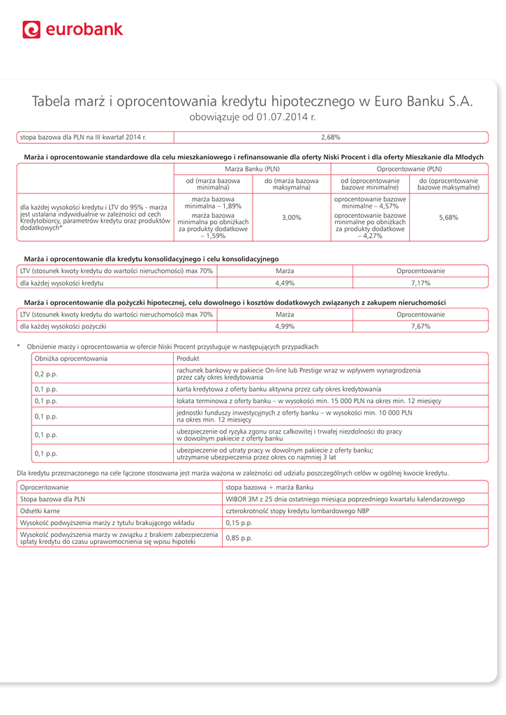 Tabela marż i oprocentowania kredytu hipotecznego w Euro Banku SA