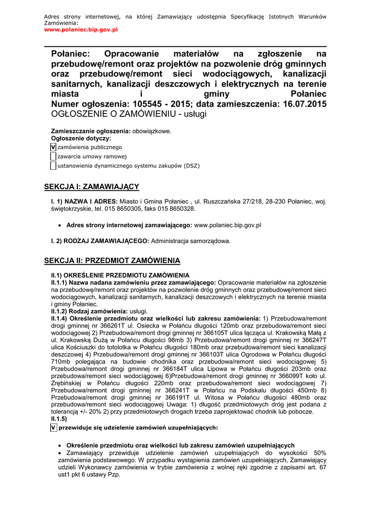 Adres strony internetowej, na której Zamawiający udostępnia Specyfikację Istotnych Warunków Zamówienia: www.polaniec.bip.gov.pl Połaniec: Opracowanie materiałów na zgłoszenie na przebudowę/remont oraz projektów na pozwolenie dróg gminnych oraz przebudowę/remont sieci wodociągowych, kanalizacji sanitarnych, kanalizacji deszczowych i elektrycznych na terenie miasta i gminy Połaniec Numer ogłoszenia: 105545 - 2015; data zamieszczenia: 16.07.2015 OGŁOSZENIE O ZAMÓWIENIU - usługi Zamieszczanie ogłoszenia: obowiązkowe. Ogłoszenie dotyczy: V zamówienia publicznego zawarcia umowy ramowej ustanowienia dynamicznego systemu zakupów (DSZ) SEKCJA I: ZAMAWIAJĄCY I. 1) NAZWA I ADRES: Miasto i Gmina Połaniec , ul. Ruszczańska 27/218, 28-230 Połaniec, woj. świętokrzyskie, tel. 015 8650305, faks 015 8650328. Adres strony internetowej zamawiającego: www.polaniec.bip.gov.pl I. 2) RODZAJ ZAMAWIAJĄCEGO: Administracja samorządowa. SEKCJA II: PRZEDMIOT ZAMÓWIENIA II.1) OKREŚLENIE PRZEDMIOTU ZAMÓWIENIA II.1.1) Nazwa nadana zamówieniu przez zamawiającego: Opracowanie materiałów na zgłoszenie na przebudowę/remont oraz projektów na pozwolenie dróg gminnych oraz przebudowę/remont sieci wodociągowych, kanalizacji sanitarnych, kanalizacji deszczowych i elektrycznych na terenie miasta i gminy Połaniec. II.1.2) Rodzaj zamówienia: usługi. II.1.4) Określenie przedmiotu oraz wielkości lub zakresu zamówienia: 1) Przebudowa/remont drogi gminnej nr 366261T ul. Osiecka w Połańcu długości 120mb oraz przebudowa/remont sieci wodociągowej 2) Przebudowa/remont drogi gminnej nr 366105T ulica łącząca ul. Krakowską Małą z ul. Krakowską Dużą w Połańcu długości 98mb 3) Przebudowa/remont drogi gminnej nr 366247T ulica Kościuszki do totolotka w Połańcu długości 180mb oraz przebudowa/remont sieci kanalizacji deszczowej 4) Przebudowa/remont drogi gminnej nr 366103T ulica Ogrodowa w Połańcu długości 710mb polegająca na budowie chodnika oraz przebudowa/remont sieci wodociągowej 5) Przebudowa/remont drogi gminnej nr 366184T ulica Lipowa w Połańcu długości 203mb oraz przebudowa/remont sieci wodociągowej 6)Przebudowa/remont drogi gminnej nr 366099T koło ul. Zrębińskiej w Połańcu długości 220mb oraz przebudowa/remont sieci wodociągowej 7) Przebudowa/remont drogi gminnej nr 366241T w Połańcu na Podskalu długości 450mb 8) Przebudowa/remont drogi gminnej nr 366191T ul. Witosa w Połańcu długości 480mb oraz przebudowa/remont sieci wodociągowej Uwaga: 1) długość przedmiotowych dróg jest podana z tolerancją +/- 20% 2) przy przedmiotowych drogach trzeba zaprojektować chodnik lub pobocze. II.1.5) V przewiduje się udzielenie zamówień uzupełniających: Określenie przedmiotu oraz wielkości lub zakresu zamówień uzupełniających Zamawiający przewiduje udzielenie zamówień uzupełniających do wysokości 50% zamówienia podstawowego. W przypadku wystąpienia zamówień uzupełniających, Zamawiający udzieli Wykonawcy zamówienia w trybie zamówienia z wolnej ręki zgodnie z zapisami art. 67 ust1 pkt 6 ustawy Pzp. II.1.6) Wspólny Słownik Zamówień (CPV): 71.32.00.00-7. II.1.7) Czy dopuszcza się złożenie oferty częściowej: nie. II.1.8) Czy dopuszcza się złożenie oferty wariantowej: nie. II.2) CZAS TRWANIA ZAMÓWIENIA LUB TERMIN WYKONANIA: Zakończenie: 10.09.2015. SEKCJA III: INFORMACJE O CHARAKTERZE PRAWNYM, EKONOMICZNYM, FINANSOWYM I TECHNICZNYM III.1) WADIUM Informacja na temat wadium: 1. W prowadzonym postępowaniu Zamawiający wymaga wniesienia wadium w wysokości: 250 zł. 2. Wadium należy wnieść przed upływem terminu składania ofert. 3. Wadium może być wnoszone w jednej lub kilku następujących formach: 1) pieniądzu, 2) poręczeniach bankowych lub poręczeniach spółdzielczej kasy oszczędnościowo-kredytowej, z tym że poręczenie kasy jest zawsze poręczeniem pieniężnym, 3) gwarancjach bankowych, 4) gwarancjach ubezpieczeniowych, 5) poręczeniach udzielanych przez podmioty, o których mowa w art. 6b ust. 5 pkt 2 ustawy z dnia 9 listopada 2000 r. o utworzeniu Polskiej Agencji Rozwoju Przedsiębiorczości ( Dz. U. Nr 109, poz. 1158, z późn. zm.) 4. Poręczenia lub gwarancje, wnoszone jako wadium muszą być ważne minimum przez okres związania ofertą i dotyczyć przedmiotowego zamówienia. 5. Wadium wnoszone w pieniądzu należy wpłacić przelewem /operacja bezgotówkowa/ na rachunek bankowy w BS Połaniec NR 80942500080000234920060008. III.2) ZALICZKI III.3) WARUNKI UDZIAŁU W POSTĘPOWANIU ORAZ OPIS SPOSOBU DOKONYWANIA OCENY SPEŁNIANIA TYCH WARUNKÓW III. 3.1) Uprawnienia do wykonywania określonej działalności lub czynności, jeżeli przepisy prawa nakładają obowiązek ich posiadania Opis sposobu dokonywania oceny spełniania tego warunku o Zamawiający nie określa szczegółowego sposobu oceny spełniania tego warunku. III.3.2) Wiedza i doświadczenie Opis sposobu dokonywania oceny spełniania tego warunku o Zamawiający uzna ten warunek za spełniony jeżeli Wykonawca wykaże, że wykonał w okresie ostatnich 3 lat przed upływem terminu składania ofert, a jeśli okres prowadzenia działalności jest krótszy - w tym okresie, minimum 1 usługi o wartości brutto 14 000 zł, odpowiadające swoim rodzajem niniejszemu zamówieniu, tj. polegającej na projektowaniu budowy dróg. III.3.3) Potencjał techniczny Opis sposobu dokonywania oceny spełniania tego warunku o Zamawiający nie określa szczegółowego sposobu oceny spełniania tego warunku. III.3.4) Osoby zdolne do wykonania zamówienia Opis sposobu dokonywania oceny spełniania tego warunku o Warunek spełni Wykonawca, który dysponuje osobami zdolnymi do wykonania zamówienia: co najmniej jedną osobą posiadającą uprawnienia budowlane do projektowania w specjalności drogowej oraz przynależącym do właściwej izby samorządu zawodowego, lub przedstawią pisemne zobowiązanie innych podmiotów o udostępnieniu osób zdolnych do wykonania z
