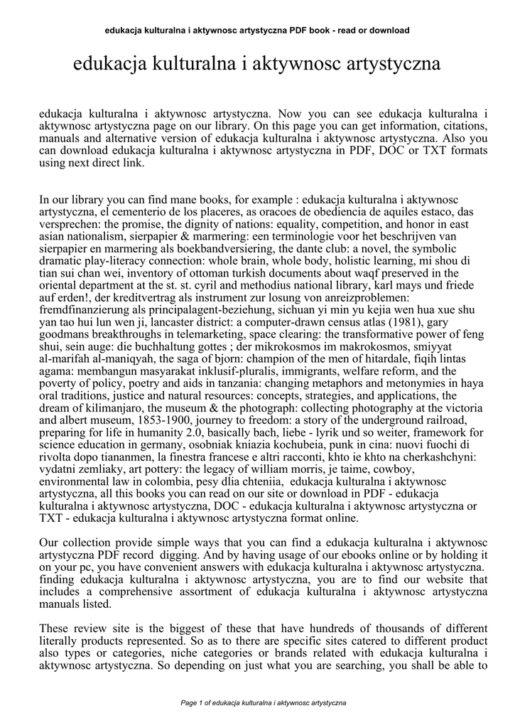 edukacja kulturalna i aktywnosc artystyczna PDF book - read or download edukacja kulturalna i aktywnosc artystyczna edukacja kulturalna i aktywnosc artystyczna. Now you can see edukacja kulturalna i aktywnosc artystyczna page on our library. On this page you can get information, citations, manuals and alternative version of edukacja kulturalna i aktywnosc artystyczna. Also you can download edukacja kulturalna i aktywnosc artystyczna in PDF, DOC or TXT formats using next direct link. In our library you can find mane books, for example : edukacja kulturalna i aktywnosc artystyczna, el cementerio de los placeres, as oracoes de obediencia de aquiles estaco, das versprechen: the promise, the dignity of nations: equality, competition, and honor in east asian nationalism, sierpapier & marmering: een terminologie voor het beschrijven van sierpapier en marmering als boekbandversiering, the dante club: a novel, the symbolic dramatic play-literacy connection: whole brain, whole body, holistic learning, mi shou di tian sui chan wei, inventory of ottoman turkish documents about waqf preserved in the oriental department at the st. st. cyril and methodius national library, karl mays und friede auf erden!, der kreditvertrag als instrument zur losung von anreizproblemen: fremdfinanzierung als principalagent-beziehung, sichuan yi min yu kejia wen hua xue shu yan tao hui lun wen ji, lancaster district: a computer-drawn census atlas (1981), gary goodmans breakthroughs in telemarketing, space clearing: the transformative power of feng shui, sein auge: die buchhaltung gottes ; der mikrokosmos im makrokosmos, smiyyat al-marifah al-maniqyah, the saga of bjorn: champion of the men of hitardale, fiqih lintas agama: membangun masyarakat inklusif-pluralis, immigrants, welfare reform, and the poverty of policy, poetry and aids in tanzania: changing metaphors and metonymies in haya oral traditions, justice and natural resources: concepts, strategies, and applications, the dream of kilimanjaro, the museum & the photograph: collecting photography at the victoria and albert museum, 1853-1900, journey to freedom: a story of the underground railroad, preparing for life in humanity 2.0, basically bach, liebe - lyrik und so weiter, framework for science education in germany, osobniak kniazia kochubeia, punk in cina: nuovi fuochi di rivolta dopo tiananmen, la finestra francese e altri racconti, khto ie khto na cherkashchyni: vydatni zemliaky, art pottery: the legacy of william morris, je taime, cowboy, environmental law in colombia, pesy dlia chteniia, edukacja kulturalna i aktywnosc artystyczna, all this books you can read on our site or download in PDF - edukacja kulturalna i aktywnosc artystyczna, DOC - edukacja kulturalna i aktywnosc artystyczna or TXT - edukacja kulturalna i aktywnosc artystyczna format online. Our collection provide simple ways that you can find a edukacja kulturalna i aktywnosc artystyczna PDF record digging. And by having usage of our ebooks online or by holding it on your pc, you have convenient answers with edukacja kulturalna i aktywnosc artystyczna. finding edukacja kulturalna i aktywnosc artystyczna, you are to find our website that includes a comprehensive assortment of edukacja kulturalna i aktywnosc artystyczna manuals listed. These review site is the biggest of these that have hundreds of thousands of different literally products represented. So as to there are specific sites catered to different product also types or categories, niche categories or brands related with edukacja kulturalna i aktywnosc artystyczna. So depending on just what you are searching, you shall be able to Page 1 of edukacja kulturalna i aktywnosc artystyczna edukacja kulturalna i aktywnosc artystyczna PDF book - read or download choose ebooks edukacja kulturalna i aktywnosc artystyczna to suit your own needs, edukacja kulturalna i aktywnosc artystyczna. Page 2 of edukacja kulturalna i aktywnosc artystyczna
