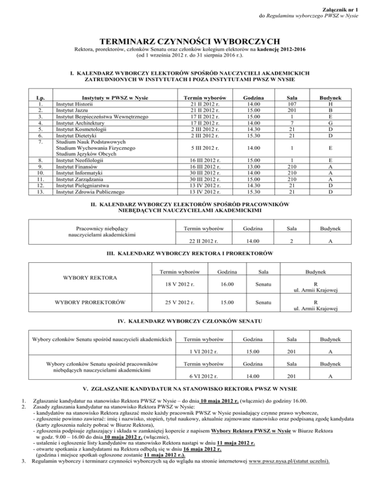 Załącznik nr 1 do Regulaminu wyborczego PWSZ w Nysie TERMINARZ CZYNNOŚCI WYBORCZYCH Rektora, prorektorów, członków Senatu oraz członków kolegium elektorów na kadencję 2012-2016 (od 1 września 2012 r. do 31 sierpnia 2016 r.). I. KALENDARZ WYBORCZY ELEKTORÓW SPOŚRÓD NAUCZYCIELI AKADEMICKICH ZATRUDNIONYCH W INSTYTUTACH I POZA INSTYTUTAMI PWSZ W NYSIE Lp. 1. 2. 3. 4. 5. 6. 7. 8. 9. 10. 11. 12. 13. Instytuty w PWSZ w Nysie Instytut Historii Instytut Jazzu Instytut Bezpieczeństwa Wewnętrznego Instytut Architektury Instytut Kosmetologii Instytut Dietetyki Studium Nauk Podstawowych Studium Wychowania Fizycznego Studium Języków Obcych Instytut Neofilologii Instytut Finansów Instytut Informatyki Instytut Zarządzania Instytut Pielęgniarstwa Instytut Zdrowia Publicznego Termin wyborów 21 II 2012 r. 21 II 2012 r. 17 II 2012 r. 17 II 2012 r. 2 III 2012 r. 2 III 2012 r. Godzina 14.00 15.00 15.00 14.00 14.30 15.30 Sala 107 201 1 7 21 21 Budynek H B E G D D 5 III 2012 r. 14.00 1 E 16 III 2012 r. 16 III 2012 r. 30 III 2012 r. 30 III 2012 r. 13 IV 2012 r. 13 IV 2012 r. 15.00 13.00 14.00 15.00 14.30 15.30 1 210 210 210 21 21 E A A A D D II. KALENDARZ WYBORCZY ELEKTORÓW SPOŚRÓD PRACOWNIKÓW NIEBĘDĄCYCH NAUCZYCIELAMI AKADEMICKIMI Pracownicy niebędący nauczycielami akademickimi Termin wyborów Godzina Sala Budynek 22 II 2012 r. 14.00 2 A III. KALENDARZ WYBORCZY REKTORA I PROREKTORÓW Termin wyborów Godzina Sala Budynek 18 V 2012 r. 16.00 Senatu R ul. Armii Krajowej 25 V 2012 r. 15.00 Senatu R ul. Armii Krajowej WYBORY REKTORA WYBORY PROREKTORÓW IV. KALENDARZ WYBORCZY CZŁONKÓW SENATU Wybory członków Senatu spośród nauczycieli akademickich Wybory członków Senatu spośród pracowników niebędących nauczycielami akademickimi Termin wyborów Godzina Sala Budynek 1 VI 2012 r. 15.00 201 A Termin wyborów Godzina Sala Budynek 6 VI 2012 r. 14.00 201 A V. ZGŁASZANIE KANDYDATUR NA STANOWISKO REKTORA PWSZ W NYSIE 1. 2. 3. Zgłaszanie kandydatur na stanowisko Rektora PWSZ w Nysie – do dnia 10 maja 2012 r. (włącznie) do godziny 16.00. Zasady zgłaszania kandydatur na stanowisko Rektora PWSZ w Nysie: - kandydatów na stanowisko Rektora zgłaszać moŜe kaŜdy pracownik PWSZ w Nysie posiadający czynne prawo wyborcze, - zgłoszenie powinno zawierać: imię i nazwisko, stopień, tytuł naukowy, aktualnie zajmowane stanowisko oraz podpisaną zgodę kandydata (karty zgłoszenia naleŜy pobrać w Biurze Rektora), - zgłoszenia podpisuje zgłaszający i składa w zamkniętej kopercie z napisem Wybory Rektora PWSZ w Nysie w Biurze Rektora w godz. 9.00 – 16.00 do dnia 10 maja 2012 r. (włącznie), - ustalenie i ogłoszenie listy kandydatów na stanowisko Rektora nastąpi w dniu 11 maja 2012 r. - otwarte spotkania z kandydatami na Rektora odbędą się w dniu 16 maja 2012 r. (godzina i miejsce spotkań ogłoszone zostanie 11 maja 2012 r.). Regulamin wyborczy i terminarz czynności wyborczych są do wglądu na stronie internetowej www.pwsz.nysa.pl/(statut uczelni).