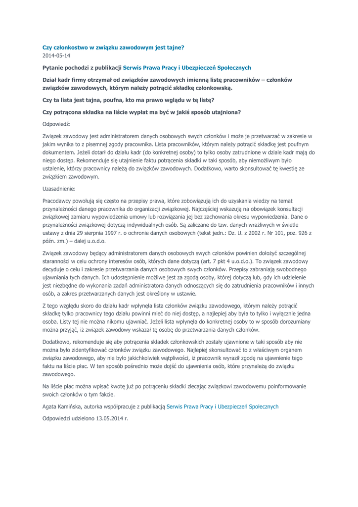 Czy członkostwo w związku zawodowym jest tajne? 2014-05-14 Pytanie pochodzi z publikacji Serwis Prawa Pracy i Ubezpieczeń Społecznych Dział kadr firmy otrzymał od związków zawodowych imienną listę pracowników – członków związków zawodowych, którym należy potrącić składkę członkowską. Czy ta lista jest tajna, poufna, kto ma prawo wglądu w tę listę? Czy potrącona składka na liście wypłat ma być w jakiś sposób utajniona? Odpowiedź: Związek zawodowy jest administratorem danych osobowych swych członków i może je przetwarzać w zakresie w jakim wynika to z pisemnej zgody pracownika. Lista pracowników, którym należy potrącić składkę jest poufnym dokumentem. Jeżeli dotarł do działu kadr (do konkretnej osoby) to tylko osoby zatrudnione w dziale kadr mają do niego dostęp. Rekomenduje się utajnienie faktu potrącenia składki w taki sposób, aby niemożliwym było ustalenie, którzy pracownicy należą do związków zawodowych. Dodatkowo, warto skonsultować tę kwestię ze związkiem zawodowym. Uzasadnienie: Pracodawcy powołują się często na przepisy prawa, które zobowiązują ich do uzyskania wiedzy na temat przynależności danego pracownika do organizacji związkowej. Najczęściej wskazują na obowiązek konsultacji związkowej zamiaru wypowiedzenia umowy lub rozwiązania jej bez zachowania okresu wypowiedzenia. Dane o przynależności związkowej dotyczą indywidualnych osób. Są zaliczane do tzw. danych wrażliwych w świetle ustawy z dnia 29 sierpnia 1997 r. o ochronie danych osobowych (tekst jedn.: Dz. U. z 2002 r. Nr 101, poz. 926 z późn. zm.) – dalej u.o.d.o. Związek zawodowy będący administratorem danych osobowych swych członków powinien dołożyć szczególnej staranności w celu ochrony interesów osób, których dane dotyczą (art. 7 pkt 4 u.o.d.o.). To związek zawodowy decyduje o celu i zakresie przetwarzania danych osobowych swych członków. Przepisy zabraniają swobodnego ujawniania tych danych. Ich udostępnienie możliwe jest za zgodą osoby, której dotyczą lub, gdy ich udzielenie jest niezbędne do wykonania zadań administratora danych odnoszących się do zatrudnienia pracowników i innych osób, a zakres przetwarzanych danych jest określony w ustawie. Z tego względu skoro do działu kadr wpłynęła lista członków związku zawodowego, którym należy potrącić składkę tylko pracownicy tego działu powinni mieć do niej dostęp, a najlepiej aby była to tylko i wyłącznie jedna osoba. Listy tej nie można nikomu ujawniać. Jeżeli lista wpłynęła do konkretnej osoby to w sposób dorozumiany można przyjąć, iż związek zawodowy wskazał tę osobę do przetwarzania danych członków. Dodatkowo, rekomenduje się aby potrącenia składek członkowskich zostały ujawnione w taki sposób aby nie można było zidentyfikować członków związku zawodowego. Najlepiej skonsultować to z właściwym organem związku zawodowego, aby nie było jakichkolwiek wątpliwości, iż pracownik wyraził zgodę na ujawnienie tego faktu na liście płac. W ten sposób pośrednio może dojść do ujawnienia osób, które przynależą do związku zawodowego. Na liście płac można wpisać kwotę już po potrąceniu składki zlecając związkowi zawodowemu poinformowanie swoich członków o tym fakcie. Agata Kamińska, autorka współpracuje z publikacją Serwis Prawa Pracy i Ubezpieczeń Społecznych Odpowiedzi udzielono 13.05.2014 r.