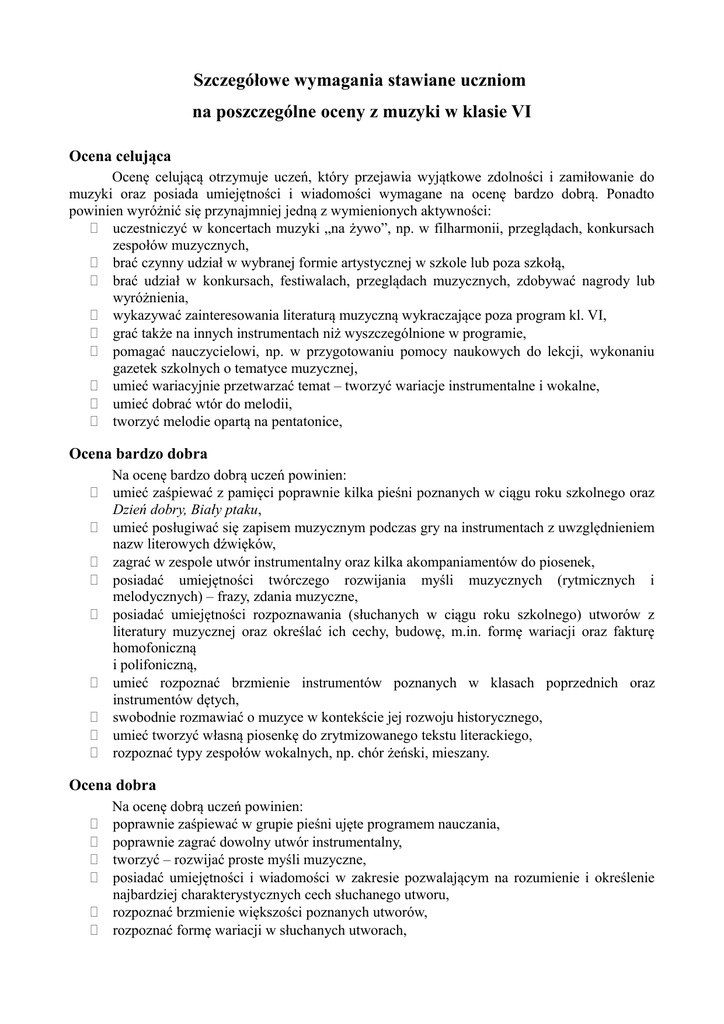 Szczegółowe wymagania stawiane uczniom na poszczególne oceny z muzyki w klasie VI Ocena celująca Ocenę celującą otrzymuje uczeń, który przejawia wyjątkowe zdolności i zamiłowanie do muzyki oraz posiada umiejętności i wiadomości wymagane na ocenę bardzo dobrą. Ponadto powinien wyróżnić się przynajmniej jedną z wymienionych aktywności: uczestniczyć w koncertach muzyki „na żywo”, np. w filharmonii, przeglądach, konkursach zespołów muzycznych, brać czynny udział w wybranej formie artystycznej w szkole lub poza szkołą, brać udział w konkursach, festiwalach, przeglądach muzycznych, zdobywać nagrody lub wyróżnienia, wykazywać zainteresowania literaturą muzyczną wykraczające poza program kl. VI, grać także na innych instrumentach niż wyszczególnione w programie, pomagać nauczycielowi, np. w przygotowaniu pomocy naukowych do lekcji, wykonaniu gazetek szkolnych o tematyce muzycznej, umieć wariacyjnie przetwarzać temat – tworzyć wariacje instrumentalne i wokalne, umieć dobrać wtór do melodii, tworzyć melodie opartą na pentatonice, Ocena bardzo dobra Na ocenę bardzo dobrą uczeń powinien: umieć zaśpiewać z pamięci poprawnie kilka pieśni poznanych w ciągu roku szkolnego oraz Dzień dobry, Biały ptaku, umieć posługiwać się zapisem muzycznym podczas gry na instrumentach z uwzględnieniem nazw literowych dźwięków, zagrać w zespole utwór instrumentalny oraz kilka akompaniamentów do piosenek, posiadać umiejętności twórczego rozwijania myśli muzycznych (rytmicznych i melodycznych) – frazy, zdania muzyczne, posiadać umiejętności rozpoznawania (słuchanych w ciągu roku szkolnego) utworów z literatury muzycznej oraz określać ich cechy, budowę, m.in. formę wariacji oraz fakturę homofoniczną i polifoniczną, umieć rozpoznać brzmienie instrumentów poznanych w klasach poprzednich oraz instrumentów dętych, swobodnie rozmawiać o muzyce w kontekście jej rozwoju historycznego, umieć tworzyć własną piosenkę do zrytmizowanego tekstu literackiego, rozpoznać typy zespołów wokalnych, np. chór żeński, mieszany. Ocena dobra Na ocenę dobrą uczeń powinien: poprawnie zaśpiewać w grupie pieśni ujęte programem nauczania, poprawnie zagrać dowolny utwór instrumentalny, tworzyć – rozwijać proste myśli muzyczne, posiadać umiejętności i wiadomości w zakresie pozwalającym na rozumienie i określenie najbardziej charakterystycznych cech słuchanego utworu, rozpoznać brzmienie większości poznanych utworów, rozpoznać formę wariacji w słuchanych utworach, rozumieć znaczenie większości terminów muzycznych z programu nauczania klasy VI. Ocena dostateczna Ocenę dostateczną otrzymuje uczeń wówczas, gdy bierze udział w procesie lekcyjnym na miarę swoich możliwości oraz uczestniczy w wybranych formach działalności muzycznej. Ponadto opanował określone umiejętności i wiadomości podstawowe, a mianowicie: umie zaśpiewać pieśni o średnim stopniu trudności, uzupełnia podane takty w metrum złożonym z uwzględnieniem poznanych wartości rytmicznych i pauz (cała nuta z kropką, ćwierćnuta z kropką, ósemka z kropką i odpowiadające im pauzy), wyjaśnia pojęcia: metrum złożone, akord, triada, wariacje, pentatonika, z pomocą nauczyciela gra na flecie lub dzwonkach proste fragmenty melodii, próbuje dobrać do piosenek prosty akompaniament perkusyjny, rozpoznaje brzmienie kilku poznanych instrumentów, zna wartości nut i pauz, rozpoznaje muzykę solową, zespół kameralny, chór, orkiestrę, rozpoznaje słuchem gamę durową i molową, zna podstawowe, najważniejsze wiadomości na temat stylów z historii muzyki, posiada niezbędną wiedzę o formach muzycznych potrzebną do słuchania muzyki. Ocena dopuszczająca Ocenę dopuszczającą otrzymuje uczeń, który w ograniczonym zakresie opanował ustalone umiejętności i wiadomości podstawowe. Wykazuje pozytywny stosunek do przedmiotu i potrafi wykonać z pomocą nauczyciela najprostsze zadania: podejmuje próby śpiewania lub recytuje tekst piosenki, gra na flecie lub dzwonkach pojedyncze dźwięki, próbuje powtarzać najprostsze ćwiczenia rytmiczne, usiłuje grać najprostsze akompaniamenty perkusyjne do łatwych melodii, odróżnia muzykę solową od zespołowej, chóralną od orkiestrowej, współczesną od dawnej, wymienia niektóre terminy muzyczne. Ocena niedostateczna Ocenę niedostateczną uczeń otrzymuje tylko w sytuacjach wyjątkowych, tzn. mimo usilnych starań nauczyciela uczeń ma negatywny stosunek do przedmiotu oraz posiada bardzo duże braki z zakresu ustalonych podstawowych wymagań edukacyjnych, dotyczących wiadomości i umiejętności przewidzianych dla danej klasy. Mimo pomocy nauczyciela nie potrafi i nie chce wykonać nawet najprostszych poleceń wynikających z programu danej klasy. Nie prowadzi również zeszytu przedmiotowego (zeszytu ćwiczeń). Uwaga! Na ocenę dopuszczającą i dostateczną uczeń spełnia zgodnie z zatwierdzonym programem wymagania podstawowe, a na ocenę dobrą i bardzo dobrą – wymagania ponadpodstawowe