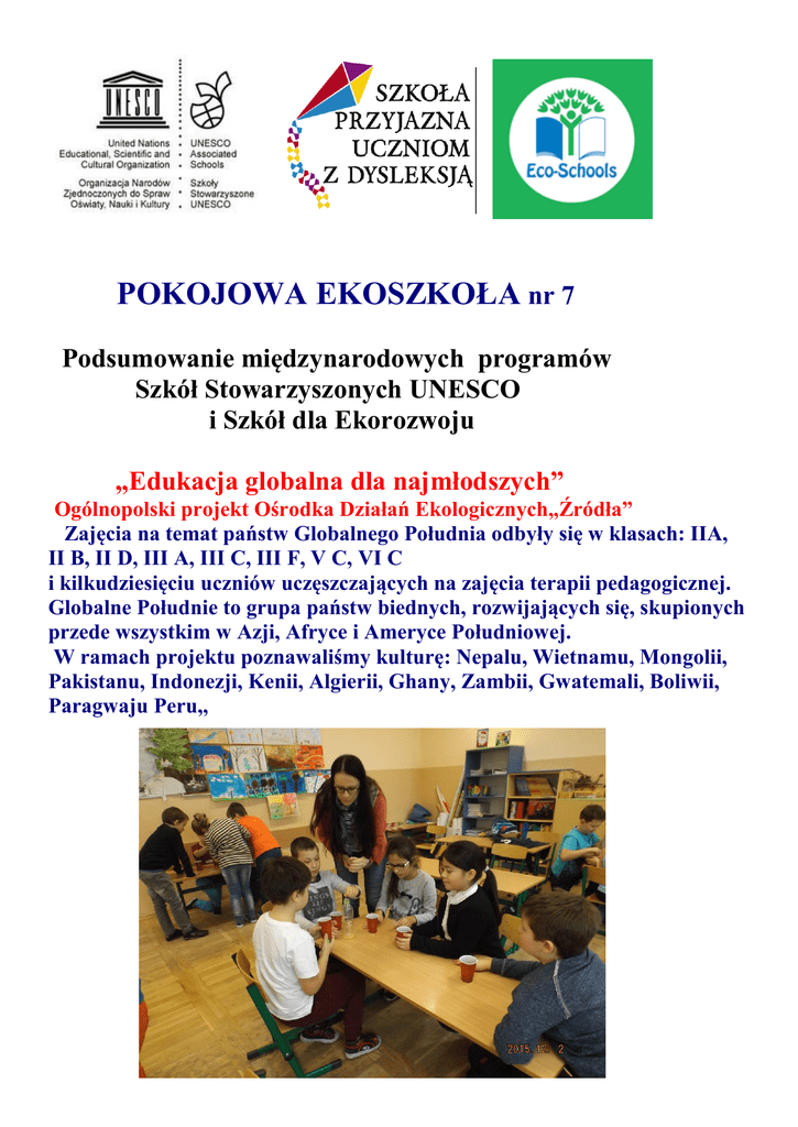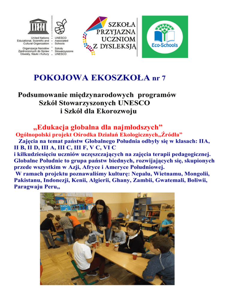 POKOJOWA EKOSZKOŁA nr 7 Podsumowanie międzynarodowych programów Szkół Stowarzyszonych UNESCO i Szkół dla Ekorozwoju „Edukacja globalna dla najmłodszych” Ogólnopolski projekt Ośrodka Działań Ekologicznych„Źródła” Zajęcia na temat państw Globalnego Południa odbyły się w klasach: IIA, II B, II D, III A, III C, III F, V C, VI C i kilkudziesięciu uczniów uczęszczających na zajęcia terapii pedagogicznej. Globalne Południe to grupa państw biednych, rozwijających się, skupionych przede wszystkim w Azji, Afryce i Ameryce Południowej. W ramach projektu poznawaliśmy kulturę: Nepalu, Wietnamu, Mongolii, Pakistanu, Indonezji, Kenii, Algierii, Ghany, Zambii, Gwatemali, Boliwii, Paragwaju Peru,, „Kim są uchodźcy mieszkający w Polsce?” Zajęcia wychowawcze na ten temat odbyły się w klasach VIC, VI G, V B, Klasa VI G VI Raszyńskie Forum Ekologiczne Odbyło się w dniu 16 czerwca. Tematem wiodącym były PRAWA ZWIERZĄT. Uczestnicy zapoznali się z Powszechna Deklaracją Praw Zwierząt, rasami psów i kotów oraz gatunkami objętymi ochroną. Zapoznali się z płytą „Edukacja globalna dla najmłodszych”. W forum uczestniczyło 200 uczennic i uczniów z 11 klas: I C, I H, IV A, IV D, V A, V B, V C, V D, V E, VI A, VI E „Problemy współczesnego świata a prawa dziecka” Ogólnopolski projekt UNICEF W ramach projektu omawialiśmy: 1. Cele Zrównoważonego Rozwoju na lata 2015- 2030, 2. Problemy związane z ubóstwem, zdrowiem i zmianami klimatu w Polsce i Gwatemali. 3. Poznaliśmy kulturę Gwatemali. W projekcie uczestniczyli uczniowie z klas: V C, VI B, VI C i VI G. DEKALOG EKOLOGICZNY Ucznia Szkoły Podstawowej w Raszynie rok szkolny 2015/ 2016 1 .Jedz dobre, zdrowe produkty! Jedz odpowiedzialnie, zgodnie z piramidą żywienia! Rób rozsądnie zakupy! Jedz owoce i warzywa, bo to zdrowe łakocie! 2. Jedz co 3 godziny, 5 razy dziennie: warzywa i owoce, bo to zdrowe łakocie, zawierające dużo zdrowych minerałów! Mniej tłuszczu i słodyczy, na to twoje zdrowie liczy! 3. Nie wyrzucaj ubrań, trzeba segregować śmieci, zbieraj makulaturę, nie marnuj jedzenia! 4. Zachowaj bezpieczeństwo w każdej sytuacji! 5. Bądź rozsądny, nie wierz wszystkim reklamom! 6. Dokarmiaj zwierzęta, szanuj zwierzaki, a będziesz miał przyjaciół! 7. Nie śmieć dziś koleżanko i kolego, zrób coś innego! Wrzucaj śmieci do kosza, a nie na ulice! Segreguj śmieci, bo to sprzyja planecie! 8. Zakręcaj kran nie żyjesz tu sam! Oszczędzaj wodę, prąd, energię! Nie bądź baterią, gaś światło jak wychodzisz z pokoju! 9. Szanujesz przyrodę- przyroda szanuje ciebie! Dbaj o rośliny i zwierzęta, szanuj roślinność przed szkołą! Nie niszcz zieleni, bo całe życie się zmieni! Podlewaj rośliny, nie wyrywaj trawy! 10. Panele słoneczne na szkole, oszczędzaj surowce nie tylko tobie się przydadzą!