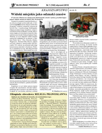 GŁOS ZNAD PREGOŁY Str. 5 Nr 1 (162) styczeń 2010 KRAJOZNAWSTWO (ze str. 4) Widoki miejskie jako odznaki czasów W muzeum Historyczno-Artystycznym Kaliningradu otwarto wystawę, przedstawiająca pejzaże małych miasteczek byłych Prus Wschodnich. Na pierwszym piętrze muzeum Historyczno-Artystycznego są dwie małe sale, w których od 4 grudnia można obejrzeć archiwalne fotografie widoków miejskich mias tecz ek byłych Prus i współczesnego Kaliningradu. Zdjęcia przedstawiające krajobrazy miejscowości byłych Prus pochodzą i zostały odtworzone z negatywów przechowywanych w zbiorach Instytutu Sztuki Polskiej Akademii Nauk. Widzimy na tych zdjęciach widoki miejskie miasteczek znajdujących się obecnie w składzie Polski. Są to – Pisz, Giżycko, Olecko, wojny, jako odłamki mitycznej Atlantydy. Na Węgorzewo, Ruciane-Nida, Reszel. Zdjęcia fotografiach tych utrwaleni są również ludzie owe były robione w okresie końca XIX-pominionej epoki, przez to sportretowana jest czątku XX stulecia na polecenie głównego kultura, sposób życia, znany dziś tylko z litekonserwatora zabytków w Królewcu. Widziratury, historii i przekazów ustnych, zarejestmy tu charakterystyczny dla całej prowincji rowane przemiany warunków życia w końcu styl architektoniczny. M ałe domki kryte daXIX stulecia na terenie Prus Wschodnich. Zaś w przy ległej s ali są eks ponow ane z djęcia fotografa z Warszawy Janusza Pileckiego – migawki z wycieczki ulicami współczesnego Kaliningradu. W dniu otwarcia, 4 grudnia, wystawa «Fotograf przyjechał» wywołała spore zainteresowanie, można tu było zauważyć znanych członków miejskiego Klubu Krajoznawców. Widzieli ekspozycje również członkowie kaliningradzkiej Polonii. Jarosław Andrukajtys (od prawej) opowiada o wystawie, z lewej strony krajoznawca Aleksiej Gubin, znawca sztuki Autorem pomysłu ekspoWalentyna Pokładowa. zycji jest Jarosław Andrukajtys z Giżycka. Opracowanie chówką ceramiczną, budynki instytucji publigraficzne wykonali Janusz i Katarzyna Pileccy. cznych, dworzec kolejowy, gmachy kościołów Swój udział w przygotowaniu wystawy archiluterańskich. walnych zdjęć ma również kaliningradz ki Krajobrazy te są w takim samym stopniu krajoznawca, pracownik muzeum «Brama swojskie dla mieszkańców obwodu kalininFrydlandzka» i członek miejscow ej Polonii gradzkiego, gdyż częściowo się zachowały bez Andriej Martyniuk. wz ględu na zaw ieruchę minionej wielkiej W. Wasiliew foto autora Olimpiada obwodowa RELIGIA PRAWOSŁAWNA Gdybym nie chodziła do kościoła, nie wiedziałabym tego. Zbliża s ię Boże Narodz enie. Wszy scy chrześcijanie i katolicy i prawosławni czekają na to święto. Szkoda tylko, że obchodzimy to święto nie razem, bo dzieli nas kalendarz. Prawosławni nie przyjęli kalendarza gregoriańskiego. W szkołach religii nam nie wykładają. Ale jak powiedział dziś nam ksiądz Aleksander św ieckie w ładz e p ostanowili wkrótce wprowadzić w szkołach lekcje religii. U nas w klasie ósmej większość uczniów to prawosławni. Tylko trzy osoby są katolikami: to wychowawczyni naszej klasy pani Helena Leszkowicz, mój jednoklasista Paweł Chochłow i ja, czego nie ukrywamy. Tydzień temu w naszej szkole przebiegała olimpiada na temat «Religia prawosławna». Wiedząc że prawosławie i katolicyzm to dwie gałęz i jednej religii zaryzykowałam w ziąć udział. Przygotowywaliśmy się razem z babcią. Przejrzeliśmy Ewangelię, Dzieje Apostolskie, albumy z obrazami Rublowa, Theophana Greka, Krymskiego. Przypomniałyśmy sobie święta ruchome i nieruchome. Dodając do dat naszych świąt 13 dni otrzymywałyśmy datę święta prawosławnego. I wyobraźcie sobie zajęłam 2 miejsce. Wysłano mnie na olimpiadę obwodową, która odbyła się 18 grudnia. Było dużo uczestników – powyżej stu. W swojej grupie 8-9 kl. zajęłam 4 miejsce. Gdybym nie chodziła do kościoła, to na pewno tego wszystkiego nie wiedziałabym. Zasyłam dla czytelników nasz ej gazety oraz dla redakcji poz drowienia z okaz ji Bożego Narodzenia i Nowego Roku. Janina Łapszyna Ozdoba dekoracyjna i ciasto „Mazurek” autorstwa Anny Kraśko Była to rolada w postaci smoka z nadzieniem grzybowym w środku. W tym dniu wszystkie panie zostały wyróż nione prz ez komisję, bo każda wpełni zasłużyła na to. Na przykład najmłodsza uczestniczka konkursu Anna Kraśko, mająca tylko 13 lat, zdaniem jury, zapowiada się na dobrą gospodynię, gdyż jej ciasto „M azurek” było naprawdę wyśmienite. Wśród dań konkursowych odnalazło się również pieczywo z serem, p rzy got owane prz ez panią M arię Wiedmiedierja, pieczywo z kapustą od pani Ireny Poliszczuk oraz dwa desery – galaretka z wiśniami od pani Janiny Gongało i deser makowy, który przyrz ądziła pani Ludmiła Łysakowska. Konkurs Święto „Gospodyni domowa”, zdaniem organizatorów, uczestników i gości, ma szansę na stałe wp isać się w kalendarz imp rez p olonijnych Obwodu Kaliningradzkiego. Polonia jest swoistą rodziną, a to jest miejsce, które kojarzy się nam z radością i beztroską, miejsce którego charakter określają zarówno p rzedmiot y nas otaczające, jak również osoby, które w nim przebywają, stąd też wywodzi się chęć zjednoczenia Polaków naszego regionu. Padła też propozycja, aby w następnym roku w tym konkursie spróbowali swoich sił mężczyźni, przecież nie tylko kobiety prowadzą gospodarstwo domowe. Wtedy będziemy mogli wybrać najlepszego gospodarza. To co, Drodzy Panowie, możemy liczyć na Wasz udział w przyszłym roku? Podsumowując można powiedzieć, że wszyst kie panie świetnie s ię sprawdz iły i udowodniły obecnym, że są prawdziwymi kobietami. A kto to jest kobieta? W literaturze pięknej przedstawiana jest jako żona, dama, opiekunka ogniska domowego, muza. Ponadto jest symbolem macierzyństwa, płodności, i, oczywiście, miłości oraz piękna. Czy łatwo dzisiaj być pi