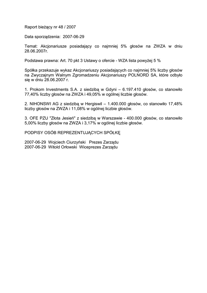 Raport bieŜący nr 48 / 2007 Data sporządzenia: 2007-06-29 Temat: Akcjonariusze posiadający co najmniej 5% głosów na ZWZA w dniu 28.06.2007r. Podstawa prawna: Art. 70 pkt 3 Ustawy o ofercie - WZA lista powyŜej 5 % Spółka przekazuje wykaz Akcjonariuszy posiadających co najmniej 5% liczby głosów na Zwyczajnym Walnym Zgromadzeniu Akcjonariuszy POLNORD SA, które odbyło się w dniu 28.06.2007 r. 1. Prokom Investments S.A. z siedzibą w Gdyni – 6.197.410 głosów, co stanowiło 77,40% liczby głosów na ZWZA i 49,05% w ogólnej liczbie głosów. 2. NIHONSWI AG z siedzibą w Hergiswil – 1.400.000 głosów, co stanowiło 17,48% liczby głosów na ZWZA i 11,08% w ogólnej liczbie głosów. 3. OFE PZU "Złota Jesień" z siedzibą w Warszawie - 400.000 głosów, co stanowiło 5,00% liczby głosów na ZWZA i 3,17% w ogólnej liczbie głosów. PODPISY OSÓB REPREZENTUJĄCYCH SPÓŁKĘ 2007-06-29 Wojciech Ciurzyński Prezes Zarządu 2007-06-29 Witold Orłowski Wiceprezes Zarządu