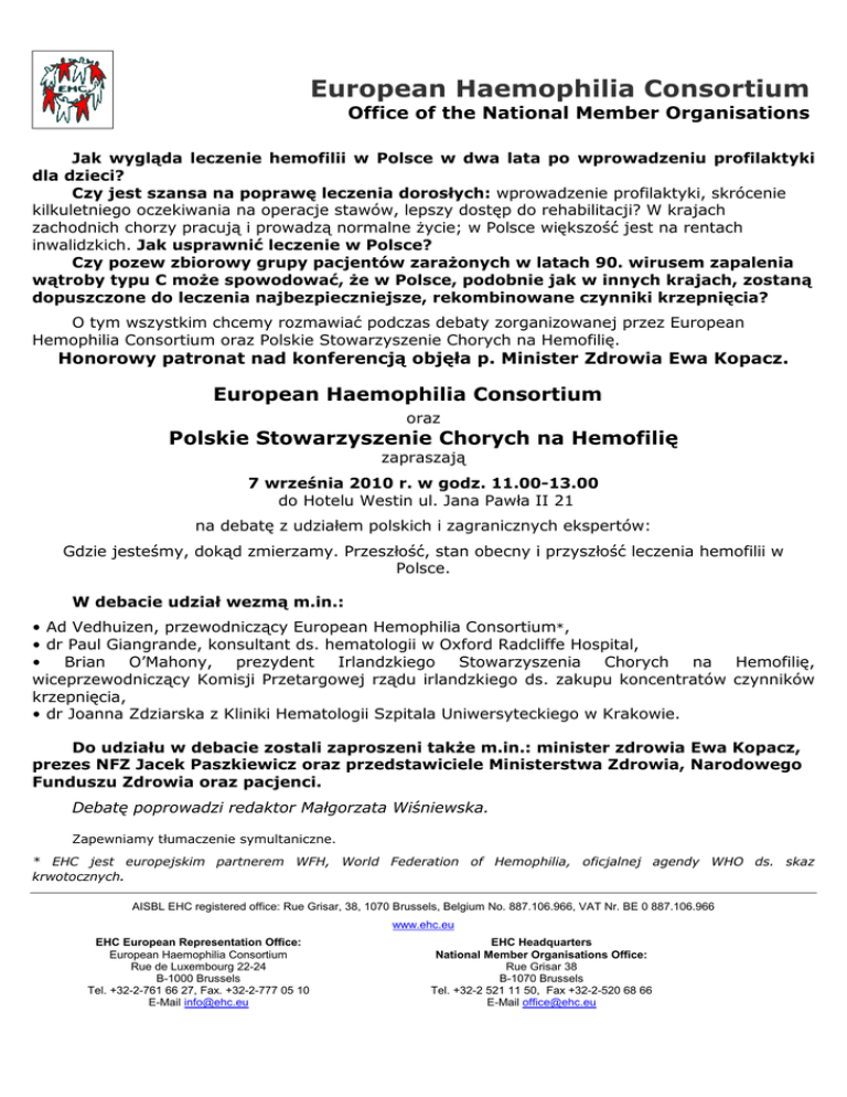 European Haemophilia Consortium Office of the National Member Organisations Jak wygląda leczenie hemofilii w Polsce w dwa lata po wprowadzeniu profilaktyki dla dzieci? Czy jest szansa na poprawę leczenia dorosłych: wprowadzenie profilaktyki, skrócenie kilkuletniego oczekiwania na operacje stawów, lepszy dostęp do rehabilitacji? W krajach zachodnich chorzy pracują i prowadzą normalne życie; w Polsce większość jest na rentach inwalidzkich. Jak usprawnić leczenie w Polsce? Czy pozew zbiorowy grupy pacjentów zarażonych w latach 90. wirusem zapalenia wątroby typu C może spowodować, że w Polsce, podobnie jak w innych krajach, zostaną dopuszczone do leczenia najbezpieczniejsze, rekombinowane czynniki krzepnięcia? O tym wszystkim chcemy rozmawiać podczas debaty zorganizowanej przez European Hemophilia Consortium oraz Polskie Stowarzyszenie Chorych na Hemofilię. Honorowy patronat nad konferencją objęła p. Minister Zdrowia Ewa Kopacz. European Haemophilia Consortium oraz Polskie Stowarzyszenie Chorych na Hemofilię zapraszają 7 września 2010 r. w godz. 11.00-13.00 do Hotelu Westin ul. Jana Pawła II 21 na debatę z udziałem polskich i zagranicznych ekspertów: Gdzie jesteśmy, dokąd zmierzamy. Przeszłość, stan obecny i przyszłość leczenia hemofilii w Polsce. W debacie udział wezmą m.in.: • Ad Vedhuizen, przewodniczący European Hemophilia Consortium*, • dr Paul Giangrande, konsultant ds. hematologii w Oxford Radcliffe Hospital, • Brian O’Mahony, prezydent Irlandzkiego Stowarzyszenia Chorych na Hemofilię, wiceprzewodniczący Komisji Przetargowej rządu irlandzkiego ds. zakupu koncentratów czynników krzepnięcia, • dr Joanna Zdziarska z Kliniki Hematologii Szpitala Uniwersyteckiego w Krakowie. Do udziału w debacie zostali zaproszeni także m.in.: minister zdrowia Ewa Kopacz, prezes NFZ Jacek Paszkiewicz oraz przedstawiciele Ministerstwa Zdrowia, Narodowego Funduszu Zdrowia oraz pacjenci. Debatę poprowadzi redaktor Małgorzata Wiśniewska. Zapewniamy tłumaczenie symultaniczne. * EHC jest europejskim partnerem WFH, World Federation of Hemophilia, oficjalnej agendy WHO ds. skaz krwotocznych. AISBL EHC registered office: Rue Grisar, 38, 1070 Brussels, Belgium No. 887.106.966, VAT Nr. BE 0 887.106.966 www.ehc.eu EHC European Representation Office: European Haemophilia Consortium Rue de Luxembourg 22-24 B-1000 Brussels Tel. +32-2-761 66 27, Fax. +32-2-777 05 10 E-Mail [email protected] EHC Headquarters National Member Organisations Office: Rue Grisar 38 B-1070 Brussels Tel. +32-2 521 11 50, Fax +32-2-520 68 66 E-Mail [email protected]
