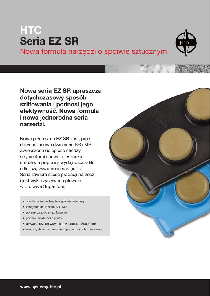 HTC Seria EZ SR Nowa formuła narzędzi o spoiwie sztucznym Nowa seria EZ SR upraszcza dotychczasowy sposób szlifowania i podnosi jego efektywność. Nowa formuła i nowa jednorodna seria narzędzi. Nowa pełna seria EZ SR zastępuje dotychczasowe dwie serie SR i MR. Zwiększona odległość między segmentami i nowa mieszanka umożliwia poprawę wydajności szlifu i dłuższą żywotność narzędzia. Seria zawiera sześć gradacji narzędzi i jest wykorzystywana głównie w procesie Superfloor. • oparta na narzędziach o spoiwie sztucznym • zastępuje stare serie SR i MR • upraszcza proces szlifowania • podnosi wydajność pracy • używana przede wszystkim w procesie Superfloor • wykorzystywana zarówno w pracy na sucho i na mokro www.systemy-htc.pl Seria EZ SR Seria EZ SR Nazwa Nr katalogowy Opis EZ SR 3 Szary 212360 Nadaje się do szlifowania zgrubnego wszystkich rodzajów betonu, lastryko, wylewek samopoziomujących i kamieni naturalnych. Narzędzia o wysokiej zdolności usuwania warstwy wierzchniej. EZ SR 4 Brązowy 212361 Nadaje się do szlifowania zgrubnego wszystkich rodzajów betonu, lastryko, wylewek samopoziomujących i kamieni naturalnych. Narzędzia o wysokiej zdolności usuwania warstwy wierzchniej. EZ SR 5 Czarny 212362 Nadaje się do szlifowania zgrubnego wszystkich rodzajów betonu, lastryko, wylewek samopoziomujących i kamieni naturalnych. Narzędzie do usuwania rys z poprzednich kroków szlifowania, po zostawia wyrównaną powierzchnię. EZ SR 6 Niebieski 212363 Narzędzie stosowane jako kolejny krok po narzędziu EZ SR Czarny. Pozostawia gładką powierzchnię. EZ SR 7 Czerwony 212364 Narzędzie stosowane jako kolejny krok po narzędziu EZ SR Niebieski. Pozostawia bardzo gładką powierzchnię. EZ SR 8 Biały 212365 Narzędzie stosowane jako kolejny krok po narzędziu EZ SR Czerwony. Pozostawia bardzo gładką powierzchnię. EZchange - szybki i prosty system wymiany narzędzi EZchange™ - system szybkiej zmiany narzędzi, który pozwala raz na zawsze zapomnieć o zapieczonych, zardzewiałych i uszkodzonych śrubach, a nawet obejść się zupełnie bez śrub. Wystarczy umieścić narzędzie w odpowiednim miejscu na uchwycie uderzając w nie lekko gumowym młotkiem, aby móc szlifować, polerować czy usuwać powłoki betonowe. 1 WYŁĄCZNY DYSTRYBUTOR MASZYN I NARZĘDZIE HTC W POLSCE HAKO POLSKA Sp. z o.o. 30-392 Kraków, ul. Czerwone Maki 63 Dział Obsługi Klienta: tel.: +48 12 622 17 00; fax: +48 12 622 16 22 [email protected] www.hako.pl www.systemy-htc.pl www.systemy-htc.pl 2 3