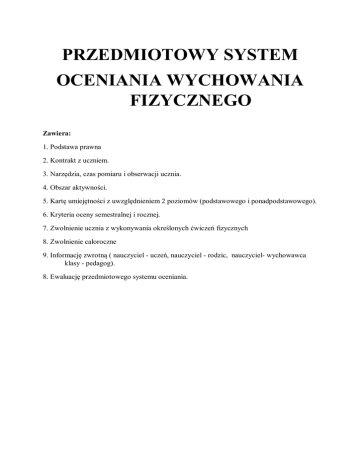PRZEDMIOTOWY SYSTEM OCENIANIA WYCHOWANIA FIZYCZNEGO Zawiera: 1. Podstawa prawna 2. Kontrakt z uczniem. 3. Narzędzia, czas pomiaru i obserwacji ucznia. 4. Obszar aktywności. 5. Kartę umiejętności z uwzględnieniem 2 poziomów (podstawowego i ponadpodstawowego). 6. Kryteria oceny semestralnej i rocznej. 7. Zwolnienie ucznia z wykonywania określonych ćwiczeń fizycznych 8. Zwolnienie całoroczne 9. Informację zwrotną ( nauczyciel - uczeń, nauczyciel - rodzic, nauczyciel- wychowawca klasy - pedagog). 8. Ewaluację przedmiotowego systemu oceniania. PODSTAWA PRAWNA 1. Rozporządzenie w sprawie zasad oceniania, klasyfikacji i promowania uczniów i słuchaczy oraz przeprowadzania egzaminów i sprawdzianów w szkołach publicznych.; tekst jednolity z 1999r. (Dz. U. nr 41, poz. 413 ze zmianami), z 2001 r. (Dz. U. nr 29, poz. 323 ze zmianami), z 2004 r. (Dz. U. nr 199, poz. 2046 ze zmianami), 2007 r. (Dz. U. nr 83, poz. 562 ze zmianami). 2. Rozporządzenie w sprawie szczegółowych warunków i sposobu oceniania, klasyfikowania i promowania uczniów i słuchaczy w szkołach publicznych z dnia 10 czerwca 2015 r. Przedmiotowy system oceniania z przyrody jest zgodny ze Szkolnym Systemem Oceniania w Szkole Podstawowej nr 54 w Poznaniu. KONTRAKT Na pierwszej lekcji organizacyjnej w roku szkolnym uczniowie razem z nauczycielem ustalają punkty kontraktu, który będzie obowiązywał podczas lekcji wychowania fizycznego. Zajęcia z wychowania fizycznego służą uczniowi rozwojowi jego cech psychomotorycznych, dbałości o swoje ciało, bezpieczeństwo swoje i współćwiczących oraz uczy najważniejszych z zasad gry fair play. Kontrakt zawiera następujące punkty: 1. Kryteria oceniania z wychowania fizycznego zamieszczone są w Ogólnych Kryteriach Oceniania z wychowania fizycznego, który to punkt znajduje się w Przedmiotowym Systemie Oceniania zamieszczony na stronie internetowej placówki. Uczeń jest zobligowany do zapoznania się z PSO. 2. Każdy uczeń jest oceniany zgodnie z zasadami sprawiedliwości. 3. Każdy uczeń powinien posiadać strój sportowy przeznaczony na lekcję wychowania fizycznego. Przez strój sportowy rozumie się: obuwie zmienne, koszulkę w kolorze uzgodnionym z nauczycielem na początku roku szkolnego, spodenki lub spodnie dresowe. 4. Na lekcji wychowania fizycznego Uczeń zobowiązany jest do ćwiczenia bez biżuterii. Włosy nie mogą przeszkadzać uczniom w lekcji, dlatego zawsze są związane lub zaplecione. 5. Uczeń może być w ciągu semestru 3 razy nieprzygotowany do lekcji bez konieczności przedstawienia usprawiedliwienia; w razie czwartego nieprzygotowania otrzymuje ocenę niedostateczną i każdorazowo w razie następnych przypadków, która obniża mu ocenę końcową o jeden stopień od średniej oceny poprzedzającej to zdarzenie. 6. Uczeń chcący ćwiczyć w okularach musi przedstawić pisemną zgodę lekarza. 7. W przypadku usprawiedliwionej nieobecności, uczeń jest zobowiązany do uzupełnienia sprawdzianu po uprzednim przećwiczeniu i uzgodnieniu z nauczycielem terminu nie przekraczającego 2 tygodni od powrotu do szkoły lub w innym terminie wskazanym przez Nauczyciela. O terminie decyduje Nauczyciel. 8. Uczeń, aby uzyskać ocenę śródroczną, roczna (klasy 1-5), końcową (klasy 6) musi zdobyć min. 4 oceny cząstkowe przynajmniej z trzech działów programu. 12. Uczeń ma prawo do poprawy każdej oceny w czasie wyznaczonym do tego celu przez Nauczyciela (np. dodatkowe zajęcia sportowe). 9. Stosuje się oceny pełne, dopuszcza się stosowanie znaku „+” przy ocenie. Oceny bieżące są w dzienniku elektronicznym i dzienniczku ucznia na jego prośbę. W dzienniczku uczeń samodzielnie wpisuje ocenę, Nauczyciel potwierdza podpisem. 10. W przypadku opuszczenia połowy zajęć w semestrze uczeń jest nieklasyfikowany. 11. Uczeń reprezentujący szkołę w zawodach sportowych, wewnątrz szkolnych i poza szkolnych ma prawo do dodatkowej oceny. O ocenie decyduje Nauczyciel. 12. Ocena śródroczna, roczna (klasy 1-5), końcowa (klasy 6) nie jest wypadkową wszystkich ocen cząstkowych!!! A zaangażowaniem w ciągu całego semestru i wkładu pracy, zachowania, które oceniane jest przez nauczyciela w-f. 13. Przed śródrocznym, rocznym (klasy 1-5), końcowym (klasy 6) posiedzeniem rady pedagogicznej nauczyciel informuje uczniów o przewidzianej ocenie z przedmiotu. Imię i nazwisko oraz podpis rodzica Nauczyciel w-f NARZĘDZIA, CZAS PRACY I OBSERWACJI UCZNIÓW Pomiar osiągnięć uczniów odbywa się za pomocą następujących narzędzi: 1. Sprawdzian z ćwiczeń ruchowych 2. Test wiadomości 3. Aktywność na lekcji 4. Przygotowanie do lekcji 5. Uczestnictwo w zajęciach sportowych Kryteria sprawdzania różnych form aktywności uczniów na lekcji: 1. Podczas sprawdzianu z ćwiczeń ruchowych brane są pod uwagę: -postawa przy wykonaniu ćwiczenia -zachowanie wszystkich elementów ćwiczenia -prawidłowe nazewnictwo -samokontrola i samoocena 2. Podczas testu wiadomości brane są pod uwagę: -znajomość zadanego tematu -znajomość przepisów z gier zespołowych -umiejętność zaznaczenia prawidłowej odpowiedzi 3. Podczas oceny aktywności na lekcji brane są pod uwagę: -zaangażowanie na lekcji -aktywny udział w grze -przygotowanie do lekcji -wzajemne poszanowanie -stosowanie zasad higieny 4. Podczas przygotowania do lekcji brane są pod uwagę: -odpowiedni strój sportowy -brak biżuterii, związane/splecione włosy 5. Podczas udziału w zawodach sportowych: -reprezentowanie klasy szkoły na zawodach sportowych wewnątrz szkolnych i poza szkolnych FORMY AKTYWNOŚCI Sprawdziany z ćwiczeń fizycznych Testy wiadomości Aktywność na lekcji Przygotowanie na lekcji CZĘSTOTLIWOŚĆ W SEMESTRZE Min 4 Max 2 Na bieżąco Na bieżąco OBSZARY AKTYWNOŚCI Na lekcji wychowania fizycznego ocenia się następujące obszary aktywności: 1. Zastosowanie przepisów z gier w odpowiedniej grze. 2. Samokontrola i samoocena. 3. Aktywność na lekcja