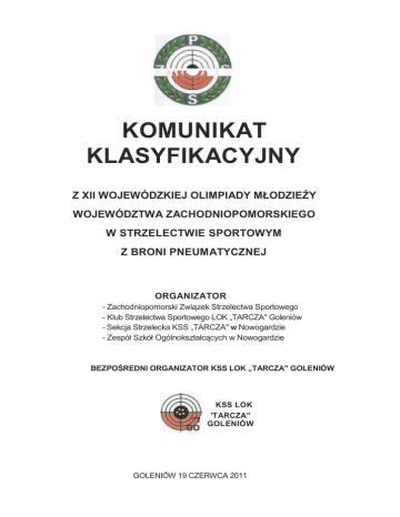 KOMUNIKAT KLASYFIKACYJNY Z XII WOJEWÓDZKIEJ OLIMPIADY MŁODZIEŻY WOJEWÓDZTWA ZACHODNIOPOMORSKIEGO W STRZELECTWIE SPORTOWYM Z BRONI PNEUMATYCZNEJ ORGANIZATOR - Zachodniopomorski Związek Strzelectwa Sportowego - Klub Strzelectwa Sportowego LOK „TARCZA" Goleniów - Sekcja Strzelecka KSS „TARCZA" w Nowogardzie - Zespół Szkół Ogólnokształcących w Nowogardzie BEZPOŚREDNI ORGANIZATOR KSS LOK „TARCZA" GOLENIÓW KSS LOK 'TARCZA" GOLENIÓW GOLENIÓW 19 CZERWCA 2011 OBSADA SĘDZIOWSKA l ZABEZPIECZENIE ZAWODÓW FUNKCJA NA ZAWODACH IMIĘ l NAZWISKO Kierownik zawodów Stanisław Pietrzycki Sędzia Główny zawodów Michał Buniak P Przewodniczący Komisji Klasyfikacyjnej Kazimierz Milewski II Sędzia Główny na 10 m Zbigniew Masełek I Sędziowie stanowiskowi: Inga Szymańska III Kandydaci na sędziów: Sławomir Kucaj Mariusz Skibiszewski Radosław Krewicki Obsługa techniczna Stanisław Pietrzycki KOMUNIKAT KLASYFIKACYJNY ZAWIERA: 6 PROTOKOŁÓW + KLASYFIKACJE KLUBOWA Protokół nr 1 Protokół nr 2 Protokół nr 3 Protokół nr 4 Protokół nr 5 Protokół nr 6 Kpn 40 juniorzy młodsi Ppn 40 juniorzy młodsi Kpn 30 młodzicy Ppn 30 młodzicy Ppn 20 z podpórki młodzicy Kpn 20 z podpórki młodzicy Zawody przeprowadzono zgodnie z Regulaminem Zawodów Protestów nie wnoszono. KLASA PROTOKÓŁ NR 1 Karabin pneumatyczny 40 strzałów juniorzy młodsi 1. Michał Szarek 96 99 89 95 379 x9 2. 93 96 89 91 91 92 90 93 367 x13 -2 366 x6 90 92 93 90 365 x5 83 83 84 80 330 x1 74 81 86 81 322 x1 85 80 75 67 307 x3 83 70 79 72 304 x0 65 65 62 68 260 x0 3. 4. 5. 6. 7. 8. 9. TARCZA Goleniów LO Nowogard Marcin Majka TARCZA Goleniów G-1 Goleniów Wojciech Bartosik TARCZA Goleniów G-2 Nowogard Jakub Cieplak TARCZA Goleniów G-2 Nowogard Piotr Sykutera IMPULS Szczecinek G-3 Szczecinek Marta Wojnarowska KS Kołobrzeg G-3 Kołobrzeg Aleksandra Siwek KS Kołobrzeg LO-2 Kołobrzeg Patryk Iwaszkiewicz IMPULS Szczecinek G-2 Szczecinek Patryk Rogoziński IMPULS Szczecinek Przewodniczący Kom. Klasyfikacyjnej Kazimierz Milewski PROTOKÓŁ NR 2 Pistolet pneumatyczny 40 strzałów juniorzy młodsi 1. Miłosz Olejnik 93 89 90 90 362 x3 2. 87 89 87 81 344 x3 82 85 89 86 342 x1 68 81 78 70 297 x4 68 73 68 65 274 61 71 66 70 268 3. 4. 5. 6. TARCZA Goleniów LO Nowogard Kacper Gorgoń KS Kołobrzeg ZSM Kołobrzeg Piotr Glądała TARCZA Goleniów ZSZ Goleniów Dorota Małkińska KS Kołobrzeg G-3 Kołobrzeg Kamil Melnik IMPULS Szczecinek G-2 Szczecinek Joanna Markiewicz KS Kołobrzeg LO-2 Kołobrzeg Przewodniczący Kom. Klasyfikacyjnej Kazimierz Milewski PROTOKÓŁ NE 3 Karabin pneumatyczny 30 strzałów młodzicy 1. Krzysztof Kita KS Kołobrzeg G-2 Kołobrzeg 2. Krzysztof Jeżewski KS Kołobrzeg G-2 Kołobrzeg 3. Rafał Szałkiewicz TARCZA Goleniów G-2 Nowogard 4. Przemysław Ostaszewski TARCZA Goleniów G-2 Nowogard 94 83 94 271 x4 90 83 88 261 x2 84 85 74 243 x1 76 80 74 230 x2 Przewodniczący Kom. Klasyfikacyjnej Kazimierz Milewski PROTOKÓŁ NR 4 Pistolet pneumatyczny 30 strzałów młodzicy 1. Marcin Michlewicz 2. Konrad Sulżycki KS Kołobrzeg G-2 Kołobrzeg KS Kołobrzeg Kołobrzeg 78 91 79 248 80 82 85 247 Przewodniczący Kom. Klasyfikacyjnej Kazimierz Milewski PROTOKÓŁ NR 5 Pistolet pneumatyczny 20 strzałów z podpórki młodzicy 1. Konrad Sulżycki 2. Marcin Michlewicz 3. Mateusz Szarek KS Kołobrzeg G—3 KS Kołobrzeg G—2 TARCZA Goleniów SP-2 Nowogard 89 90 90 88 71 83 179 176 154 x3 -2 x1 PROTOKÓŁ NR 6 Karabin pneumatyczny 20 strzałów z podpórki młodzicy 1. Krzysztof Jeżewski KS Kołobrzeg G-2 88 88 176 2. Damian Krawczyk TARCZA Goleniów G-2 Nowogard KS Kołobrzeg G-2 78 89 167 x1 75 90 165 TARCZA Goleniów G-2 Nowogard TARCZA Goleniów G-2 Nowogard Tarcza Goleniów G-2 Nowogard TARCZA Goleniów G-2 Nowogard TARCZA Goleniów G-2 Nowogard TARCZA Goleniów G-2 Nowogard TARCZA Goleniów G-2 Nowogard TARCZA Goleniów G-2 Nowogard TARCZA Goleniów G-2 Nowogard TARCZA Goleniów G-2 Nowogard 80 80 160 80 78 158 70 72 142 75 66 141 58 78 136 75 59 134 61 59 120 42 71 113 54 48 102 40 29 69 3. Krzysztof Kita 4. Hubert Konopiński 5. Hanna Teodorczyk 6. Marcel Banach 7. Przemek Ostaszewski 8. Tomasz Świolerski 9. Rafał Szełkiewicz 10. Mateusz Szadkowski 11. Aleksandra Olejnik 12. Radosław Miśków 13. Maja Podstawka Przewodniczący Kom. Klasyfikacyjnej Kazimierz Milewski Komunikat zawiera 6 protokółów Protestów nie było SĘDZIA GŁÓWNY Michał Buniak K L A S Y F I K A C J A K L U B Ó W Nazwa klubu S P O R T O W Y C H Juniorzy mł. Młodzicy Razem Kpn-40 Ppn-40 Kpn-30 Kpn-20 Ppn-30 Ppn-20 1 Klub Strzelecki Kołobrzeg 2 KSS „TARCZA” Goleniów KS „IMPULS” 3 Szczecinek 5 14 12 11 12 12 66 25 14 7 14 - 4 64 5 3 - - - - 8