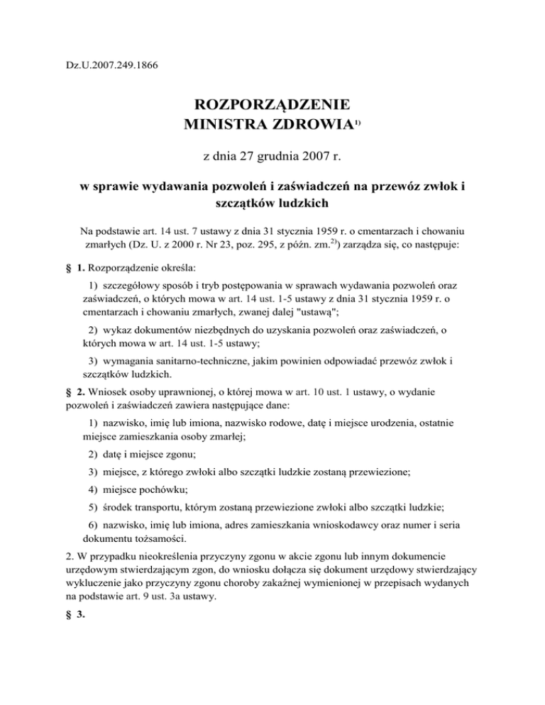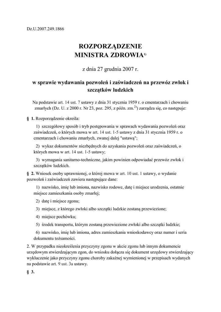 Dz.U.2007.249.1866 ROZPORZĄDZENIE MINISTRA ZDROWIA1) z dnia 27 grudnia 2007 r. w sprawie wydawania pozwoleń i zaświadczeń na przewóz zwłok i szczątków ludzkich Na podstawie art. 14 ust. 7 ustawy z dnia 31 stycznia 1959 r. o cmentarzach i chowaniu zmarłych (Dz. U. z 2000 r. Nr 23, poz. 295, z późn. zm.2)) zarządza się, co następuje: § 1. Rozporządzenie określa: 1) szczegółowy sposób i tryb postępowania w sprawach wydawania pozwoleń oraz zaświadczeń, o których mowa w art. 14 ust. 1-5 ustawy z dnia 31 stycznia 1959 r. o cmentarzach i chowaniu zmarłych, zwanej dalej "ustawą"; 2) wykaz dokumentów niezbędnych do uzyskania pozwoleń oraz zaświadczeń, o których mowa w art. 14 ust. 1-5 ustawy; 3) wymagania sanitarno-techniczne, jakim powinien odpowiadać przewóz zwłok i szczątków ludzkich. § 2. Wniosek osoby uprawnionej, o której mowa w art. 10 ust. 1 ustawy, o wydanie pozwoleń i zaświadczeń zawiera następujące dane: 1) nazwisko, imię lub imiona, nazwisko rodowe, datę i miejsce urodzenia, ostatnie miejsce zamieszkania osoby zmarłej; 2) datę i miejsce zgonu; 3) miejsce, z którego zwłoki albo szczątki ludzkie zostaną przewiezione; 4) miejsce pochówku; 5) środek transportu, którym zostaną przewiezione zwłoki albo szczątki ludzkie; 6) nazwisko, imię lub imiona, adres zamieszkania wnioskodawcy oraz numer i seria dokumentu tożsamości. 2. W przypadku nieokreślenia przyczyny zgonu w akcie zgonu lub innym dokumencie urzędowym stwierdzającym zgon, do wniosku dołącza się dokument urzędowy stwierdzający wykluczenie jako przyczyny zgonu choroby zakaźnej wymienionej w przepisach wydanych na podstawie art. 9 ust. 3a ustawy. § 3. 1. Do wniosku o wydanie pozwolenia na wywóz zwłok albo szczątków ludzkich z terytorium Rzeczypospolitej Polskiej dołącza się: 1) wymagane dokumenty właściwej władzy państwa, na którego terytorium zwłoki albo szczątki ludzkie mają być pochowane; 2) wymagane dokumenty właściwej władzy państwa, przez którego terytorium zwłoki albo szczątki ludzkie mają być przewożone. 2. Do wniosku o wydanie zaświadczenia, o którym mowa w art. 14 ust. 3 ustawy, dołącza się: 1) dokument wydany przez właściwą władzę państwa, na którego terytorium zwłoki albo szczątki ludzkie mają być pochowane; 2) akt zgonu lub inny dokument urzędowy stwierdzający zgon; 3) dokument wydany przez właściwą władzę państwa, przez którego terytorium zwłoki albo szczątki ludzkie mają być przewożone. 3. Do wniosku o wydanie zaświadczenia, o którym mowa w art. 14 ust. 4 pkt 2 ustawy, dołącza się: 1) pozwolenie wydane przez właściwego starostę; 2) akt zgonu lub inny dokument urzędowy stwierdzający zgon. § 4. 1. Środek transportu drogowego przeznaczony do przewozu zwłok i szczątków ludzkich powinien spełniać następujące wymagania techniczne i sanitarne: 1) być trwale oznakowany w sposób wskazujący na jego przeznaczenie; 2) posiadać kabinę kierowcy odizolowaną od części przeznaczonej na umieszczenie zwłok albo szczątków ludzkich; 3) posiadać zabezpieczenie przed przesuwaniem się trumny lub pojemnika na zwłoki albo szczątki ludzkie podczas przewozu; 4) posiadać podłogę w części przeznaczonej na umieszczenie trumny lub pojemnika na zwłoki albo szczątki ludzkie wykonywaną z materiałów łatwo zmywalnych i odpornych na działanie środków dezynfekujących; 5) posiadać wydzielone miejsce na przechowywanie środków dezynfekcyjnych, sprzętu myjąco-czyszczącego oraz jednorazowych rękawic ochronnych. 2. Nie dopuszcza się montażu miejsc siedzących w części przeznaczonej na umieszczenie zwłok albo szczątków ludzkich. 3. Po każdorazowym przewiezieniu zwłok albo szczątków ludzkich przeprowadza się dezynfekcję środka transportu w części przeznaczonej na ich umieszczenie. 4. Do dezynfekcji stosuje się preparaty o działaniu bakteriobójczym, wirusobójczym i grzybobójczym. 5. Zabrania się zewnętrznego mycia środka transportu drogowego przeznaczonego do przewozu zwłok i szczątków ludzkich w miejscach przypadkowych i prowizorycznie zorganizowanych myjniach. 6. Środek transportu drogowego powinien być zarejestrowany jako pojazd specjalny zgodnie z przepisami o ruchu drogowym. 7. Przepisy ust. 1 pkt 3 i 4 oraz ust. 2-4 stosuje się odpowiednio do środków transportu kolejowego, lotniczego i wodnego. § 5. Przepisów § 4 nie stosuje się do przewozu zwłok albo szczątków ludzkich środkami transportu Sił Zbrojnych Rzeczypospolitej Polskiej. § 6. 1. Przepisy rozporządzenia dotyczące wydawania pozwoleń i zaświadczeń na przewóz zwłok i szczątków ludzkich stosuje się odpowiednio do wydawania pozwoleń i zaświadczeń na przewóz szczątków powstałych ze spopielenia zwłok. 2. Przewóz szczątków powstałych ze spopielenia zwłok, umieszczonych w szczelnym, odpornym na uszkodzenia pojemniku może odbywać się dowolnym środkiem transportu, w sposób zapewniający ich poszanowanie. § 7. Rozporządzenie wchodzi w życie z dniem 2 stycznia 2008 r.3) ______ 1) Minister Zdrowia kieruje działem administracji rządowej - zdrowie, na podstawie § 1 ust. 2 rozporządzenia Prezesa Rady Ministrów z dnia 16 listopada 2007 r. w sprawie szczegółowego zakresu działania Ministra Zdrowia (Dz. U. Nr 216, poz. 1607). 2) Zmiany tekstu jednolitego wymienionej ustawy zostały ogłoszone w Dz. U. z 2000 r. Nr 120, poz. 1268, z 2002 r. Nr 113, poz. 984, z 2003 r. Nr 80, poz. 717 i Nr 162, poz. 1568 oraz z 2006 r. Nr 220, poz. 1600. 3) Niniejsze rozporządzenie było poprzedzone rozporządzeniem Ministra Zdrowia z dnia 23 lutego 2005 r. w sprawie wydawania zezwoleń na przewóz zwłok i szczątków ludzkich (Dz. U. Nr 38, poz. 362), które na mocy art. 44 ustawy z dnia 18 października 2006 r. o zmianie i uchyleniu niektórych upoważnień do wydawania aktów wykonawczych (Dz. U. Nr 220, poz. 1600) traci moc z dniem 2 stycznia 2008 r.