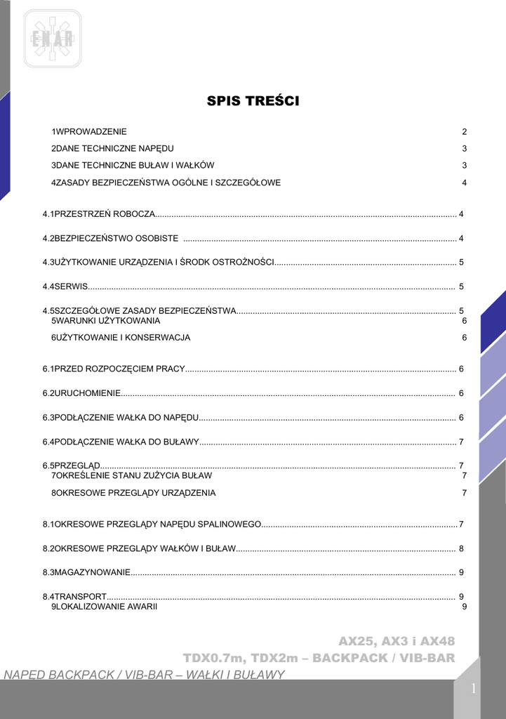 SPIS TREŚCI 1WPROWADZENIE 2 2DANE TECHNICZNE NAPĘDU 3 3DANE TECHNICZNE BUŁAW I WAŁKÓW 3 4ZASADY BEZPIECZEŃSTWA OGÓLNE I SZCZEGÓŁOWE 4 4.1PRZESTRZEŃ ROBOCZA................................................................................................................................. 4 4.2BEZPIECZEŃSTWO OSOBISTE ..................................................................................................................... 4 4.3UŻYTKOWANIE URZĄDZENIA I ŚRODK OSTROŻNOŚCI.............................................................................. 5 4.4SERWIS............................................................................................................................................................. 5 4.5SZCZEGÓŁOWE ZASADY BEZPIECZEŃSTWA.............................................................................................. 5 5WARUNKI UŻYTKOWANIA 6 pl 6UŻYTKOWANIE I KONSERWACJA 6 6.1PRZED ROZPOCZĘCIEM PRACY.................................................................................................................... 6 6.2URUCHOMIENIE............................................................................................................................................... 6 6.3PODŁĄCZENIE WAŁKA DO NAPĘDU.............................................................................................................. 6 6.4PODŁĄCZENIE WAŁKA DO BUŁAWY.............................................................................................................. 7 6.5PRZEGLĄD........................................................................................................................................................ 7 7OKREŚLENIE STANU ZUŻYCIA BUŁAW 7 8OKRESOWE PRZEGLĄDY URZĄDZENIA 7 8.1OKRESOWE PRZEGLĄDY NAPĘDU SPALINOWEGO.................................................................................... 7 8.2OKRESOWE PRZEGLĄDY WAŁKÓW I BUŁAW.............................................................................................. 8 8.3MAGAZYNOWANIE........................................................................................................................................... 9 8.4TRANSPORT..................................................................................................................................................... 9 9LOKALIZOWANIE AWARII 9 AX25, AX3 i AX48 TDX0.7m, TDX2m – BACKPACK / VIB-BAR NAPĘD BACKPACK / VIB-BAR – WAŁKI I BUŁAWY 1 9.1LOKALIZOWANIE AWARII NAPĘDU................................................................................................................ 9 PROBLEM............................................................................................................................................................... 9 PRZYCZYNA/ROZWIĄZANIE................................................................................................................................. 9 9.2LOKALIZOWANIE AWARII WAŁKÓW I BUŁAW............................................................................................... 9 10INSTRUKCJE DOTYCZĄCE ZAMAWIANIA CZĘŚCI ZAMIENNYCH 10 10.1INSTRUKCJE DOTYCZĄCE ZAMAWIANIA CZĘŚCI ZAMIENNYCH........................................................... 10 10.2INSTRUKCJE DOTYCZĄCE UBIEGANIA SIĘ O GWARANCJĘ................................................................... 10 11RECOMENDACIONES DE USO 11 1 pl 2 WPROWADZENIE Dziękujemy za zaufanie, jakim obdarzyliście Państwo markę ENAR Dla uzyskania maksymalnych korzyści z używania naszego sprzętu do wibrowania zalecamy zapoznanie się i zrozumienie norm bezpieczeństwa, użytkowania i obsługi zebranych w poniższej instrukcji. Aby zapobiec większym problemom, należy natychmiast wymieniać niesprawne części. Przy dokładnym przestrzeganiu wskazań instrukcji żywotność urządzenia zwiększy się. W razie jakichkolwiek komentarzy lub sugestii w sprawie naszych urządzeń, jesteśmy do Państwa pełnej dyspozycji. NAPĘD BACKPACK / VIB-BAR – WAŁKI I BUŁAWY AX25, AX38, AX48 TDX0.7m, TDX2m – BACKPACK / VIB-BAR 2 DANE TECHNICZNE NAPĘDU MODEL HONDA GX-35 BACKPACK VIB-BAR TYP PARAMETRY GAŹNIK ZAPŁON STARTER PALIWO ZBIORNIK PALIWA WAGA 4 SUW 35,8 CC 1,6 KM 7000 OBR/MIN MEMBRANOWY ISKROWNIK CIĘGNO NA LINCE BENZYNA 700 CC 3,33 KG (BEZ SPRZĘGŁA) pl PRĘDKOŚĆ ............................................................................... 9.000 - 10.000 OBR/MIN WAGA.......................................................................................... 7 KG (BACKPACK) 6 KG (VIB-BAR) ZASTOSOWANIE ........................................................................Przenoszenie obrotów na wibrator pogrążalny przy pomocy linki w pancerzu SPOSÓB PODŁĄCZENIA DO LINKI........................................... CZWOROKĄTNE ŻEŃSKIE 7 SPOSÓB PODŁĄCZENIA DO WAŁKA .................................... GWINT LEWY M36X2 3 DANE TECHNICZNE BUŁAW I WAŁKÓW ZASTOSOWANIE: Wałek poprzez podłączenie do napędu przenosi obroty na mimośród znajdujący się wewnątrz buławy, który obracając się wytwarza wibracje niezbędne dla zagęszczenia mieszanki betonowej. DANE TECHNICZNE BUŁAW AX 25 ŚREDNICA (mm) 25 DŁUGOŚĆ (mm) 300 WAGA (Kg) 1, 580 SIŁA ODŚRODKOWA (Kg) 90 CZĘSTOTLIWOŚĆ (OBR/MIN) 14.000 WYDAJNOŚĆ (m³/h) DO 10 AX 38 38 345 1, 900 410 13.500 DO 15 AX 48 48 370 3, 600 550 12.500 DO 25 MODEL AX25, AX3 i AX48 TDX0.7m, TDX2m – BACKPACK / VIB-BAR NAPĘD BACKPACK / VIB-BAR – WAŁKI I BUŁAWY 3 CZĘSTOTLIWOŚĆ WIBRACJI W ZALEŻNOŚCI OD KONFIGURACJI WAŁKA I BUŁAWY MODEL DŁUGOŚĆ (m) WAGA (Kg) AX 25 AX 38 AX 48 TDX 0,7 m 0,7 2,0 14.300 13.800 12.800 TDX 2 m 2,0 4,0 13.750 13.250 12.250 pl NAKRĘTKA ZACISKAJĄCA DO NAPĘDU, GWINT LEWY WZMOCNIENIE WAŁKA ŁĄCZNIK SZEŚCIOKĄTNY 25mm ŚREDNICA WAŁKA GWINT LEWY 4 ZASADY BEZPIECZEŃSTWA OGÓLNE I SZCZEGÓŁOWE ¡UWAGA! PRZECZYTAJ I ZROZUM WSZYSTKIE INSTRUKCJE 4.1PRZESTRZEŃ ROBOCZA UTRZYM