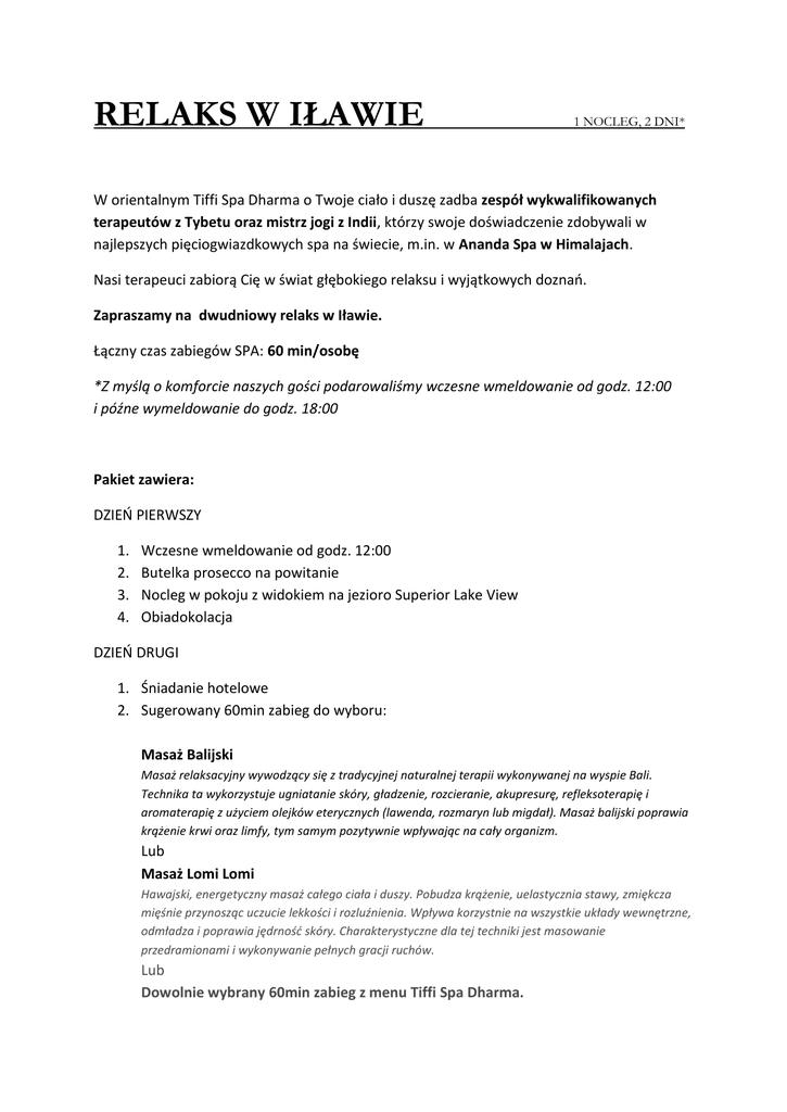 RELAKS W IŁAWIE 1 NOCLEG, 2 DNI* W orientalnym Tiffi Spa Dharma o Twoje ciało i duszę zadba zespół wykwalifikowanych terapeutów z Tybetu oraz mistrz jogi z Indii, którzy swoje doświadczenie zdobywali w najlepszych pięciogwiazdkowych spa na świecie, m.in. w Ananda Spa w Himalajach. Nasi terapeuci zabiorą Cię w świat głębokiego relaksu i wyjątkowych doznań. Zapraszamy na dwudniowy relaks w Iławie. Łączny czas zabiegów SPA: 60 min/osobę *Z myślą o komforcie naszych gości podarowaliśmy wczesne wmeldowanie od godz. 12:00 i późne wymeldowanie do godz. 18:00 Pakiet zawiera: DZIEŃ PIERWSZY 1. 2. 3. 4. Wczesne wmeldowanie od godz. 12:00 Butelka prosecco na powitanie Nocleg w pokoju z widokiem na jezioro Superior Lake View Obiadokolacja DZIEŃ DRUGI 1. Śniadanie hotelowe 2. Sugerowany 60min zabieg do wyboru: Masaż Balijski Masaż relaksacyjny wywodzący się z tradycyjnej naturalnej terapii wykonywanej na wyspie Bali. Technika ta wykorzystuje ugniatanie skóry, gładzenie, rozcieranie, akupresurę, refleksoterapię i aromaterapię z użyciem olejków eterycznych (lawenda, rozmaryn lub migdał). Masaż balijski poprawia krążenie krwi oraz limfy, tym samym pozytywnie wpływając na cały organizm. Lub Masaż Lomi Lomi Hawajski, energetyczny masaż całego ciała i duszy. Pobudza krążenie, uelastycznia stawy, zmiękcza mięśnie przynosząc uczucie lekkości i rozluźnienia. Wpływa korzystnie na wszystkie układy wewnętrzne, odmładza i poprawia jędrność skóry. Charakterystyczne dla tej techniki jest masowanie przedramionami i wykonywanie pełnych gracji ruchów. Lub Dowolnie wybrany 60min zabieg z menu Tiffi Spa Dharma. 3. Późne wymeldowanie do godz. 18:00 Dodatkowo cena obejmuje: Nieograniczony dostęp do strefy wellness (basen, jacuzzi, sauna sucha, łaźnia parowa, sala gym i fitness) 3 x dziennie zajęcia z jogi prowadzone przez mistrza z Indii (09:30, 16:00, 19:00) Wypożyczenie rowerów Parking 20% rabat na dodatkowe zabiegi SPA Cena pakietu dla 1 osoby w pokoju Superior Lake View – 699 zł Cena pakietu dla 2 osób w pokoju Superior Lake View – 999 zł RELAKS W IŁAWIE 2 NOCLEGI, 3 DNI* W orientalnym Tiffi Spa Dharma o Twoje ciało i duszę zadba zespół wykwalifikowanych terapeutów z Tybetu oraz mistrz jogi z Indii, którzy swoje doświadczenie zdobywali w najlepszych pięciogwiazdkowych spa na świecie, m.in. w Ananda Spa w Himalajach. Nasi terapeuci zabiorą Cię w świat głębokiego relaksu i wyjątkowych doznań. Zapraszamy na trzydniowy relaks w Iławie. Łączny czas zabiegów SPA: 60 min/osobę *Z myślą o komforcie naszych gości podarowaliśmy wczesne wmeldowanie od godz. 12:00 i późne wymeldowanie do godz. 18:00 Pakiet zawiera: DZIEŃ PIERWSZY 5. 6. 7. 8. Wczesne wmeldowanie od godz. 12:00 Butelka prosecco na powitanie Obiadokolacja Nocleg w pokoju z widokiem na jezioro Superior Lake View DZIEŃ DRUGI 4. Śniadanie hotelowe 5. Sugerowany 60 min zabieg do wyboru: Masaż Balijski Masaż relaksacyjny wywodzący się z tradycyjnej naturalnej terapii wykonywanej na wyspie Bali. Technika ta wykorzystuje ugniatanie skóry, gładzenie, rozcieranie, akupresurę, refleksoterapię i aromaterapię z użyciem olejków eterycznych (lawenda, rozmaryn lub migdał). Masaż balijski poprawia krążenie krwi oraz limfy, tym samym pozytywnie wpływając na cały organizm. Lub Masaż Lomi Lomi Hawajski, energetyczny masaż całego ciała i duszy. Pobudza krążenie, uelastycznia stawy, zmiękcza mięśnie przynosząc uczucie lekkości i rozluźnienia. Wpływa korzystnie na wszystkie układy wewnętrzne, odmładza i poprawia jędrność skóry. Charakterystyczne dla tej techniki jest masowanie przedramionami i wykonywanie pełnych gracji ruchów. Lub Dowolnie wybrany 60min zabieg z menu Tiffi Spa Dharma. 6. Obiadokolacja 7. Nocleg w pokoju z widokiem na jezioro Superior Lake View DZIEŃ TRZECI 1. Śniadanie hotelowe 2. Późne wymeldowanie do godz. 18:00 Dodatkowo cena obejmuje: Nieograniczony dostęp do strefy wellness (basen, jacuzzi, sauna sucha, łaźnia parowa, sala gym i fitness) 3 x dziennie zajęcia z jogi prowadzone przez mistrza z Indii (09:30, 16:00, 19:00) 1 godzina kortu tenisowego Wypożyczenie rowerów Parking 20% rabat na dodatkowe zabiegi SPA Cena pakietu dla 1 osoby w pokoju Superior Lake View – 999 zł Cena pakietu dla 2 osób w pokoju Superior Lake View – 1499 zł