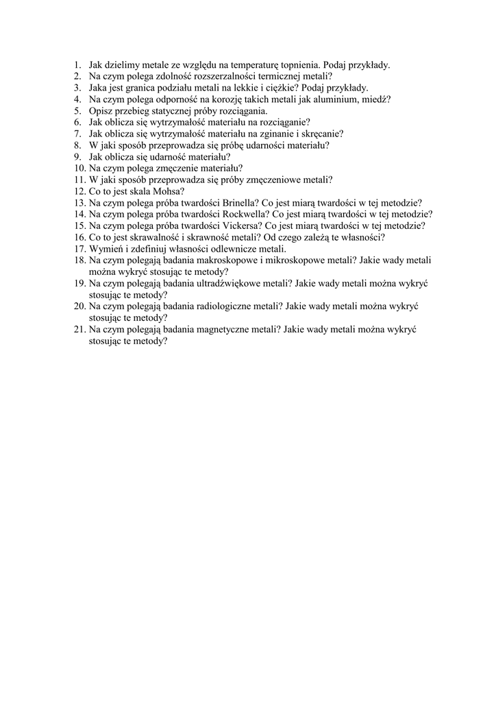 1. Jak dzielimy metale ze względu na temperaturę topnienia. Podaj przykłady. 2. Na czym polega zdolność rozszerzalności termicznej metali? 3. Jaka jest granica podziału metali na lekkie i cięŜkie? Podaj przykłady. 4. Na czym polega odporność na korozję takich metali jak aluminium, miedź? 5. Opisz przebieg statycznej próby rozciągania. 6. Jak oblicza się wytrzymałość materiału na rozciąganie? 7. Jak oblicza się wytrzymałość materiału na zginanie i skręcanie? 8. W jaki sposób przeprowadza się próbę udarności materiału? 9. Jak oblicza się udarność materiału? 10. Na czym polega zmęczenie materiału? 11. W jaki sposób przeprowadza się próby zmęczeniowe metali? 12. Co to jest skala Mohsa? 13. Na czym polega próba twardości Brinella? Co jest miarą twardości w tej metodzie? 14. Na czym polega próba twardości Rockwella? Co jest miarą twardości w tej metodzie? 15. Na czym polega próba twardości Vickersa? Co jest miarą twardości w tej metodzie? 16. Co to jest skrawalność i skrawność metali? Od czego zaleŜą te własności? 17. Wymień i zdefiniuj własności odlewnicze metali. 18. Na czym polegają badania makroskopowe i mikroskopowe metali? Jakie wady metali moŜna wykryć stosując te metody? 19. Na czym polegają badania ultradźwiękowe metali? Jakie wady metali moŜna wykryć stosując te metody? 20. Na czym polegają badania radiologiczne metali? Jakie wady metali moŜna wykryć stosując te metody? 21. Na czym polegają badania magnetyczne metali? Jakie wady metali moŜna wykryć stosując te metody?