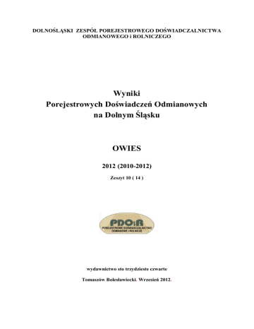DOLNOŚLĄSKI ZESPÓŁ POREJESTROWEGO DOŚWIADCZALNICTWA ODMIANOWEGO i ROLNICZEGO Wyniki Porejestrowych Doświadczeń Odmianowych na Dolnym Śląsku OWIES 2012 (2010-2012) Zeszyt 10 ( 14 ) wydawnictwo sto trzydzieste czwarte Tomaszów Bolesławiecki. Wrzesień 2012. Dolnośląski Zespół Porejestrowego Doświadczalnictwa Odmianowego i Rolniczego Przewodniczący: mgr inż. Anna Kamińska Dyrektor SDOO Zybiszów Z-ca: prof. dr hab. Jan Kaczmarek Z-ca: prof. dr hab. Henryk Bujak Sekretarz: mgr inż. Ewa Śmiałek Stacja Koordynująca PDOiR na Dolnym Śląsku: Centralny Ośrodek Badania Roślin Uprawnych Stacja Doświadczalna Oceny Odmian w Zybiszowie 55-080 Kąty Wrocławskie Dyrektor: mgr inż. Anna Kamińska e-mail [email protected] www.zybiszow.coboru.pl www.sdootomaszow.wroclaw.pl Tel. 71-334-20-10 Opracowali: mgr inż. Ludwik Kotowicz Rozpowszechnianie danych zawartych w publikacji wyłącznie z podaniem COBORU jako źródła informacji Wydawca: SDOO Tomaszów Bolesławiecki OWIES I. WSTĘP. W syntezie wykorzystano wyniki 10 doświadczeń z odmianami owsa przeprowadzonych na Dolnym Śląsku w latach 2010 – 2012. Liczba i lokalizacja doświadczeń wydaje się wystarczająca do uzyskania reprezentatywnych wyników. Wiosną 2012 roku założono na Dolnym Śląsku 4 doświadczenia. Obecnie(2012) w Krajowym Rejestrze znajduje się 30 odmian owsa , w tym pięć o ziarnie nieoplewionym – Cacko,Polar, Nagus, Maczo i Siwek. Spośród tych odmian Zespół Wojewódzki PDO, zimą bieżącego roku, wybrał do doświadczeń na Dolnym Śląsku 10 odmian; osiem które w poprzednich latach plonowały najlepiej w naszym województwie oraz dwie nieoplewione. W dalszej części publikacji podano charakterystyki tych odmian. Doświadczenia prowadzono w czterech powtórzeniach bez zróżnicowanych poziomów agrotechnicznych. II. ANALIZA WYNIKÓW DOŚWIADCZEŃ. W roku 2012 poziom plonowania owsa był najwyższy w analizowanym trzyleciu. Zebrano o 13,2 dt/ha więcej niż w 2011 roku. Zróżnicowanie w ogólnym poziomie plonowania w doświadczeniach było mniejsze niż w poprzednim roku od 75,8 dt/ha w Jeleniej Górze do 59,1 dt/ha w Tomaszowie Bolesławieckim. Najlepiej w ostatnim roku plonowały odmiany: Haker i Zuch. Plon odmiany nieoplewionej Polar wyniósł 73 % plonu wzorca przy niższej o 18 - 20 % zawartości łuski. Istotnie wyżej plonowała druga odmiana nieoplewiona – Siwek ( 84 % wzorca ) W roku 2012 porażenie chorobami było większe niż w latach poprzednich. Rośliny były wyższe w porównaniu do lat poprzednich, wyleganie przed zbiorem wystąpiło we wszystkich doświadczeniach. Odmianą silniej wylegającą był Haker. Masa 1000 ziaren była niższa w porównaniu do roku poprzedniego o 0,7 g. Dużym i dorodnym ziarnem wyróżniły się odmiany – Bingo i Scorpion. III. CHARAKTERYSTYKA ODMIAN BADANYCH W ROKU 2012. ODMIANY OPLEWIONE ARAB. Odmiana żółtoziarnista, o dość dużej odporności na helmintosporiozę, średniej na rdzę źdźbłową i septoriozę liści, dość małej na mączniaka i na rdzę wieńcową. Rośliny średniej wysokości, o przeciętnej odporności na wyleganie. Termin wiechowania dość późny, dojrzewania średni. Ziarno o dużym do bardzo dużego udziale łuski, dość dużej masie 1000 ziaren, dość dużej gęstości, dość dobrym wyrównaniu oraz średniej zawartości białka i małej tłuszczu. Plonuje dość dobrze. KREZUS. Odmiana żółtoziarnista Odporność na rdzę wieńcową - duża, na rdzę źdźbłową, helmintosporiozę i septoriozę liści - przeciętna, na mączniaka - dość mała. Rośliny średniej wysokości, o dość dużej odporności na wyleganie. Termin wiechowania i dojrzewania średni. Ziarno o dość dużym udziale łuski, dość dużej masie 1000 ziaren, małej do bardzo małej gęstości w stanie zsypnym, dość dobrym wyrównaniu oraz małej zawartości białka i dość dużej tłuszczu. Plenność dobra. Tolerancja na zakwaszenie gleby średnia. FURMAN. Odmiana żółtoziarnista, przeznaczona do uprawy w całym kraju, z wyjątkiem wyżej położonych terenów górskich. Plenność dość dobra. Odporność na mączniaka, rdzę źdźbłową, helmintosporiozę i septoriozę liści – przeciętna, na rdzę wieńcową – mała. Rośliny średniej wysokości, o dużej odporności na wyleganie. Termin wiechowania i dojrzewania przeciętny. Udział łuski dość duży, masa 1000 ziaren średnia, wyrównanie ziarna dobre, gęstość w stanie zsypnym mała. Zawartość białka i tłuszczu mała do bardzo małej. Tolerancja na zakwaszenie gleby dość mała. BERDYSZ. Odmiana żółtoziarnista. Odporność na rdzę źdźbłową - dość duża, na mączniaka, rdzę wieńcową, helmintosporiozę i septoriozę liści - średnia. Rośliny przeciętnej wysokości, o średniej odporności na wyleganie. Termin wiechowania dość późny, dojrzewania średni. Ziarno o dużym udziale łuski, dość małej masie 1000 ziaren, dość małej gęstości w stanie zsypnym, średnim wyrównaniu oraz dość dużej zawartości białka i bardzo małej tłuszczu. Plenność przeciętna. Tolerancja na zakwaszenie gleby średnia. ZUCH. Odmiana żółtoziarnista. Odporność na rdzę wieńcową - duża, na rdzę źdźbłową i helmintosporiozę - dość duża, na septoriozę liści – średnia, na mączniaka - dość mała, Rośliny średniej wysokości, o dość dużej odporności na wyleganie. Termin wiechowania i dojrzewania średni. Ziarno o dość małym udziale łuski, średniej masie 1000 ziaren, średniej gęstości w stanie zsypnym, dość słabym wyrównaniu oraz dość dużej zawartości białka i małej tłuszczu. Plenność dość dobra. Tolerancja na zakwaszenie gleby średnia. SCORPION. Odmiana żółtoziarnista. Odporność na rdzę źdźbłową - duża, na mączniaka dość duża, na helmintosporiozę i septoriozę liści - średnia na rdzę wieńcową - dość mała. Rośliny średniej wysokości, o dość dużej odporności na wylegani
