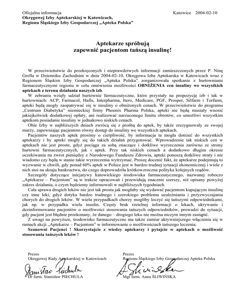 Oficjalna informacja Okręgowej Izby Aptekarskiej w Katowicach, Regionu Śląskiego Izby Gospodarczej „Apteka Polska” Katowice 2004-02-10 Aptekarze spróbują zapewnić pacjentom tańszą insulinę! W przeciwieństwie do przekręconych i nieprawdziwych informacji zamieszczonych przez P. Ninę Grella w Dzienniku Zachodnim w dniu 2004-02-10, Okręgowa Izba Aptekarska w Katowicach wraz z Regionem Śląskim Izby Gospodarczej „Apteka Polska” zorganizowała spotkanie z hurtowniami farmaceutycznymi regionu w celu omówienia możliwości OBNIŻENIA cen insuliny we wszystkich aptekach z terenu działania naszych izb. W zebraniu wzięły udział hurtownie farmaceutyczne, które przystały na propozycję izb i tak w hurtowniach: ACP, Farmacol, Hafis, Interpharma, Itero, Medicare, PGF, Prosper, Silfarm i Torfarm, apteki będą mogły zaopatrywać się w insuliny o obniżonych cenach. W przeciwieństwie do programu „Centrum Diabetyka” niemieckiej firmy Phoenix Pharma Polska, apteki nie będą musiały wnosić jakiejkolwiek dodatkowej opłaty, ani realizować narzuconego limitu obrotów, co umożliwi wszystkim aptekom posiadanie insuliny w jednakowo niskich cenach. Obie Izby w najbliższych dniach zwrócą się z prośbą do aptek, by także zrezygnowały ze swojej marży, zapewniając pacjentom równy dostęp do insuliny we wszystkich aptekach. Pacjentów naszych aptek prosimy o cierpliwość, by informacja ta mogła dotrzeć do wszystkich aptekarzy i by apteki mogły się do takich działań przygotować. Wprowadzenie tak niskich cen w aptekach nie jest proste, gdyż pociąga za sobą znaczące i dotkliwe wyrzeczenia zarówno ze strony hurtowni farmaceutycznych, jak i aptek. Przy tak niskich cenach a dodatkowo długim okresie oczekiwania na zwrot pieniędzy z Narodowego Funduszu Zdrowia, apteki ponoszą dotkliwe straty i nie wiadomo czy będą w stanie takie wyrzeczenia wytrzymać. Proszę docenić fakt, że aptekarze podejmują to wyzwanie w chwili, gdy ponad 60% aptek w Polsce jest w bardzo trudnej sytuacji ekonomicznej i wiele z nich stoi na skraju bankructwa, do czego doprowadziła krótkowzroczna polityka kolejnych rządów. Szczegóły dotyczące inicjatywy katowickiego środowiska farmaceutycznego, nazwanej roboczo „Aptekarze – Pacjentom” są w trakcie opracowań i przewidują znacznie szerszy, niż opisany powyżej zakres działania, o czym będziemy informowali w najbliższych tygodniach. Cała sprawa drogich leków nie jest tak prosta jak mogłaby się wydawać pacjentom kupującym insulinę czy inne leki, gdyż dotyka bardzo trudnego i szerokiego problemu uzależniania i przyzwyczajania chorych do drogich leków. W wielu przypadkach chorzy mogliby leczyć się tańszymi odpowiednikami, jak np. w przypadku wielu insulin. Częsty brak rzetelnej informacji o lekach, ukrywanie i dezinformowanie pacjentów o możliwości stosowania tańszych odpowiedników, prowadzi do sytuacji, gdy pacjent jest błędnie przekonany, że danego – drogiego leku nie można niczym innym zastąpić. Z uwagi na powyższe, środowisko farmaceutyczne ma także zamiar aktywniejszego włączenia się w ramach akcji „Aptekarze – Pacjentom” w informowanie o możliwościach tańszego leczenia. Szanowni Pacjenci ! Skorzystajcie z wiedzy aptekarzy i pytajcie w aptekach o możliwość stosowania tańszych leków ! Prezes Okręgowej Rady Aptekarskiej w Katowicach Prezes Regionu Śląskiego Izby Gospodarczej Apteka Polska Dr farm. Stanisław PIECHULA Mgr farm. Anna ŚLIWIŃSKA Dziennik Zachodni 2004-02-10 [KATOWICE] Prezes Okręgowej Izby Aptekarskiej przecina „wrzód" niższych cen. Czy zniknie z rynku tańsza insulina? To może okazać się już dziś. W południe decyzję o wycofaniu z rynku tańszej insuliny ma podjąć Okręgowa Izba Aptekarska w Katowicach, co oznacza pogłębienie dramatu prawie 2 milionów Polaków chorujących na cukrzycę. Dramatu, który zaczął się 1 grudnia ub. roku po wprowadzeniu nowej listy refundacji leków. Do tej pory pacjenci płacili za insulinę, lek życia w ich przypadku, średnio 2,5 zł miesięcznie mówi dr Ewa Pańkowska z Kliniki Diabetologii i Wad Wrodzonych AM w Warszawie. Nawet za najlepszą, czołowych światowych producentów. Teraz pacjent dopłaca do jednego opakowania od 19,60 do 45,32 zł. Najbardziej załamani są rodzice chorujących na cukrzycę dzieci, zwłaszcza ci, którzy nabyli kosztowne pompy insulinowe. Jedyna tania insulina (polska), której cena pozostała w 100 procentach refundowana, nie nadaje się do pomp. Ta podwyżka cofa nas w leczeniu cukrzycy o 25 lat! Nadzieją chorych stała się trwająca od połowy ub.r. akcja firmy Phoenix Pharma Polska. Opracowaliśmy społeczny program walki z cukrzycą, rozpoczynając tworzenie w całej Polsce wspólnoty specjalistycznych aptek „Centrum Diabetyka". Pacjent znajduje tu tańsze leki, literaturę i możliwość fachowej konsultacji ze specjalistami, co dla chorych spoza dużych centrów medycznych jest błogosławieństwem. Warunkiem wejścia apteki do tej wspólnoty była chęć sprawowania opieki nad chorym z cukrzycą. Do programu zgłosiło się 400 aptek z całej Polski, a w kolejce do niezbędnych szkoleń czeka kilkaset następnych - informuje Katarzyna Krażyńska z „Phoeniksa". Inicjatywę tę usiłuje zniszczyć grono farmaceutów przeciwnych jakiemukolwiek obniżaniu aptecznych marż. Inicjatorem zażartej walki z niższymi cenami jest prezes Okręgowej Rady Aptekarskiej w Katowicach, dr farm. Stanisław Piechula z Mikołowa. Na swojej stronie internetowej nawołuje do przeciwstawienia się „spirali obniżania marży aptecznej", nazywając ją „wrzodem". Nie tylko nawołuje, także grozi. Zapowiada, że „wobec farmaceutów, którzy nie podporządkują się uchwale będzie wszczynane postępowanie dyscyplinarne, które może doprowadzić do zawieszenia prawa wykonywania zawodu". Batalii o wyższe ceny dodaje pikanterii fakt, że prezes tłumaczy ją... troską o do