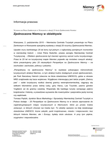 www.germany.travel Informacja prasowa Wystawa na Placu Zamkowym w Warszawie z okazji 25-lecia Zjednoczenia Niemiec Zjednoczone Niemcy w obiektywie Warszawa, 2. października 2015 – Niemiecka Centrala Turystyki prezentuje na Placu Zamkowym w Warszawie specjalną wystawę z okazji 25 rocznicy Zjednoczenia Niemiec. Upadek muru berlińskiego 25 lat temu był jednym z najbardziej pamiętnych momentów w niemieckiej historii. – mówi Petra Hedorfer, prezes zarządu Niemieckiej Centrali Turystycznej. - Efektem zjednoczenia był również ogromny wzrost ruchu turystycznego. Przez te 25 lat na turystycznej mapie Niemiec pojawiło się mnóstwo nowych atrakcji, które prezentujemy jako 25 niezwykłych Perspektyw na Zjednoczone Niemcy – na wschodzie i zachodzie, północy i południu. „Perspektywy na zjednoczone Niemcy” to wystawa pokazująca różnorodność turystycznych atrakcji Niemiec, w tym atrakcji trudno dostępnych przed zjednoczeniem, jak Park Narodowy Hainich (obecnie na liście dziedzictwa UNESCO), gdzie w okresie NRD znajdowała się baza wojskowa. Wyjątkowo interesujący jest także projekt „Zielony pas” – szlak turystyczny wzdłuż dawnej granicy wewnątrzniemieckiej, ciągnący się setkami kilometrów przez dolinę Łaby, góry Harzu, Las Turyński, pasmo górskie Vogtland, aż do granicy czeskiej. Wspaniały dla każdego turysty ceniącego piękno krajobrazów i historię, a prawdziwe wyzwanie dla rowerzystów i pasjonatów jazdy konnej czy wędrówek. Tomasz Pędzik, dyrektor Biura Marketingu i Sprzedaży Niemieckiej Centrali Turystyki w Polsce dodaje: - 25 Perspektyw na Zjednoczone Niemcy to w istocie zaproszenie do najatrakcyjniejszych miejsc turystycznych w Niemczech, które po prostu trzeba zobaczyć, w których chociaż raz trzeba być. To obiekty wpisane na listę światowego dziedzictwa UNESCO, liczne zabytki, parki krajobrazowe, miasta i miejscowości, bez których historia Niemiec, ale i Europy, byłaby dużo uboższa. A przy tym piękne, oryginalne i niepowtarzalne. Niemiecka Centrala Turystyki c/o Polsko-Niemiecka Izba Przemysłowo-Handlowa ul. Miodowa 14 00-246 Warszawa Tel. +48 22 53 10 528 Fax +48 22 53 10 688 [email protected] Polacy zarezerwowali w 2014 r. w sumie 2,44 mln noclegów. W I półroczu 2015 r. Federalny Urząd Statystyczny zanotował 1,18 mln noclegów Polaków. Polska jest w 10 najważniejszych rynków dla niemieckiego Incomingu. O DZT Niemiecka Centrala Turystyki (DZT) to narodowa „izba turystyki” Niemiec z siedzibą główną we Frankfurcie nad Menem. Centrala zajmuje się promowaniem Niemiec jako kraju turystycznego na zlecenie Federalnego Ministerstwa Gospodarki i Technologii (BMWi), które wspiera ją na mocy uchwały niemieckiego Bundestagu. DZT zajmuje się tworzeniem strategii i produktów oraz działaniami marketingowymi w celu dalszego umocnienia pozytywnego wizerunku Niemiec za granicą jako celu podróży oraz wspierania turystyki niemieckiej. DZT posiada 30 przedstawicielstw zagranicznych na całym świecie. Bliższe informacje można znaleźć w naszym internetowym centrum prasowym na stronie www.germany.travel/presse. Niemiecka Centrala Turystyki c/o Polsko-Niemiecka Izba Przemysłowo-Handlowa ul. Miodowa 14 00-246 Warszawa Tel. +48 22 53 10 528 Fax +48 22 53 10 688 [email protected]