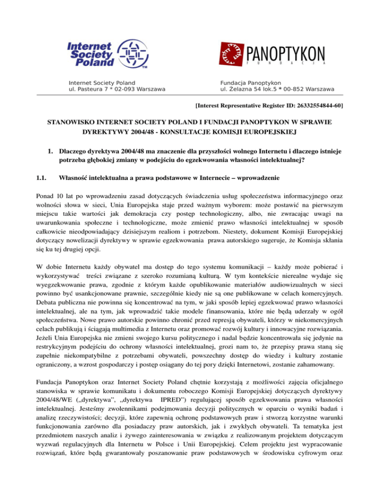 Internet Society Poland ul. Pasteura 7 * 02-093 Warszawa Fundacja Panoptykon ul. Żelazna 54 lok.5 * 00-852 Warszawa [Interest Representative Register ID: 2633255484460] STANOWISKO INTERNET SOCIETY POLAND I FUNDACJI PANOPTYKON W SPRAWIE DYREKTYWY 2004/48 KONSULTACJE KOMISJI EUROPEJSKIEJ 1. Dlaczego dyrektywa 2004/48 ma znaczenie dla przyszłości wolnego Internetu i dlaczego istnieje potrzeba głębokiej zmiany w podejściu do egzekwowania własności intelektualnej? 1.1. Własność intelektualna a prawa podstawowe w Internecie – wprowadzenie Ponad 10 lat po wprowadzeniu zasad dotyczących świadczenia usług społeczeństwa informacyjnego oraz wolności słowa w sieci, Unia Europejska staje przed ważnym wyborem: może postawić na pierwszym miejscu takie wartości jak demokracja czy postęp technologiczny, albo, nie zwracając uwagi na uwarunkowania społeczne i technologiczne, może zmienić prawo własności intelektualnej w sposób całkowicie nieodpowiadający dzisiejszym realiom i potrzebom. Niestety, dokument Komisji Europejskiej dotyczący nowelizacji dyrektywy w sprawie egzekwowania prawa autorskiego sugeruje, że Komisja skłania się ku tej drugiej opcji. W dobie Internetu każdy obywatel ma dostęp do tego systemu komunikacji – każdy może pobierać i wykorzystywać treści związane z szeroko rozumianą kulturą. W tym kontekście nierealne wydaje się wyegzekwowanie prawa, zgodnie z którym każde opublikowanie materiałów audiowizualnych w sieci powinno być usankcjonowane prawnie, szczególnie kiedy nie są one publikowane w celach komercyjnych. Debata publiczna nie powinna się koncentrować na tym, w jaki sposób lepiej egzekwować prawo własności intelektualnej, ale na tym, jak wprowadzić takie modele finansowania, które nie będą uderzały w ogół społeczeństwa. Nowe prawo autorskie powinno chronić przed represją obywateli, którzy w niekomercyjnych celach publikują i ściągają multimedia z Internetu oraz promować rozwój kultury i innowacyjne rozwiązania. Jeżeli Unia Europejska nie zmieni swojego kursu politycznego i nadal będzie koncentrowała się jedynie na restrykcyjnym podejściu do ochrony własności intelektualnej, grozi nam to, że przepisy prawa staną się zupełnie niekompatybilne z potrzebami obywateli, powszechny dostęp do wiedzy i kultury zostanie ograniczony, a wzrost gospodarczy i postęp osiągany do tej pory dzięki Internetowi, zostanie zahamowany. Fundacja Panoptykon oraz Internet Society Poland chętnie korzystają z możliwości zajęcia oficjalnego stanowiska w sprawie komunikatu i dokumentu roboczego Komisji Europejskiej dotyczących dyrektywy 2004/48/WE („dyrektywa”, „dyrektywa IPRED”) regulującej sposób egzekwowania prawa własności intelektualnej. Jesteśmy zwolennikami podejmowania decyzji politycznych w oparciu o wyniki badań i analizę rzeczywistości; decyzji, które zapewnią ochronę podstawowych praw i stworzą korzystne warunki funkcjonowania zarówno dla posiadaczy praw autorskich, jak i zwykłych obywateli. Ta tematyka jest przedmiotem naszych analiz i żywego zainteresowania w związku z realizowanym projektem dotyczącym wyzwań regulacyjnych dla Internetu w Polsce i Unii Europejskiej. Celem projektu jest wypracowanie rozwiązań, które będą gwarantowały poszanowanie praw podstawowych w środowisku cyfrowym oraz neutralność technologiczną. Stanowi to dodatkowy asumpt dla wypowiedzenia się w ogłoszonych przez Komisję Europejską konsultacjach w związku z mającym nastąpić przeglądem dyrektywy 2004/48 w sprawie egzekwowania praw własności intelektualnej. We wstępie datowanego na 22 grudnia 2010 raportu na temat stosowania dyrektywy 2004/48 Komisja zadeklarowała, że celem przeglądu jest rozpoznanie jak wygląda egzekwowanie praw własności intelektualnej w Internecie. Zgodnie z deklaracją Komisji, jednym z głównych celów przeglądu jest zaproponowanie zmian w prawie, które uwzględniałyby nowe zjawiska i problemy w sferze własności intelektualnej wywołane masowym korzystaniem z Internetu. Dziwi nas, a zarazem niepokoi podkreślone w sprawozdaniu Komisji stwierdzenie, że gdy przyjmowano dyrektywę 2004/48 nie brano pod uwagę wyzwań związanych z powstaniem i upowszechnieniem tego szczególnego medium. Ta podstawowa dla dokumentu deklaracja wydaje się być zwyczajnie nieprawdziwa. Po pierwsze, stwierdzenie, że Komisja proponując w 2003 roku harmonizację prawodawstwa dotyczącego egzekwowania praw własności intelektualnej pominęła Internet brzmi niewiarygodnie. Istotnie, różnorodność oferowanych wówczas usług Internetowych odbiegały od dzisiejszych standardów i przyzwyczajeń, jednak wszystkie podstawowe usługi Internetowe były już od kilku lat powszechnie dostępne, a wszystko wskazywało na to, że czeka nas dalszy, dynamiczny rozwój tego środka komunikacji na odległość. Po drugie, nazywane przez niektórych Internetowymi – choć faktycznie dotyczące wszystkich dzieł cyfrowych – traktaty WIPO (Światowej Organizacji Własności Intelektualnej) zawarto w już w roku 19961, a dyrektywa wprowadzająca do prawa UE techniczne środki zabezpieczające dzieła cyfrowe to zaproponowana w roku 1999 dyrektywa 2001/29. Po trzecie, nasze zdziwienie znajduje potwierdzenie w dokumentach: wbrew temu co obecnie sugeruje Komisja, już w dokumentach uzasadniających potrzebę wprowadzenia dyrektywy 2004/48 wielokrotnie wspomina się o piractwie w odniesieniu do plików muzycznych i multimedialnych w kontekście Internetu, jako wyzwaniu któremu proponowane w 2003 i uchwalone w 2004 przepisy europejskie mają zaradzić. Przypadek Napstera2 – bardzo popularnego w tamtym czasie serwisu Internetowego – doskonale obrazuje problemy, z jakimi musieli się wówczas zmierzyć autorzy dyrektywy. Pojawia się zatem pytanie, co chcieli przekazać autorzy raportu twierdząc, że dyrektywa nie została przygotowana do zwalczania naruszeń praw własności inte