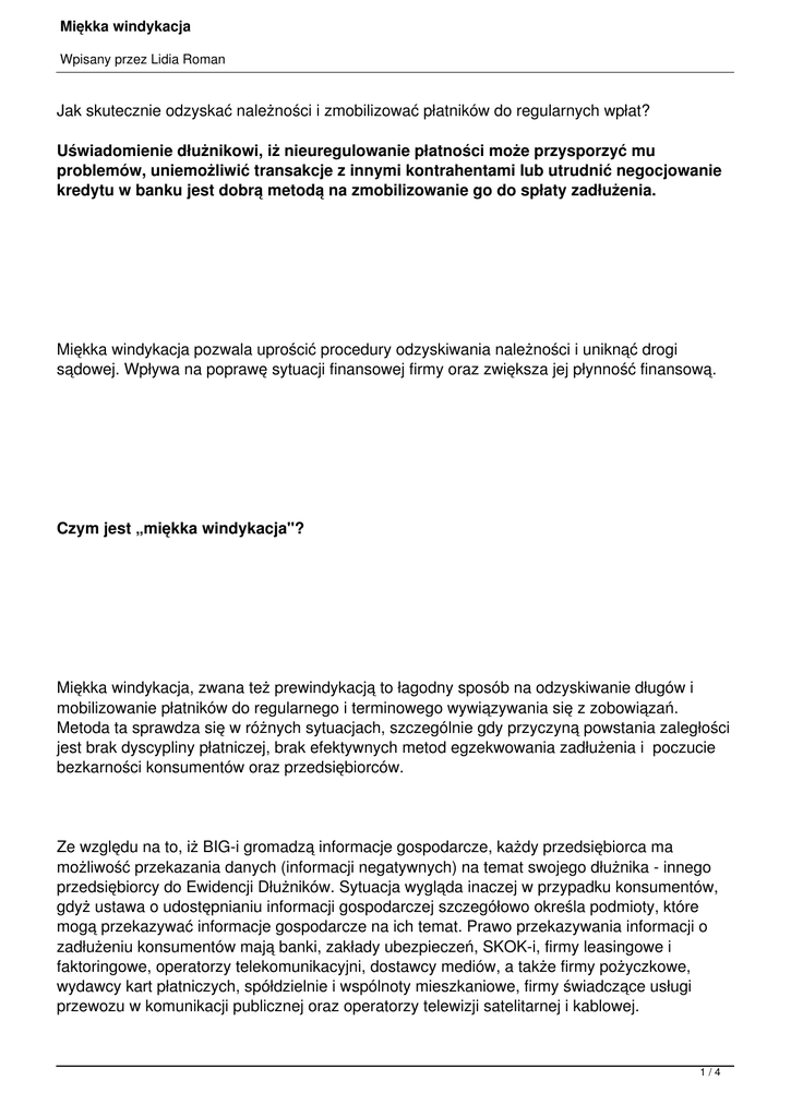 Miękka windykacja Wpisany przez Lidia Roman Jak skutecznie odzyskać należności i zmobilizować płatników do regularnych wpłat? Uświadomienie dłużnikowi, iż nieuregulowanie płatności może przysporzyć mu problemów, uniemożliwić transakcje z innymi kontrahentami lub utrudnić negocjowanie kredytu w banku jest dobrą metodą na zmobilizowanie go do spłaty zadłużenia. Miękka windykacja pozwala uprościć procedury odzyskiwania należności i uniknąć drogi sądowej. Wpływa na poprawę sytuacji finansowej firmy oraz zwiększa jej płynność finansową. Czym jest „miękka windykacja"? Miękka windykacja, zwana też prewindykacją to łagodny sposób na odzyskiwanie długów i mobilizowanie płatników do regularnego i terminowego wywiązywania się z zobowiązań. Metoda ta sprawdza się w różnych sytuacjach, szczególnie gdy przyczyną powstania zaległości jest brak dyscypliny płatniczej, brak efektywnych metod egzekwowania zadłużenia i poczucie bezkarności konsumentów oraz przedsiębiorców. Ze względu na to, iż BIG-i gromadzą informacje gospodarcze, każdy przedsiębiorca ma możliwość przekazania danych (informacji negatywnych) na temat swojego dłużnika - innego przedsiębiorcy do Ewidencji Dłużników. Sytuacja wygląda inaczej w przypadku konsumentów, gdyż ustawa o udostępnianiu informacji gospodarczej szczegółowo określa podmioty, które mogą przekazywać informacje gospodarcze na ich temat. Prawo przekazywania informacji o zadłużeniu konsumentów mają banki, zakłady ubezpieczeń, SKOK-i, firmy leasingowe i faktoringowe, operatorzy telekomunikacyjni, dostawcy mediów, a także firmy pożyczkowe, wydawcy kart płatniczych, spółdzielnie i wspólnoty mieszkaniowe, firmy świadczące usługi przewozu w komunikacji publicznej oraz operatorzy telewizji satelitarnej i kablowej. 1/4 Miękka windykacja Wpisany przez Lidia Roman Zatory płatnicze tworzą się praktycznie w każdej działalności, w której sposób rozliczania należności odbywa się na podstawie kredytu kupieckiego z odroczonym terminem płatności. Powstają one zarówno wśród konsumentów, którzy kupują towary i usługi, jak również pomiędzy przedsiębiorcami. Konsekwencje dla dłużnika Biura Informacji Gospodarczej współpracują z instytucjami finansowymi, takimi jak banki, fundusze pożyczkowe i poręczeniowe, firmy leasingowe i pożyczkowe oraz z operatorami telefonii komórkowej i stacjonarnej. Podmioty te sprawdzają rzetelność płatniczą i terminowość w wywiązywaniu się z zobowiązań swoich potencjalnych klientów. Z tego powodu znalezienie się w Ewidencji Dłużników może utrudnić lub uniemożliwić uzyskanie kredytu w banku lub pożyczki, zakup telefonu, pralki lub telewizora na raty. Fakt ten może również skutkować odmówieniem sprzedaży innych towarów lub usług bądź otrzymania ich na mniej korzystnych warunkach. Miękka windykacja krok po kroku 2/4 Miękka windykacja Wpisany przez Lidia Roman Biura dysponują odpowiednimi narzędziami, które pomogą w przeprowadzeniu całego procesu. Są to: formularz wezwania do zapłaty z ostrzeżeniem o wpisie do Biura Informacji Gospodarczej, pieczątka do wykorzystywania na własnych dokumentach finansowych z informacją o zamiarze umieszczenia dłużnika w ewidencji oraz powiadomienie o umieszczeniu informacji gospodarczej na jego temat w Biurze Informacji Gospodarczej. Wezwania do zapłaty wysyła przedsiębiorca, natomiast powiadomienie jest dokumentem, który do dłużnika wysyła biuro listem poleconym lub zwykłym na adres do korespondencji wskazany przez dłużnika lub na adres zameldowania. Aby można było przekazać informacje o zadłużeniu, musi ono spełniać określone kryteria. W przypadku konsumenta musi być to kwota minimum 200 zł, a w przypadku przedsiębiorcy 500 zł. Wymagalność takiego zobowiązania powinna wynosić minimum 60 dni. Etapy procesu „miękkiej windykacji": - podpisanie umowy z BIG-iem oraz uzyskanie loginu i hasła do Systemu BIG; - przejście szkolenia z obsługi Systemu BIG i zasad przekazywania informacji gospodarczych; - wysłanie do dłużnika listem poleconym wezwania do zapłaty z informacją o zamiarze umieszczenia informacji gospodarczej na jego temat w Ewidencji Dłużników BIG, w przypadku braku uiszczenia przeterminowanej wobec wierzyciela należności; - po upływie 60 dni od daty wymagalności należności i 30 dni od daty wysłania wezwania do zapłaty opatrzonego informacją o możliwości przekazania danych dłużnika do BIG, można przekazać negatywną informację gospodarczą do BIG-u; - po zalogowaniu do Systemu BIG na podstawie uzyskanego loginu i hasła można wpisywać dłużników do Ewidencji Dłużników; - poinformowanie dłużnika o wpisaniu go do Ewidencji Dłużników powiadomieniem listownym wysyłanym przez BIG. Skuteczność działań 3/4 Miękka windykacja Wpisany przez Lidia Roman Skuteczność „miękkiej windykacji" wynosi nawet do 70 proc. Już sam fakt poinformowania dłużników o zamiarze umieszczenia jego danych w Ewidencji Dłużników sprawia, że 45 proc. z nich spłaca swoje zobowiązania. Kolejne 25-30 proc. reguluje je po umieszczeniu negatywnych informacji na temat dłużnika w Ewidencji Dłużników BIG. W przypadku gdy dług zostanie spłacony do zera, przedsiębiorca ma obowiązek usunięcia dłużnika z ewidencji. W ciągu 14 dni musi poinformować BIG o tym fakcie lub usunąć je samodzielnie. BIG-i aktualizują swoje dane co siedem dni, dlatego nie ma obawy, że ktoś zostanie tam wpisany na wieczność. Niepoinformowanie biura o dokonanej spłacie zadłużenia przez dłużnika grozi karą do 30 tys. zł. Raport o sobie Dłużnik posiada prawo wglądu do informacji gospodarczych na swój temat. Po wypełnieniu formularza rejestracyjnego oraz wniosku może uzyskać w biurze raport o sobie oraz raport z rejestru zapytań. Wgląd do tych informacji - zgodnie z ustawą o udostępnianiu informacji gos
