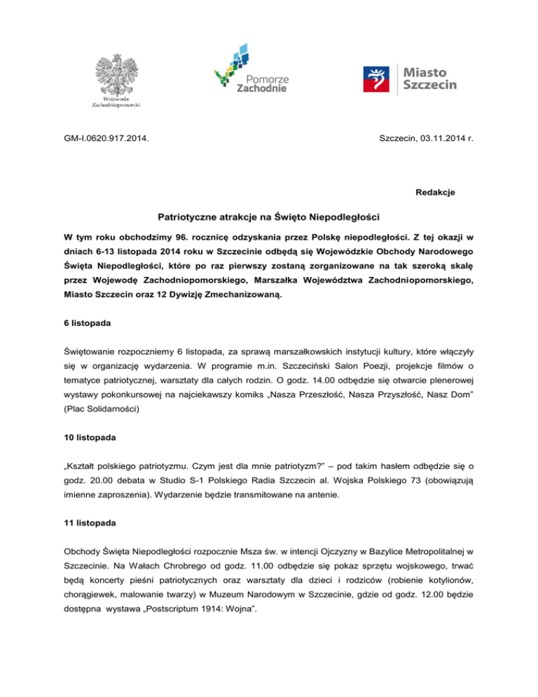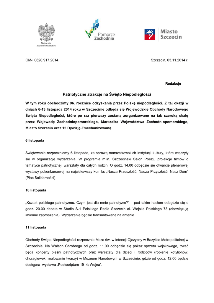 GM-I.0620.917.2014. Szczecin, 03.11.2014 r. Redakcje Patriotyczne atrakcje na Święto Niepodległości W tym roku obchodzimy 96. rocznicę odzyskania przez Polskę niepodległości. Z tej okazji w dniach 6-13 listopada 2014 roku w Szczecinie odbędą się Wojewódzkie Obchody Narodowego Święta Niepodległości, które po raz pierwszy zostaną zorganizowane na tak szeroką skalę przez Wojewodę Zachodniopomorskiego, Marszałka Województwa Zachodniopomorskiego, Miasto Szczecin oraz 12 Dywizję Zmechanizowaną. 6 listopada Świętowanie rozpoczniemy 6 listopada, za sprawą marszałkowskich instytucji kultury, które włączyły się w organizację wydarzenia. W programie m.in. Szczeciński Salon Poezji, projekcje filmów o tematyce patriotycznej, warsztaty dla całych rodzin. O godz. 14.00 odbędzie się otwarcie plenerowej wystawy pokonkursowej na najciekawszy komiks „Nasza Przeszłość, Nasza Przyszłość, Nasz Dom” (Plac Solidarności) 10 listopada „Kształt polskiego patriotyzmu. Czym jest dla mnie patriotyzm?” – pod takim hasłem odbędzie się o godz. 20.00 debata w Studio S-1 Polskiego Radia Szczecin al. Wojska Polskiego 73 (obowiązują imienne zaproszenia). Wydarzenie będzie transmitowane na antenie. 11 listopada Obchody Święta Niepodległości rozpocznie Msza św. w intencji Ojczyzny w Bazylice Metropolitalnej w Szczecinie. Na Wałach Chrobrego od godz. 11.00 odbędzie się pokaz sprzętu wojskowego, trwać będą koncerty pieśni patriotycznych oraz warsztaty dla dzieci i rodziców (robienie kotylionów, chorągiewek, malowanie twarzy) w Muzeum Narodowym w Szczecinie, gdzie od godz. 12.00 będzie dostępna wystawa „Postscriptum 1914: Wojna”. Od godz. 12.00 będzie możliwość zwiedzania gmachu Zachodniopomorskiego Urzędu Wojewódzkiego (ilość miejsc ograniczona, obowiązują zapisy – można się zgłaszać w dniach 6-7 listopada pod numerem telefonu 91 43 03 579), a o godz. 13.00 w Sali Rycerskiej wręczone zostaną medale i wyróżnienia zasłużonym w walce o wolność i niepodległość (obowiązują imienne zaproszenia – zapraszamy media). Na placu Adama Mickiewicza w godzinach 13.30-14.30 odbędzie się pokaz Klubu Kawaleryjskiego im. 12 Pułku Ułanów Podolskich z uczestnictwem harcerzy. Będzie to także finał historycznej gry miejskiej "Gdzie jest Marszałek?", realizowanej w ramach projektu "Pocztówki Niepodległości”. Godz. 15.30-17.00 to uroczystości patriotyczne na placu Szarych Szeregów, pod Pomnikiem Marszałka Józefa Piłsudskiego. Artyści Opery na Zamku przedstawią spektakl „Dla Niepodległej” (godz.18.00) z gościnnym występem Jerzego Zelnika i Tomasza Ciachorowskiego. Wydarzenie połączone będzie z wręczeniem nagród zwycięzcom konkursu na najciekawszy komiks „Nasza Przeszłość, Nasza Przyszłość, Nasz Dom” (Hala Opery na Zamku, ul. Energetyków 40 w Szczecinie, na spektakl zaproszono przedstawicieli środowisk kombatanckich, służb mundurowych, parlamentarzystów i samorządowców). Ostatnim wydarzeniem tego dnia będzie koncert organowy „Wielcy kompozytorzy i organiści Szczecina od XVI do XX w.” w Sanktuarium Najświętszego Serca Pana Jezusa w Szczecinie, ul. Bogurodzicy 3 (godz.19.00). 12 listopada Tego dnia zaplanowano lekcję historii „Wolność narodu jest najwyższą wartością”, która przybierze formę debaty oksfordzkiej z udziałem młodzieży licealnej (Zachodniopomorski Urząd Wojewódzki w Szczecinie – Sala Rycerska, ul. Wały Chrobrego 4, godz. 10.00-12.00, grupy zorganizowane). Od godz. 17.00 Zamek Książąt Pomorskich w Szczecinie zaprasza na spektakl teatralno-muzyczny pt. „Ułani, ułani, malowane dzieci” w wykonaniu uczniów z Publicznej Szkoły Podstawowej SzczecinGłębokie (Kino Zamek). 13 listopada Obchody zakończą się 13 listopada koncertem pieśni patriotycznych w wykonaniu Chóru „Kombatant” w Kinie Zamek na Zamku Książąt Pomorskich w Szczecinie. W załączeniu szczegółowy program wydarzeń Wojewódzkich Obchodów Narodowego Święta Niepodległości w Szczecinie.