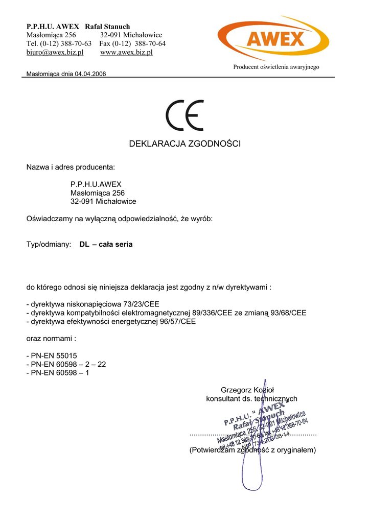 P.P.H.U. AWEX Rafał Stanuch Masłomiąca 256 32-091 Michałowice Tel. (0-12) 388-70-63 Fax (0-12) 388-70-64 [email protected] www.awex.biz.pl Producent oświetlenia awaryjnego Masłomiąca dnia 04.04.2006 DEKLARACJA ZGODNOŚCI Nazwa i adres producenta: P.P.H.U.AWEX Masłomiąca 256 32-091 Michałowice Oświadczamy na wyłączną odpowiedzialność, że wyrób: Typ/odmiany: DL – cała seria do którego odnosi się niniejsza deklaracja jest zgodny z n/w dyrektywami : - dyrektywa niskonapięciowa 73/23/CEE - dyrektywa kompatybilności elektromagnetycznej 89/336/CEE ze zmianą 93/68/CEE - dyrektywa efektywności energetycznej 96/57/CEE oraz normami : - PN-EN 55015 - PN-EN 60598 – 2 – 22 - PN-EN 60598 – 1 Grzegorz Kozioł konsultant ds. technicznych ............................................................. (Potwierdzam zgodność z oryginałem)