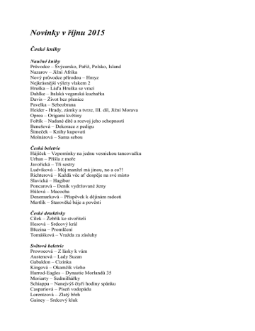 Novinky v říjnu 2015 České knihy Naučné knihy Průvodce – Švýcarsko, Paříž, Polsko, Island Nazarov – Jižní Afrika Nový průvodce přírodou – Hmyz Nejkrásnější výlety vlakem 2 Hruška – Láďa Hruška se vrací Dahlke – Italská veganská kuchařka Davis – Život bez pšenice Pavelka – Sebeobrana Heider - Hrady, zámky a tvrze, III. díl, Jižní Morava Oprea – Origami květiny Fořtík – Nadané dítě a rozvoj jeho schopností Benešová – Dekorace z pedigu Šimeček – Knihy kupovati Molnárová – Sama sebou Česká beletrie Hájíček – Vzpomínky na jednu vesnickou tancovačku Urban – Přišla z moře Javořická – Tři sestry Ludvíková – Můj manžel má jinou, no a co?! Richterová – Každá věc ať dospěje na své místo Slavická – Hagibor Poncarová – Deník vydržované ženy Hůlová – Macocha Denemarková – Příspěvek k dějinám radosti Mertlík – Starověké báje a pověsti České detektivky Cílek – Žebřík ke stvořiteli Hesová – Srdcový král Březina – Promlčení Tomášková – Vražda za zásluhy Světová beletrie Prowseová – Z lásky k vám Austenová – Lady Suzan Gabaldon – Cizinka Kingová – Okamžik všeho Harrod-Eagles – Dynastie Morlandů 35 Moriarty – Sedmilhářky Schiappa – Nanejvýš čtyři hodiny spánku Caspariová – Píseň vodopádu Lorentzová – Zlatý břeh Gainey – Srdcový kluk Urbaníková – Ztracené Pancolová – Muchachas 2 Koontz – Město Kessler – Baltská spojka Světové detektivky Edwardson – Poslední případ Bjork – V lese visí anděl Krefeld – Vyšinutí, Tonutí Dán – Rudý kapitán Rich – Nebezpečná známost Grebeengstrom – Obchodník z Omsku Ekmanová – Umíráček Lagercrantz – Dívka v pavoučí síti Patterson – Zpovědi podezřelé Carter – Jeden za druhým Cutter – Hlubina Doughty – Ulička Apple tree yard Preston – Projekt Kraken Lee – Signál Hannah – Ztráty a lži Skutečné příběhy Gogeisslová – Proč? Feyová – Deník bulimičky Arabský svět Saed – Psáno ve hvězdách Valková – Arabská dcera Děti Pospíšilová – Sportovní pohádky Komorous – Sportovní pohádky, aneb, Tucet příběhů pro malé (ne!!!)sportovce Policejní pohádky Goldflam – Pohádky: o nepotřebných věcech a lidech Reiderová – Klára, zloděj bonbónů a já Bussellová – Malá baletka Krátký – Bubáci Kratochvíl – Kouká roura na kocoura Třísková – Ondráškova abeceda Pospíšilová – Do lavic Lewman – SpongeBob – Houba na suchu Primusová – Pozor, červená! Sekora – Ferdův slabikář Dvořáková – Flouk a Líla Žiška – O botě, která si šlapala na jazyk Krolupperová – O modrém světle Mládež Peirce - Velkej frajer Nate Brezina – Čtyři kamarádi v akci Komiks Želvy Ninja Groening – Velká kniha Barta Simpsona Polské knihy Beletrie Grabowska – Stulecie winnych, tom II a III Domańska – Ulica pogodna Gargaś – Droga do domu Łysiak – Kresowa opowieść, tom I Lark – W kraine białych obłoków, Krzyk Maorysów, Pieśń Maorysów, Złoto Maorysów Kosin – Kołysanka dla Rosalie, Tajemnice Luizy Bein Kent – Skazana Lingas-Łoniewska – Obróńća nocy, Brudny świat, Szósty, Zakręty losu Olejniczak – Opiekunka, czyli, Ameryka widziana z fotela, Wypadek na ulicy Starowiślnej Opiat-Bojarska – Gdzie jesteś, Leno?, Klub Wrednych Matek Man – Męża poproszę May – Człowiek z vyspy Lewis, Jezioro tajemnic Malczewski – Moje miasto Macomber – Zielony zakątek Moyes – Razem będzie lepiej Rebizant-Siwiło – Przytul mnie, Zatrzymaj mnie, Wrzosowiska Roberts – Spełnić marzenia Szczęsna – Jutro pachnie cynamonem Trigiani – W stylu Valentine, Ciao, Valentine Wydra – Esesman i żydówka Wahlberg – Śmierć sprzedawcy dywanów, Pocieszyćiel Děti Święty Mikołaj wchodzi kominem Widmark – Tajemnica szkoły, Tajemnica gazety, Tajemnica pociągu, Pamiętnik detektywa Franklin zazdrosny o przyjaciela Franklin pomaga pokonać tremę Franklin i młodsze siostrzycki Franklin i kołko przyrodnicze Franklin dąsa się na siostrę