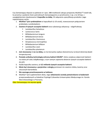 Czy Zamawiający dopuści w pakiecie nr I poz. 288 możliwość zakupu preparatu Multilac®? Jeżeli tak, to prosimy o podanie ilości potrzebnych Zamawiającemu w przeliczeniu 1 op. a la 10 kap. z uwzględnieniem dawkowania 1 kapsułka na dobę. W załączeniu specyfikacja produktu i jego najważniejsze cechy: 1. Multilac® jest synbiotykiem w kapsułkach (x 10 sztuk), nowoczesnym połączeniem probiotyku z prebiotykiem. 2. Zawiera 9 żywych szczepów bakterii oraz substancję odżywczą – oligofruktozę:  Lactobacillus helveticus  Lactoccocus lactis  Bifidobacterium longum  Bifidobacterium breve  Lactobacillus rhamnosus  Streptococcus termophilus  Bifidobacterium bifidum  Lactobacillus casei  Lactobacillus plantarum 3. Jest stosowany 1 raz na dobę, co ma korzystny wpływ ekonomiczny na koszt dziennej dawki terapeutycznej. 4. Posiada unikalną technologię ochrony bakterii MURE®, która zwiększa odporność bakterii na niskie pH soku żołądkowego, a tym samym zapewnia dotarcie żywych szczepów bakterii do jelit. 5. Każda kapsułka zawiera, aż 4,5 miliarda żywych szczepów bakterii. 6. Może być stosowany u pacjentów z alergią ponieważ nie zawiera mleka, kazeiny oraz sztucznych barwników. 7. Nie wymaga przechowywania w lodówce. 8. Multilac® jest suplementem diety. Jego właściwości zostały potwierdzone w badaniach przeprowadzonych w Katedrze Fizjologii Człowieka Uniwersytetu Medycznego im. Karola Marcinkowskiego w Poznaniu. Odp: Zamawiający nie wyraża zgody