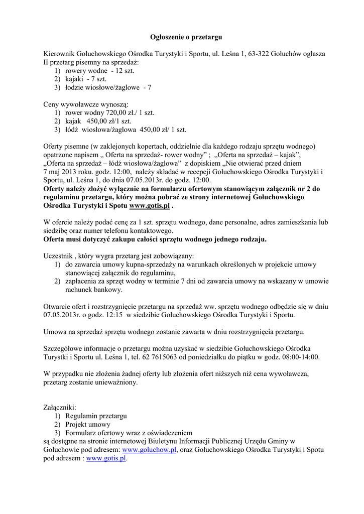 Ogłoszenie o przetargu Kierownik Gołuchowskiego Ośrodka Turystyki i Sportu, ul. Leśna 1, 63-322 Gołuchów ogłasza II przetarg pisemny na sprzedaż: 1) rowery wodne - 12 szt. 2) kajaki - 7 szt. 3) łodzie wiosłowe/żaglowe - 7 Ceny wywoławcze wynoszą: 1) rower wodny 720,00 zł./ 1 szt. 2) kajak 450,00 zł/1 szt. 3) łódź wiosłowa/żaglowa 450,00 zł/ 1 szt. Oferty pisemne (w zaklejonych kopertach, oddzielnie dla każdego rodzaju sprzętu wodnego) opatrzone napisem „ Oferta na sprzedaż- rower wodny” ; „Oferta na sprzedaż – kajak”, „Oferta na sprzedaż – łódź wiosłowa/żaglowa” z dopiskiem „Nie otwierać przed dniem 7 maj 2013 roku. godz. 12:00, należy składać w recepcji Gołuchowskiego Ośrodka Turystyki i Sportu, ul. Leśna 1, do dnia 07.05.2013r. do godz. 12:00. Oferty należy złożyć wyłącznie na formularzu ofertowym stanowiącym załącznik nr 2 do regulaminu przetargu, który można pobrać ze strony internetowej Gołuchowskiego Ośrodka Turystyki i Spotu www.gotis.pl . W ofercie należy podać cenę za 1 szt. sprzętu wodnego, dane personalne, adres zamieszkania lub siedzibę oraz numer telefonu kontaktowego. Oferta musi dotyczyć zakupu całości sprzętu wodnego jednego rodzaju. Uczestnik , który wygra przetarg jest zobowiązany: 1) do zawarcia umowy kupna-sprzedaży na warunkach określonych w projekcie umowy stanowiącej załącznik do regulaminu, 2) zapłacenia za sprzęt wodny w terminie 7 dni od zawarcia umowy na wskazany w umowie rachunek bankowy. Otwarcie ofert i rozstrzygnięcie przetargu na sprzedaż ww. sprzętu wodnego odbędzie się w dniu 07.05.2013r. o godz. 12:15 w siedzibie Gołuchowskiego Ośrodka Turystyki i Sportu. Umowa na sprzedaż sprzętu wodnego zostanie zawarta w dniu rozstrzygnięcia przetargu. Szczegółowe informacje o przetargu można uzyskać w siedzibie Gołuchowskiego Ośrodka Turystki i Sportu ul. Leśna 1, tel. 62 7615063 od poniedziałku do piątku w godz. 08:00-14:00. W przypadku nie złożenia żadnej oferty lub złożenia ofert niższych niż cena wywoławcza, przetarg zostanie unieważniony. Załączniki: 1) Regulamin przetargu 2) Projekt umowy 3) Formularz ofertowy wraz z oświadczeniem są dostępne na stronie internetowej Biuletynu Informacji Publicznej Urzędu Gminy w Gołuchowie pod adresem: www.goluchow.pl, oraz Gołuchowskiego Ośrodka Turystyki i Spotu pod adresem : www.gotis.pl.