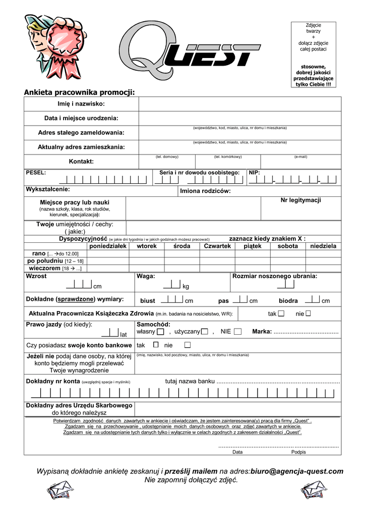 Zdjęcie twarzy + dołącz zdjęcie całej postaci stosowne, dobrej jakości przedstawiające tylko Ciebie !!! Ankieta pracownika promocji: Imię i nazwisko: Data i miejsce urodzenia: (województwo, kod, miasto, ulica, nr domu i mieszkania) Adres stałego zameldowania: (województwo, kod, miasto, ulica, nr domu i mieszkania) Aktualny adres zamieszkania: (tel. domowy) (tel. komórkowy) (e-mail) Kontakt: PESEL: Seria i nr dowodu osobistego: Wykształcenie: NIP: --- Imiona rodziców: Nr legitymacji Miejsce pracy lub nauki (nazwa szkoły, klasa, rok studiów, kierunek, specjalizacja): Twoje umiejętności / cechy: ( jakie:) Dyspozycyjność (w jakie dni tygodnia i w jakich godzinach możesz pracować) zaznacz kiedy znakiem X : poniedziałek wtorek środa Czwartek piątek sobota niedziela rano [... do 12.00] po południu [12 – 18] wieczorem [18 ...] Wzrost Waga: Rozmiar noszonego ubrania: cm Dokładne (sprawdzone) wymiary: kg biust cm pas cm Aktualna Pracownicza Książeczka Zdrowia (m.in. badania na nosicielstwo, WR): Prawo jazdy (od kiedy): lat Samochód: własny , użyczany Czy posiadasz swoje konto bankowe tak Jeżeli nie podaj dane osoby, na której konto będziemy mogli przelewać Twoje wynagrodzenie Dokładny nr konta (uwzględnij spacje i myślniki) , NIE biodra tak cm nie Marka: ..................................... nie (imię, nazwisko, kod pocztowy, miasto, ulica, nr domu i mieszkania) tutaj nazwa banku ...................................................................... Dokładny adres Urzędu Skarbowego do którego należysz Potwierdzam zgodność danych zawartych w ankiecie i oświadczam, że jestem zainteresowana(y) pracą dla firmy „Quest” . Zgadzam się na przechowywanie , udostępnianie moich danych osobowych oraz zdjęć zawartych w ankiecie. Zgadzam się na udostępnianie tych danych tylko i wyłącznie w celach zgodnych z zakresem działalności „Quest”. ...................................................................... Data Podpis Wypisaną dokładnie ankietę zeskanuj i prześlij mailem na adres:[email protected] Nie zapomnij dołączyć zdjęć.