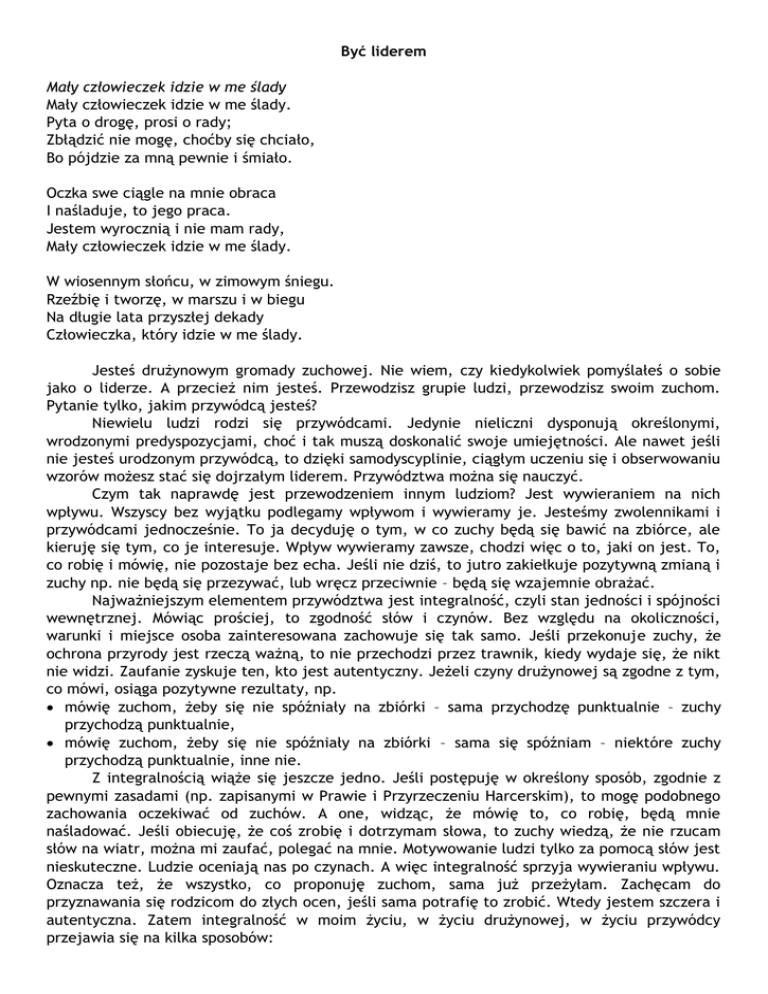 Być liderem Mały człowieczek idzie w me ślady Mały człowieczek idzie w me ślady. Pyta o drogę, prosi o rady; Zbłądzić nie mogę, choćby się chciało, Bo pójdzie za mną pewnie i śmiało. Oczka swe ciągle na mnie obraca I naśladuje, to jego praca. Jestem wyrocznią i nie mam rady, Mały człowieczek idzie w me ślady. W wiosennym słońcu, w zimowym śniegu. Rzeźbię i tworzę, w marszu i w biegu Na długie lata przyszłej dekady Człowieczka, który idzie w me ślady. Jesteś drużynowym gromady zuchowej. Nie wiem, czy kiedykolwiek pomyślałeś o sobie jako o liderze. A przecież nim jesteś. Przewodzisz grupie ludzi, przewodzisz swoim zuchom. Pytanie tylko, jakim przywódcą jesteś? Niewielu ludzi rodzi się przywódcami. Jedynie nieliczni dysponują określonymi, wrodzonymi predyspozycjami, choć i tak muszą doskonalić swoje umiejętności. Ale nawet jeśli nie jesteś urodzonym przywódcą, to dzięki samodyscyplinie, ciągłym uczeniu się i obserwowaniu wzorów możesz stać się dojrzałym liderem. Przywództwa można się nauczyć. Czym tak naprawdę jest przewodzeniem innym ludziom? Jest wywieraniem na nich wpływu. Wszyscy bez wyjątku podlegamy wpływom i wywieramy je. Jesteśmy zwolennikami i przywódcami jednocześnie. To ja decyduję o tym, w co zuchy będą się bawić na zbiórce, ale kieruję się tym, co je interesuje. Wpływ wywieramy zawsze, chodzi więc o to, jaki on jest. To, co robię i mówię, nie pozostaje bez echa. Jeśli nie dziś, to jutro zakiełkuje pozytywną zmianą i zuchy np. nie będą się przezywać, lub wręcz przeciwnie – będą się wzajemnie obrażać. Najważniejszym elementem przywództwa jest integralność, czyli stan jedności i spójności wewnętrznej. Mówiąc prościej, to zgodność słów i czynów. Bez względu na okoliczności, warunki i miejsce osoba zainteresowana zachowuje się tak samo. Jeśli przekonuje zuchy, że ochrona przyrody jest rzeczą ważną, to nie przechodzi przez trawnik, kiedy wydaje się, że nikt nie widzi. Zaufanie zyskuje ten, kto jest autentyczny. Jeżeli czyny drużynowej są zgodne z tym, co mówi, osiąga pozytywne rezultaty, np. mówię zuchom, żeby się nie spóźniały na zbiórki – sama przychodzę punktualnie – zuchy przychodzą punktualnie, mówię zuchom, żeby się nie spóźniały na zbiórki – sama się spóźniam – niektóre zuchy przychodzą punktualnie, inne nie. Z integralnością wiąże się jeszcze jedno. Jeśli postępuję w określony sposób, zgodnie z pewnymi zasadami (np. zapisanymi w Prawie i Przyrzeczeniu Harcerskim), to mogę podobnego zachowania oczekiwać od zuchów. A one, widząc, że mówię to, co robię, będą mnie naśladować. Jeśli obiecuję, że coś zrobię i dotrzymam słowa, to zuchy wiedzą, że nie rzucam słów na wiatr, można mi zaufać, polegać na mnie. Motywowanie ludzi tylko za pomocą słów jest nieskuteczne. Ludzie oceniają nas po czynach. A więc integralność sprzyja wywieraniu wpływu. Oznacza też, że wszystko, co proponuję zuchom, sama już przeżyłam. Zachęcam do przyznawania się rodzicom do złych ocen, jeśli sama potrafię to zrobić. Wtedy jestem szczera i autentyczna. Zatem integralność w moim życiu, w życiu drużynowej, w życiu przywódcy przejawia się na kilka sposobów: 1. Żyję zgodnie z tym, czego nauczam, 2. Robię to, co mówię, 3. Jestem uczciwa wobec wszystkich. Jeśli będę się rozmijać z faktami, utracę wiarygodność, 4. To, co najkorzystniejsze dla innych, przedkładam ponad własne interesy. Moja drużyna i zuchy znajdują się na pierwszym miejscu, to ich interesy traktuję priorytetowo. Im wyżej znajduję się w hierarchii, tym mniej mam osobistych opcji i uprawnień, 5. Jestem szczera i otwarta na krytykę ze strony zuchów i innych osób. Integralność nie jest cechą wrodzoną. Zdobywa się ją dzięki samodyscyplinie, podejmując decyzję zachowania uczciwej postawy we wszystkich sytuacjach życiowych. Weź kartkę i napisz, co cenisz w życiu. Jakie są twoje przekonania, czyli jakimi zasadami kierujesz się w życiu? Potem zapytaj kogoś, kto cię dobrze zna, w jakich obszarach twojego życia widać u ciebie zgodność słów i czynów, a w jakich niekonsekwencję. Nad tymi drugimi, po przemyśleniu, popracuj. Wszyscy przywódcy rozumieją, że ich obowiązkiem jest samodyscyplina i rozwój własny. Jako drużynowa mogę się rozwijać na wiele sposobów. Mogę kształcić się w dowolnym kierunku. Czytając, biorąc udział w warsztatach, szkoleniach, spotykając się z interesującymi ludźmi. Wszystko to mogę robić w ramach próby na stopień instruktorski lub harcerski. Nie może być przewodnikiem dla innych ktoś, kto sam siebie nie potrafi poprowadzić. „Głupcy chcą zapanować nad światem, mędrcy chcą zapanować nad sobą”. Trzeba zacząć od siebie, a im wcześniej to zrobię, tym lepiej. Aby w przyszłości panować nad sobą, dziś muszę zacząć od rzeczy małych. Nie mogę mieć wszystkiego od razu, powolne przybliżanie się do cel zaowocuje dotarciem do niego. „Sukces nie zależy od tego, jak dobrze spełniasz to, co sprawia ci przyjemność, a od tego, jak sumiennie wykonujesz to, czego nie lubisz”. Jak łatwiej zorganizować swoje działanie? Trzeba m.in.: wybrać priorytety, czyli ustalić kolejność działań wpisać działania do kalendarza pozostawić czas na nieoczekiwane wypadki zajmować się jedną sprawą w danym czasie zorganizować sobie miejsce pracy skupić uwagę na rezultatach, a nie na samych działaniach. Jako lider jestem odpowiedzialny: za to, kim jestem (to ja o tym decyduję) za to, co mogę zrobić (za dokończenie swojego dzieła) za to, co przyjąłem na siebie wobec tych, którzy za mną podążają, czyli wobec moich zuchów. Nie wywyższam się nad nimi, ale przewyższam je zakresem mojej odpowiedzialności. Z podejmowaniem jakichkolwiek działań łączy się też konieczność rozliczania się przed samym sob