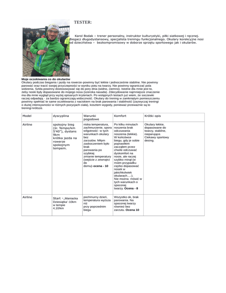 TESTER: Karol Bodak – trener personalny, instruktor kulturystyki, piłki siatkowej i ręcznej. Biegacz długodystansowy, specjalista treningu funkcjonalnego. Okulary korekcyjne nosi od dzieciństwa – bezkompromisowy w doborze sprzętu sportowego jak i okularów. Moje oczekiwania co do okularów Okulary podczas biegania i jazdy na rowerze-powinny być lekkie i jednocześnie stabilne. Nie powinny parować oraz tracić swojej przyczepności w wyniku potu na twarzy. Nie powinny ograniczać pola widzenia. Szkła powinny dostosowywać się do pory dnia (widno, ciemno). Istotne dla mnie jest to, żeby noski były dopasowane do mojego nosa (szeroka nasada). Zdecydowanie najmniejsze znaczenie ma dla mnie wygląd przy wyżej opisanych kryteriach. Po wstępnych testach już wiem, że soczewki raczej odpadają - za bardzo ograniczają widoczność. Okulary do trening w zamkniętym pomieszczeniu powinny spełniać te same oczekiwania z naciskiem na brak parowania i stabilność (zazwyczaj treningi o dużej intensywności w różnych pozycjach ciała), kosztem wygody, ponieważ przeważnie są to treningi krótsze. Model dyscyplina Warunki pogodowe Komfort Krótki opis Airline spokojny bieg (śr. Tempo/km 5’40”), dystans 9km krótka jazda na rowerze spokojnym tempem. niska temperatura, zachmurzenie, spora wilgotność- w tych warunkach okulary bez zarzutów. Miłym zaskoczeniem było brak parowania po szybkiej zmianie temperatury (wejście z zewnątrz do domu)-ocena - 10 Po kilku minutach noszenia brak odczuwania noszenia (lekkie). W końcówce biegu, gdy je sobie poprawiłem zacząłem przez chwile odczuwać dyskomfort na nosie, ale raczej szybko minął (w moim przypadku ciężko dopasować nosek w jakichkolwiek okularach....:). Nie można mówić w tych warunkach o spoconej twarzy. Ocena - 8 Okulary lekkie, dopasowane do twarzy, stabilne, nieparujące. Ciekawy sportowy desing. Airline Start -„Maniacka Dziesiątka’-10km w tempie 4,10/km pochmurny dzień, temperatura wyższa niż przy poprzednim biegu Wszystko ok, brak parowania. Na spoconej twarzy również bez zarzutu. Ocena 10