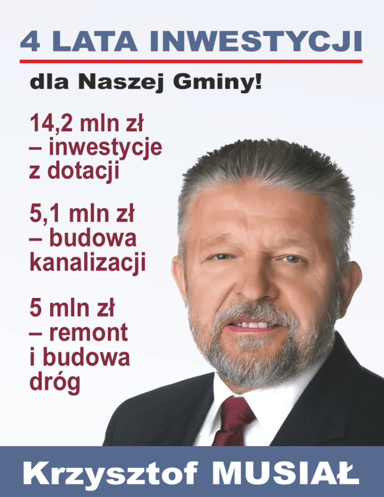4 LATA INWESTYCJI dla Naszej Gminy! 14,2 mln zł – inwestycje z dotacji 5,1 mln zł – budowa kanalizacji 5 mln zł – remont i budowa dróg Krzysztof MUSIAŁ Za nami dobre cztery lata. Lata pozytywnych zmian i konkretnych osiągnięć: nowe drogi, inwestycje, miejsca w przedszkolach, ciepłe i zdrowe posiłki dla dzieci i młodzieży. Czas wielu, wartych kontynuacji, przedsięwzięć i przede wszystkim odzyskania finansowej stabilności Gminy. Wizualizacja inwestycji przeprowadzonych w Gminie Mogilany w obecnej kadencji (2011-2014) 7 22 Mieszkam tu i tak jak Państwo wiem, że jest wciąż dużo do zrobienia. Wiem też, że teraz, gdy finanse gminy są bezpieczne, a nowo wybrani Radni gwarantują zgodną współpracę, możemy znacznie więcej. I jestem gotów na ciężką pracę, by te szanse wykorzystać. 21 6 LUSINA 8 GAJ 9 11 CHOROWICE 4 BUKÓW 10 3 20 19 5 17 18 15 1 Proszę o Państwa głos. 7 2 Teraz wszystko w Państwa rękach. Czy w kolejnych czterech latach będziemy dalej budować przyjazne miejsce do życia, czy podmiejskie blokowiska? Postawimy na realne działania, czy naiwne obietnice? Wreszcie, czy wybierzemy kogoś spośród nas, czy spoza Gminy Mogilany? To mieszkańcy naszej Gminy – idąc do wyborów, lub zostając w domu – zdecydują dokąd zmierzamy Proszę Państwa o to, by rozpoczęte zmiany na lepsze były kontynuowane. Proszę o możliwość zgodnej, wspólnej pracy dla dobra Gminy Mogilany. LIBERTÓW BRZYCZYNA KONARY 13 16 12 Krzysztof Musiał, Wójt Gminy Mogilany 28 14 KULERZÓW MOGILANY LEGENDA DO MAPY 1. Remont Domu Ludowego 2. Przygotowanie stabilizacji osuwiska (dokumentacja) 3. Rozbudowa wodociągu 4. Budowa ogólnodostępnego placu zabaw „Kraina wyobraźni” 5. Dokończenie budowy sali gimnastycznej przy SP, remont szkoły 6. Modernizacja przedszkola 7. Rozbudowa kanalizacji sanitarnej ul. Zgodna 8. Przebudowa skrzydła szkoły z przeznaczeniem na przedszkole 9. Budowa zaplecza sportowego LKS Gajowianka 10. Kuchnia gminna 11. Nawierzchnia asfaltowa przy kuchni 12. Kanalizacja sanitarna, ul. Cicha 13. Umocnienie skarpy wokół boiska LKS 14. Budowa chodnika przy ul. Zakopiańskiej 15. Utwardzenie parkingu 16. Termomodernizacja budynku SP i Gimnazjum 17. Remont i malowanie dachu na budynku SP i Gimnazjum 18. Przebudowa piwnic budynku UG na przychodnię rehabilitacyjną 19. Termomodernizacja budynku OSP 20. Zarurowanie cieku przy boisku LKS Mogilany 21. Rozbudowa kanalizacji sanitarnej – etap I 22. Modernizacja starej części oczyszczalni 23. Kanalizacja sanitarna – etap I 24. Budowa przepustu w ciągu drogi gminnej, ul. Łobzowska 25. Przebudowa mostu na potoku Włosańka 26. Budowa przepustu w ciągu drogi gminnej, ul. Podlas 27. Nowy dach SP 28. Budowa ogólnodostępnego placu zabaw 24 25 26 23 27 WŁOSAŃ Budowa i remonty dróg nowe nawierzchnie tłuczniowe nowe nawierzchnie asfaltowe odtworzenie nawierzchni asfaltowych Wójt Musiał jak nikt inny rozumie potrzeby swojej gminy. W Mogilanach się urodził, dorastał, stworzył znany w całej Polsce, a nawet zagranicą Ośrodek Kultury. Wiem, że we wszystkich swoich działaniach kieruje się dobrem gminy i jej mieszkańców. Wójt chce, żeby gmina rozwijała się w sposób zrównoważony, a nie została zalana betonem i zabudowana blokami, do czego dążą liczni deweloperzy. Krzysztof Musiał to wyjątkowo uczciwy, prawy człowiek, co dzisiaj jest rzadkością! Wójta Musiała poznałem przy okazji walki o bezpieczne przejścia przez „Zakopiankę”. Kiedy było trzeba, nie wahał się dzwonić, pukać, prosić, apelować. Dzięki naszej współpracy odbyły się spotkania w Sejmie i Ministerstwie Infrastruktury, których efektem jest przyspieszenie prac nad kładkami i wiaduktami w Gminie Mogilany. Szanuję jego wielkie zaangażowanie i wolę budowania zgody, ponad podziałami. Bogdan Pęk, Senator RP Józef Lassota, Poseł RP Mój plan na kolejne 4 lata 1. Dalszy rozwój inwestycji poprzez skuteczne pozyskiwanie funduszy, w tym termomodernizacja szkół w Lusinie, Gaju i Konarach. 2. Poprawa jakości dróg, oświetlenia ulic, budowa chodników i bezpiecznych przejść i dojazdów do szkół, w tym pętla w Chorowicach, ul. Św. Floriana w Lusinie, ul. Zgodna w Libertowie. 3. Bezpieczne przejścia i przejazdy przez „zakopiankę” (kładka w Gaju, walka o wiadukt Zadziele-Widokowa). 4. Dalsza budowa sieci kanalizacyjnej oraz prace nad ujęciem i odprowadzeniem wód opadowych. 5. Rozwój bazy szkolnej i przedszkolnej, w tym: budowa hali sportowej i dodatkowych sal lekcyjnych w Mogilanach, przystosowanie na cele oświatowo-kulturalne sali w strażnicy w Mogilanach, dokończenie skrzydła szkoły w Konarach, zakończenie remontu przedszkola w Libertowie, przystosowanie na cele oświatowe pustych pomieszczeń w szkole we Włosani. 6. Rozwój bazy sportowej i rekreacyjnej, budowa boiska w Mogilanach, dalszy rozwój centrum sportowego w Gaju, budowa ścieżek rowerowych we współpracy z LGD„Blisko Krakowa”. 7. Budowa placów zabaw, w tym: w Lusinie, Mogilanach, Gaju i Bukowie. 8. Rozwój ośrodka kultury, zadbanie o dziedzictwo kulturowe gminy, w tym starania o uzyskanie środków na przeprowadzenie rewitalizacji dworu, parku i rynku w Mogilanach. 9. Wspieranie przedsiębiorczości – utworzenie strefy ekonomicznej i powołanie Gminnej Rady Przedsiębiorców. 10. Rozwój Ośrodka Zdrowia, w tym przychodni rehabilitacyjnej, podjęcie zdecydowanych działań w celu zawarcia umowy z NFZ na bezpłatne usługi dla pacjentów. To tylko wybrane z zadań, jakie stawiam przed sobą i Radą Gminy na kolejne lata. Dotrzymałem obietnic poprzednio, więc i teraz, gdy mogę liczyć na zgodną współpracę z Radnymi, możecie Państwo być pewni, że do 2018 r. powyższe punkty staną się faktem. Pełna wersja programu: www.wojtmusial.pl Krzysztof Musiał Wójt Gminy Mogilany Krzysztof Musiał, zawsze z dumą podkreśla, że pochodzi z Mogilan. To prawdziwy lokalny patriota zatroskany o los s