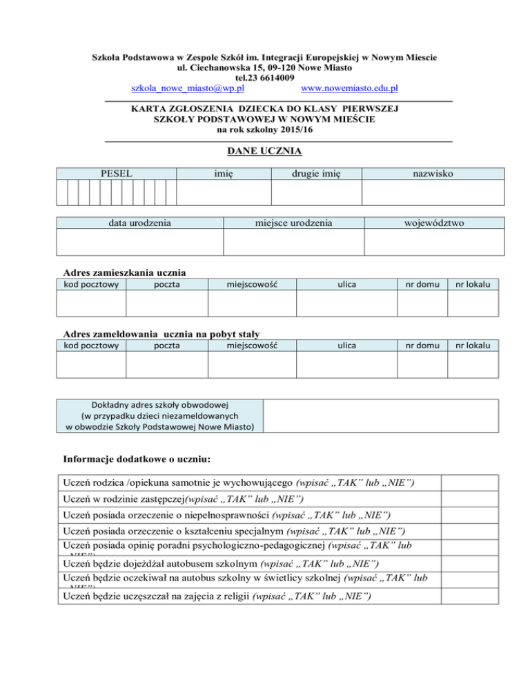 Szkoła Podstawowa w Zespole Szkół im. Integracji Europejskiej w Nowym Miescie ul. Ciechanowska 15, 09-120 Nowe Miasto tel.23 6614009 [email protected] www.nowemiasto.edu.pl KARTA ZGŁOSZENIA DZIECKA DO KLASY PIERWSZEJ SZKOŁY PODSTAWOWEJ W NOWYM MIEŚCIE na rok szkolny 2015/16 DANE UCZNIA imię PESEL data urodzenia drugie imię nazwisko województwo miejsce urodzenia Adres zamieszkania ucznia kod pocztowy poczta miejscowośd ulica nr domu nr lokalu ulica nr domu nr lokalu Adres zameldowania ucznia na pobyt stały kod pocztowy poczta miejscowośd Dokładny adres szkoły obwodowej (w przypadku dzieci niezameldowanych w obwodzie Szkoły Podstawowej Nowe Miasto) Informacje dodatkowe o uczniu: Uczeń rodzica /opiekuna samotnie je wychowującego (wpisać „TAK” lub „NIE”) Uczeń w rodzinie zastępczej(wpisać „TAK” lub „NIE”) Uczeń posiada orzeczenie o niepełnosprawności (wpisać „TAK” lub „NIE”) Uczeń posiada orzeczenie o kształceniu specjalnym (wpisać „TAK” lub „NIE”) Uczeń posiada opinię poradni psychologiczno-pedagogicznej (wpisać „TAK” lub „NIE”) Uczeń będzie dojeżdżał autobusem szkolnym (wpisać „TAK” lub „NIE”) Uczeń będzie oczekiwał na autobus szkolny w świetlicy szkolnej (wpisać „TAK” lub „NIE”) Uczeń będzie uczęszczał na zajęcia z religii (wpisać „TAK” lub „NIE”) DANE RODZICÓW / PRAWNYCH OPIEKUNÓW Dane matki / prawnej opiekunki imię nazwisko telefon kontaktowy (jeżeli rodzic wyraża zgodę) Dane ojca / prawnego opiekuna imię nazwisko telefon kontaktowy (jeżeli rodzic wyraża zgodę) Adres zamieszkania matki / prawnej opiekunki kod pocztowy poczta miejscowość ulica nr domu nr lokalu Adres zamieszkania ojca / prawnego opiekuna kod pocztowy poczta miejscowość ulica nr domu nr lokalu Inne telefony kontaktowe Oświadczam, że dziecko................................................................................................... realizuje (zrealizowało) roczny obowiązek przygotowania przedszkolnego ....................................................................................................................................................... ................................................................................................................................................................... (podać adres placówki) Oświadczam/y iż dane w niniejszej karcie są zgodne ze stanem faktycznym. Zobowiązuję/emy się do informowania Dyrektora Zespołu Szkół w Nowym Mieście o każdorazowej zmianie powyższych danych. Przetwarzanie danych odbywać się będzie zgodnie z ustawą z dnia 29 sierpnia 1997 r. o ochronie danych osobowych (Dz. U. z 2002 r. Nr 101, poz. 926 z późn. zm.). Zostałam/em pouczona/ y o prawie wglądu do moich/naszych danych oraz zmiany tych danych. Oświadczam/y, że wyrażam/y zgodę na przetwarzanie danych osobowych podanych w karcie. ..................................................................................... (czytelny podpis rodziców/ prawnych opiekunów) WYPEŁNIA SZKOŁA Decyzja o przyjęciu bądź nieprzyjęciu ucznia do szkoły Data i podpis dyrektora szkoły