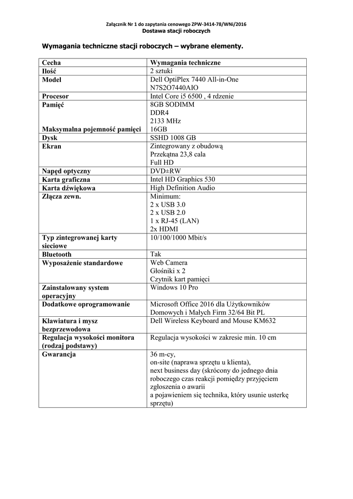 Załącznik Nr 1 do zapytania cenowego ZPW-3414-78/WNi/2016 Dostawa stacji roboczych Wymagania techniczne stacji roboczych – wybrane elementy. Cecha Ilość Model Procesor Pamięć Maksymalna pojemność pamięci Dysk Ekran Napęd optyczny Karta graficzna Karta dźwiękowa Złącza zewn. Typ zintegrowanej karty sieciowe Bluetooth Wyposażenie standardowe Zainstalowany system operacyjny Dodatkowe oprogramowanie Klawiatura i mysz bezprzewodowa Regulacja wysokości monitora (rodzaj podstawy) Gwarancja Wymagania techniczne 2 sztuki Dell OptiPlex 7440 All-in-One N7S2O7440AIO Intel Core i5 6500 , 4 rdzenie 8GB SODIMM DDR4 2133 MHz 16GB SSHD 1008 GB Zintegrowany z obudową Przekątna 23,8 cala Full HD DVD±RW Intel HD Graphics 530 High Definition Audio Minimum: 2 x USB 3.0 2 x USB 2.0 1 x RJ-45 (LAN) 2x HDMI 10/100/1000 Mbit/s Tak Web Camera Głośniki x 2 Czytnik kart pamięci Windows 10 Pro Microsoft Office 2016 dla Użytkowników Domowych i Małych Firm 32/64 Bit PL Dell Wireless Keyboard and Mouse KM632 Regulacja wysokości w zakresie min. 10 cm 36 m-cy, on-site (naprawa sprzętu u klienta), next business day (skrócony do jednego dnia roboczego czas reakcji pomiędzy przyjęciem zgłoszenia o awarii a pojawieniem się technika, który usunie usterkę sprzętu)