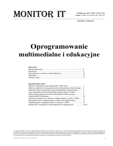 Monitor it Publikacja DiS, ISSN 1429-2785 Numer 1 (346), 10 stycznia 2011, Rok XV Analiza numeru Oprogramowanie multimedialne i edukacyjne Spis treci Rynek edukacyjny ................................................................................... 8 Rynek gier ............................................................................................... 9 Rola Internetu w sektorze multimedialnym ............................................ 10 Mobilnoæ ............................................................................................... 12 Wartoæ rynku ......................................................................................... 12 Spis ilustracji i tabel Wartoæ i dynamika rynku multimediów 2005-2013 .............................. 7 Zakres przedmiotowy oprogramowania multimedialno-edukacyjnego .. 8 Struktura sektora oprogramowania multimedialno-edukacyjnego ......... 8 Typy oprogramowania multimedialno-edukacyjnego w Polsce ............. 9 Zastosowania oprogramowania multimedialno-edukacyjnego ............... 9 Analiza SWOT dla sektora ..................................................................... 10 Najwiêksi producenci w sektorze wed³ug udzia³u w rynku w 2009 r. .... 11 Oprogramowanie wed³ug kategorii wiekowych u¿ytkowników ............. 11 50 producentów oprogramowania w sektorze w 2009 r. ........................ 12 Katalog 300+ programów multimedialnych i edukacyjnych .................. 14-43 © Copyright by DiS, styczeñ 2011. Raport podlega ochronie prawem autorskim. Oznacza to, ¿e w³aciciel niniejszego egzemplarza mo¿e swobodnie wykorzystywaæ jego treæ do u¿ytku wewnêtrznego. W szczególnoci powo³ywaæ siê na niniejszy raport z podaniem ród³a w prowadzeniu swej dzia³alnoci: seminariów, a tak¿e we wszelkich publikacjach sygnowanych znakami identyfikacyjnymi nabywcy. Redystrybucja zabroniona: w³aciciel egzemplarza raportu bez dodatkowego pisemnego zezwolenia nie ma prawa kopiowaæ go, ani przekazywaæ innym podmiotom ¿adnej czêci raportu, ani odsprzedawaæ informacji w nim zawartych. DiS, Monitor IT, numer 1 (346), 10 stycznia 2011 6