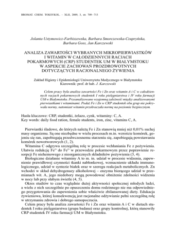 BROMAT. CHEM. TOKSYKOL. – XLII, 2009, 3, str. 709 – 713 Jolanta Ustymowicz-Farbiszewska, Barbara Smorczewska-Czupryńska, Barbara Goss, Jan Karczewski ANALIZA ZAWARTOŚCI WYBRANYCH MIKROPIERWIASTKÓW I WITAMIN W CAŁODZIENNYCH RACJACH POKARMOWYCH (CRP) STUDENTEK UM W BIAŁYMSTOKU W ASPEKCIE ZACHOWAŃ PROZDROWOTNYCH DOTYCZĄCYCH RACJONALNEGO ŻYWIENIA Zakład Higieny i Epidemiologii Uniwersytetu Medycznego w Białymstoku Kierownik: prof. dr hab. J. Karczewski Celem pracy była analiza zawartości Fe i Zn oraz witamin A i C w całodziennych racjach pokarmowych studentek I roku pielęgniarstwa i IV roku farmacji UM w Białymstoku. Przeanalizowano wzajemną zależność między analizowanymi pierwiastkami i witaminami. Podaż Fe i Zn w CRP studentek obu grup nie pokrywała normy, natomiast witamin przekraczała normę na poziomie bezpiecznym. Hasła kluczowe: CRP, studentki, żelazo, cynk, witaminy: C, A. Key words: daily food ration, female students, iron, zinc, vitamins C, A. Pierwiastki śladowe, do których należą Fe i Zn stanowią mniej niż 0,01% suchej masy organizmu. Są one niezbędne w wielu procesach m.in. wzroście komórek, gojeniu się ran, zapobiegają przedwczesnemu starzeniu się, zapobiegają powstawaniu komórek nowotworowych (1, 2). Witamina C odgrywa szczególną rolę w procesie wchłaniania Fe z pożywienia. Ułatwia redukcję Fe3+ do Fe2+ w przewodzie pokarmowym przez poprawienie resorpcji Fe niehemowego z nieorganicznych składników pożywienia (3, 4). Biologiczne działanie witaminy A to m. in. udział w procesie widzenia, zapewnienie prawidłowej czynności tkanki nabłonkowej, wzmacnienie układu immunologicznego, udział w syntezie białek oraz w szeregu reakcjach metabolicznych. Zn wchodzi w skład dehydrogenazy alkoholowej – enzymu biorącego udział w przemianach wit. A, jego niedobory mogą powodować obniżenie zdolności widzenia w nocy lub przy słabym świetle (4, 5). Okres studiów to czas względnie dużej aktywności społecznej młodych ludzi, a wielu z nich szczególnie po opuszczeniu domu rodzinnego nie ma odpowiedniego przygotowania do zapewnienia sobie właściwie zbilansowanej diety. Edukacja żywieniowa, której konsekwencją jest racjonalne odżywianie pełni szczególną rolę w utrzymaniu zdrowia i dobrego samopoczucia. Celem pracy była analiza zawartości Fe i Zn oraz witamin A i C w dietach studentek I roku pielęgniarstwa (grupa badana) oraz grupy kontrolnej, którą stanowiły CRP studentek IV roku farmacji UM w Białymstoku. 710 Nr 3 J. Ustymowicz-Farbiszewska i inni MATERIAŁ I METODY Od 74 studentek I roku pielęgniarstwa (grupa badana) i 71 studentek IV roku farmacji (grupa kontrolna) zebrano anonimowe, 3-dniowe, 24 godz. wywiady żywieniowe. Badania obejmowały wszystkie osoby studiujące z ww. lat studiów. Średnia wieku studentek grupy badanej wynosiła 20,2 ± 0,6, a grupy kontrolnej 23,4 ± 0,6. Wielkość spożytych porcji oszacowano na podstawie ,,Albumu fotografii produktów i potraw” (6). Zawartość Fe, Zn i witamin C i A w CRP obliczono korzystając z programu FOOD-3, uwzględniającego straty składników mineralnych i witamin podczas zabiegów kulinarnych i technologicznych. Uzyskane wyniki porównano z dziennymi normami na poziomie bezpiecznym odpowiednimi do płci i wieku dla osób o umiarkowanej aktywności fizycznej a następnie poddano analizie statystycznej przy pomocy testu t-Studenta. Przyjęto, że dwie średnie różnią się między sobą jeżeli p < 0,05. Za prawidłowe uznano wartości zawarte w zakresie od 90 do 110% ww. normy (7). Określono w obu grupach odsetki diet z zawartością pierwiastków i witamin poniżej normy, w normie i powyżej normy oraz procent realizacji normy na Fe, Zn i witaminy. WYNIKI I ICH OMÓWIENIE W tabeli I przedstawiono średnią zawartość żelaza i cynku, oraz witamin, procent realizacji norm na mikropierwiastki i witaminy w CRP grup badanej i kontrolnej. Średnia zawartość Fe w 3-dniowych racjach pokarmowych studentek pielęgniarstwa była bardzo niska, bo wynosiła 8,2 mg/ dzień. Stanowi to około 59% normy na poziomie bezpiecznym, natomiast w jadłospisach studentek grupy kontrolnej zawartość tego mikropierwiastka była nieznacznie wyższa, a procent realizacji normy także wyższy bo wynosił prawie 66%. Średnia zawartość Zn w jadłospisach grupy badanej znajdowała się poniżej poziomu bezpiecznego Ta b e l a I. Zawartość żelaza, witaminy C, cynku, witaminy A w CRP studentek grupy badanej i kontrolnej Ta b l e I. The content of Fe, vitamin C, Zn and vitamin A in daily food rations of female students in the study and control group Składniki CRP – x (mg) Fe Wit. C Zn Wit. A Zakres (mg) Grupa badana n = 74 Grupa kontrolna n = 71 8,2 9,2 3,03–15,0 2,9–27,9 SD (mg) 2,87 3,88 % realizacji normy – x (mg) 58,7 65,7 76,9 76,6 Zakres (mg) 7,36–248,3 2,5–197,5 SD (mg) 46,9 43,9 % realizacji normy – x (mg) 128,1 127,6 7,96 8,65 Zakres (mg) 3,2–22,0 2,78–23,0 SD (mg) 3,19 3,68 % realizacji normy – x (μg) 79,6 86,5 892,8 870,2 126,0–5996,3 82,0–5034,4 SD (μg) 977,6 754,6 % realizacji normy 148,8 145,0 Zakres (μg) Nie stwierdzono różnic istotnych statystycznie Nr 3 Zawartość wybranych mikropierwiastków i witamin w CRP studentek UMB 711 i wynosiła 7,96 mg/dzień, co stanowiło 79,6% realizacji normy. W grupie kontrolnej średnia zawartość pierwiastka w dietach była wyższa bo wynosiła 8,65 mg/dzień, co stanowiło 86,5% realizacji normy. Różnice średnich zawartości Fe i Zn w CRP badanych obu grup są statystycznie nieistotne. Niedobory Fe i w mniejszym stopniu Zn w dietach młodych kobiet wykazuje wielu autorów (8,9). Schlegel-Zawadzka i współpr. stwierdzili 80% zawartość Fe w dietach młodych kobiet z Wielkopolski (średni poziom zawartości Fe w CRP wynosił 11,2 mg) i prawidłową zawartość Zn (8). Marzec i współpr. w dietach studentów Akademii Medycznej w Lublinie stwierdzili niedobór Fe wynoszący ok. 30% 