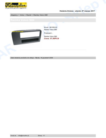 e l k -S i p Ostatnia Zmiana : wtorek, 07 marzec 2017 Adaptory > Volvo > Ramki > Ramka Volvo S80 Ramka Volvo S80 O I D Nr art.: 281352-03 Ramka Volvo S80 Producent: - A U A R Ramka Volvo S80 Cena: 57,90PLN Data dodania produktu do sklepu : ¶roda, 16 grudzieñ 2009 Email do: - [email protected] Strony 1/1
