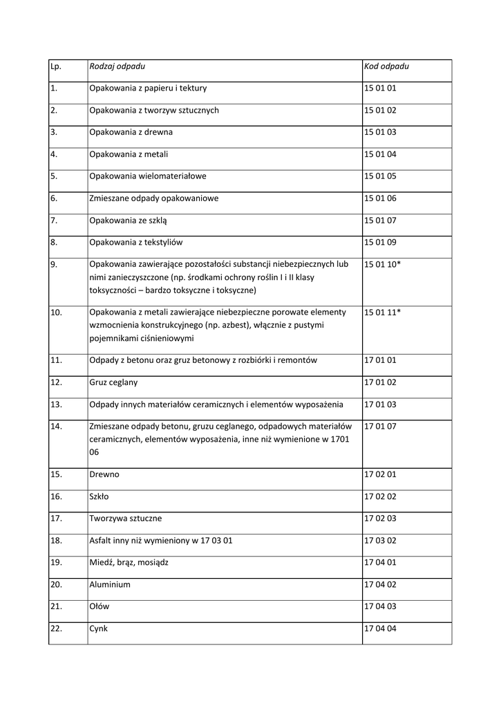 Lp. Rodzaj odpadu Kod odpadu 1. Opakowania z papieru i tektury 15 01 01 2. Opakowania z tworzyw sztucznych 15 01 02 3. Opakowania z drewna 15 01 03 4. Opakowania z metali 15 01 04 5. Opakowania wielomateriałowe 15 01 05 6. Zmieszane odpady opakowaniowe 15 01 06 7. Opakowania ze szklą 15 01 07 8. Opakowania z tekstyliów 15 01 09 9. Opakowania zawierające pozostałości substancji niebezpiecznych lub nimi zanieczyszczone (np. środkami ochrony roślin I i II klasy toksyczności – bardzo toksyczne i toksyczne) 15 01 10* 10. Opakowania z metali zawierające niebezpieczne porowate elementy wzmocnienia konstrukcyjnego (np. azbest), włącznie z pustymi pojemnikami ciśnieniowymi 15 01 11* 11. Odpady z betonu oraz gruz betonowy z rozbiórki i remontów 17 01 01 12. Gruz ceglany 17 01 02 13. Odpady innych materiałów ceramicznych i elementów wyposażenia 17 01 03 14. Zmieszane odpady betonu, gruzu ceglanego, odpadowych materiałów ceramicznych, elementów wyposażenia, inne niż wymienione w 1701 06 17 01 07 15. Drewno 17 02 01 16. Szkło 17 02 02 17. Tworzywa sztuczne 17 02 03 18. Asfalt inny niż wymieniony w 17 03 01 17 03 02 19. Miedź, brąz, mosiądz 17 04 01 20. Aluminium 17 04 02 21. Ołów 17 04 03 22. Cynk 17 04 04 23. Żelazo i stal 17 04 05 24. Cyna 17 04 06 25. Mieszaniny metali 17 04 07 26. Kable inne niż wymienione w 17 04 10 17 04 11 27. Tłuczeń torowy (kruszywo) inny niż wymieniony w 17 05 07 17 05 08 28. Materiały izolacyjne inne niż wymienione w 1706 01 i 17 06 03 17 06 04 29. Materiały konstrukcyjne zawierające gips inne niż wymienione w 17 08 17 08 02 01 30. Zmieszane odpady z budowy, remontów i demontażu inne niż wymienione w 17 09 01, 17 09 02 i 17 09 03 17 09 04 31. Papier i tektura 20 01 01 32. Szkło 20 01 02 33. Odpady kuchenne ulegające biodegradacji 20 01 08 34. Odzież 20 01 10 35. Tekstylia 20 01 11 36. Rozpuszczalniki 20 01 13* 37. Kwasy 20 01 14* 38. Alkalia 20 01 15* 39. Odczynniki fotograficzne 20 01 17* 40. Środki ochrony roślin I i II klasy toksyczności 20 01 19* 41. Lampy fluorescencyjne i inne odpady zawierające rtęć 20 01 21* 42. Urządzenia zawierające freony 20 01 23* 43. Oleje i tłuszcze jadalne 20 01 25 44. Oleje i tłuszcze inne niż wymienione w 20 01 25 20 01 26* 45. Farby, tusze, farby drukarskie, kleje lepiszcze i żywice zawierające substancje inne niż wymienione w 20 01 27 20 01 27* 46. Farby, tusze, farby drukarskie, kleje, lepiszcze i żywice inne niż wymienione w 20 01 27 20 01 28 47. Detergenty zawierające substancje niebezpieczne 20 01 29* 48. Detergenty inne niż wymienione w 20 01 29 20 01 30 49. Leki cytotoksyczne i cytostatyczne 20 01 31* 50. Leki inne niż wymienione w 20 01 31 20 01 32 51. Baterie i akumulatory łącznie z bateriami i akumulatorami wymienionymi w 16 06 01, 16 06 02 lub 16 06 03 oraz niesortowane baterie i akumulatory zawierające te baterie 20 01 33 52. Baterie i akumulatory inne niż wymienione w 20 01 21, 20 01 23 i 20 01 20 01 34 35 53. Zużyte urządzenia elektryczne i elektroniczne inne niż wymienione w 20 20 01 35* 01 21 i 20 01 23 zawierające niebezpieczne składniki 54. Zużyte urządzenia elektryczne i elektroniczne inne niż wymienione w 20 20 01 36 01 21 , 20 01 23 i 20 01 35 55. Drewno zawierające substancje niebezpieczne 20 01 37* 56. Drewno inne niż wymienione w 20 01 37 20 01 38 57. Tworzywa sztuczne 20 01 39 58. Metale 20 01 40 59. Odpady zmiotek wentylacyjnych 20 01 41 60. Środki ochrony roślin inne niż wymienione w 20 01 19 20 01 80 61. Inne niewymienione frakcje zbierane w sposób selektywny 20 01 99 62. Odpady ulegające biodegradacji 20 02 01 63. Gleba, zmienia, w tym kamienie 20 02 02 64. Gleba ziemia, w tym kamienie 20 02 02 65. Inne odpady nieulegające biodegradacji 20 02 03 66. Niesegregowane ( zmieszane) odpady komunalne 20 03 01 67. Odpady z targowisk 20 03 02 68. Odpady z czyszczenia ulic i placów 20 03 03 69. Szlamy ze zbiorników bezodpływowych służących do gromadzenia nieczystości 20 03 04 70. Odpady ze studzienek kanalizacyjnych 20 03 06 71. Odpady wielkogabarytowe 20 03 07 72. Odpady komunalne niewymienione w innych podgrupach 20 03 99