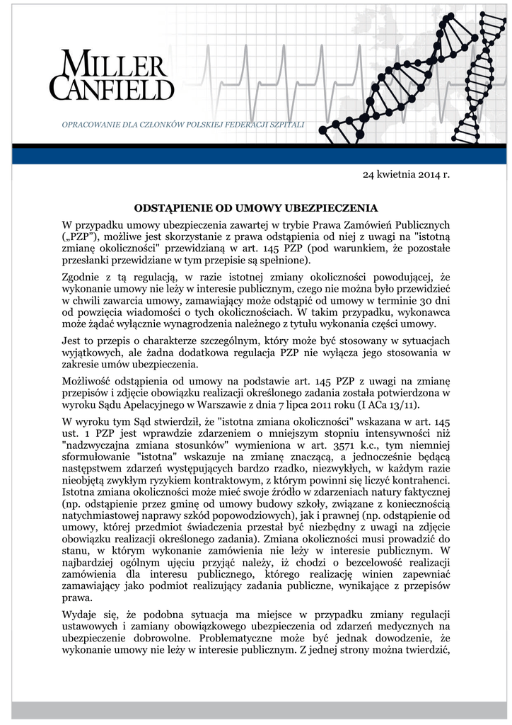 OPRACOWANIE DLA CZŁONKÓW POLSKIEJ FEDERACJI SZPITALI 24 kwietnia 2014 r. ODSTĄPIENIE OD UMOWY UBEZPIECZENIA W przypadku umowy ubezpieczenia zawartej w trybie Prawa Zamówień Publicznych („PZP”), możliwe jest skorzystanie z prawa odstąpienia od niej z uwagi na "istotną zmianę okoliczności" przewidzianą w art. 145 PZP (pod warunkiem, że pozostałe przesłanki przewidziane w tym przepisie są spełnione). Zgodnie z tą regulacją, w razie istotnej zmiany okoliczności powodującej, że wykonanie umowy nie leży w interesie publicznym, czego nie można było przewidzieć w chwili zawarcia umowy, zamawiający może odstąpić od umowy w terminie 30 dni od powzięcia wiadomości o tych okolicznościach. W takim przypadku, wykonawca może żądać wyłącznie wynagrodzenia należnego z tytułu wykonania części umowy. Jest to przepis o charakterze szczególnym, który może być stosowany w sytuacjach wyjątkowych, ale żadna dodatkowa regulacja PZP nie wyłącza jego stosowania w zakresie umów ubezpieczenia. Możliwość odstąpienia od umowy na podstawie art. 145 PZP z uwagi na zmianę przepisów i zdjęcie obowiązku realizacji określonego zadania została potwierdzona w wyroku Sądu Apelacyjnego w Warszawie z dnia 7 lipca 2011 roku (I ACa 13/11). W wyroku tym Sąd stwierdził, że "istotna zmiana okoliczności" wskazana w art. 145 ust. 1 PZP jest wprawdzie zdarzeniem o mniejszym stopniu intensywności niż "nadzwyczajna zmiana stosunków" wymieniona w art. 3571 k.c., tym niemniej sformułowanie "istotna" wskazuje na zmianę znaczącą, a jednocześnie będącą następstwem zdarzeń występujących bardzo rzadko, niezwykłych, w każdym razie nieobjętą zwykłym ryzykiem kontraktowym, z którym powinni się liczyć kontrahenci. Istotna zmiana okoliczności może mieć swoje źródło w zdarzeniach natury faktycznej (np. odstąpienie przez gminę od umowy budowy szkoły, związane z koniecznością natychmiastowej naprawy szkód popowodziowych), jak i prawnej (np. odstąpienie od umowy, której przedmiot świadczenia przestał być niezbędny z uwagi na zdjęcie obowiązku realizacji określonego zadania). Zmiana okoliczności musi prowadzić do stanu, w którym wykonanie zamówienia nie leży w interesie publicznym. W najbardziej ogólnym ujęciu przyjąć należy, iż chodzi o bezcelowość realizacji zamówienia dla interesu publicznego, którego realizację winien zapewniać zamawiający jako podmiot realizujący zadania publiczne, wynikające z przepisów prawa. Wydaje się, że podobna sytuacja ma miejsce w przypadku zmiany regulacji ustawowych i zamiany obowiązkowego ubezpieczenia od zdarzeń medycznych na ubezpieczenie dobrowolne. Problematyczne może być jednak dowodzenie, że wykonanie umowy nie leży w interesie publicznym. Z jednej strony można twierdzić, 876 861.1\PL\088888-01770 że składka ubezpieczeniowa stanowi nadmierne obciążenie dla szpitala, stąd jej opłacanie nie leży w interesie szpitala. Z drugiej jednak strony brak opłacenia składki naraża szpital na konieczność wypłacania ewentualnych odszkodowań z tytułu zdarzeń medycznych z własnych środków. Jeśli jednak szpital jest w stanie wykazać nieadekwatność wysokości składki ubezpieczeniowej do wysokości wypłacanych odszkodowań, wówczas można mówić, że wykonanie takiej umowy nie leży w interesie publicznym. Należy również pamiętać, że zaistnienie istotnej zmiany okoliczności prowadzącej do stanu, w którym wykonanie umowy nie leży w interesie publicznym zgodnie z art. 145 PZP nie może być przewidywalne w chwili zawarcia umowy. Świadomość zamawiającego co do istnienia okoliczności powodujących niecelowość wykonywania zamówienia, jak również świadomość nieuchronności zaistnienia takich okoliczności nie dają zamawiającemu uprawnienia do odstąpienia od umowy w trakcie jej realizacji. W przypadku sporu sądowego, ocena okoliczności każdego przypadku należeć będzie do sądu. W CELU UZYSKANIA DALSZYCH INFORMACJI PROSIMY O KONTAKT Anna Kowalczyk-Pogorzelska dr Andrzej Chełchowski Radca prawny Radca prawny T: +48 22 447 43 00 T: +48 22 447 43 00 E: [email protected] E: [email protected] Zastrzeżenie: Niniejsza publikacja została przygotowana dla klientów i współpracowników kancelarii Miller Canfield. Ma ona na celu jedynie przedstawienie streszczenia niektórych wydarzeń prawnych z wybranych dziedzin prawa. Z tego powodu informacje zawarte w niniejszej publikacji nie powinny stanowić podstawy do podjęcia jakiejkolwiek decyzji dotyczącej określonego kierunku działania. Informacje te nie mogą też być traktowane jako porada prawna ani nie zastępują szczegółowej opinii prawnej w konkretnej sprawie. W każdym przypadku należy skorzystać z usług doradców prawnych w celu weryfikacji, czy odpowiednie przepisy prawa mają zastosowanie do określonej sytuacji. 876 861.1\PL\088888-01770 www.millercanfield.com