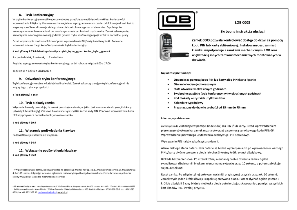 8. Tryb konferencyjny W trybie konferencyjnym możliwe jest swobodne przejście po naciśnięciu klamki bez konieczności wprowadzania PIN/karty. Pierwsze ważne wejście w zaprogramowanym czasie odblokowuje drzwi. Jest to wygodny sposób na aktywację stałego otwarcia kontrolowaną przez użytkownika. Zapobiega to samoczynnemu odblokowaniu drzwi o zadanym czasie bez kontroli użytkownika. Zamek zablokuje się samoczynnie o zaprogramowanej godzinie (koniec trybu konferencyjnego) i wróci to normalnej pracy. LOB C003 Skrócona instrukcja obsługi Zamek C003 pozwala kontrolować dostęp do drzwi za pomocą kodu PIN lub karty zbliżeniowej. Instalowany jest zamiast klamki i współpracuje z zamkami mechanicznymi LOB oraz większością innych zamków mechanicznych montowanych w drzwiach. Drzwi w tym trybie można zablokować przez wprowadzenie PIN/karty i naciśnięcie ##. Ponowne wprowadzenie ważnego kodu/karty wznawia tryb konferencyjny. # kod główny # 15 # dzień tygodnia # początek_trybu_ggmm koniec_trybu_ggmm # 1 – poniedziałek, 2 ‐ wtorek, …. 7 ‐ niedziela Przykład zaprogramowania trybu konferencyjnego w dni robocze między 8:00 a 17:00: #1234 # 15 # 12345 # 08001700 # 9. Odwołanie trybu konferencyjnego Tryb konferencyjny można w każdej chwili odwołać. Zamek zakończy trwający tryb konferencyjny i nie włączy tego trybu w przyszłości. # [kod główny] # 16 # 10. Tryb blokady zamka Włączenie blokady powoduje, że zamek pozostaje w stanie, w jakim jest w momencie aktywacji blokady (otwarty lub zamknięty). Czasowo blokowane są wszystkie karty i kody PIN. Ponowne wprowadzenie kodu blokady przywraca normalne funkcjonowanie zamka. Najważniejsze funkcje: Otwarcie za pomocą kodu PIN lub karty albo PIN+karta łącznie Otwarcie kodem jednorazowym Stałe otwarcie w określonych godzinach Swobodne przejście (tryb konferencyjny) w określonych godzinach Kod blokady wszystkich użytkowników Kalendarz tygodniowy Przeznaczony do drzwi o grubości od 35 mm do 75 mm Informacje podstawowe # kod główny # 99 # Zamek posiada 200 miejsc w pamięci (indeksów) dla PIN i/lub karty. Przed wprowadzeniem 11. Włączenie podświetlenia klawiszy Podświetlenie jest domyślnie włączone. pierwszego użytkownika, zamek można otworzyć za pomocą serwisowego kodu PIN: 0#. Wprowadzenie pierwszego użytkownika deaktywuje PIN serwisowy. # kod główny # 34 # Wpisywanie PIN należy zakończyć znakiem #. 12. Wyłączenie podświetlenia klawiszy # kod główny # 35 # → W przypadku awarii zamka, należy go wysłać na adres: LOB Master Key Sp. z o.o., mechatronika serwis, ul. Magazynowa 4, 64‐100 Leszno, dołączając formularz zgłoszenia reklamacyjnego i kopię dowodu zakupu. Formularz można pobrać ze strony www.lob.pl (zakładka mechatronika‐>serwis). LOB Master Key Sp. z o.o. z siedzibą w Lesznie, woj. Wielkopolskie, ul. Magazynowa 4, 64‐100 Leszno; NIP: 897‐17‐74‐441, KRS nr 0000388873 ‐ Sąd Rejonowy Poznań – Nowe Miasto i Wilda w Poznaniu, IX Wydział Gospodarczy KRS; Kapitał zakładowy: 37.905.000,00 zł; tel.: +48 65 525 07 20, fax: +48 65 525 07 50; [email protected], www.lob.pl Alarm niskiego stanu baterii. Jeśli baterie są bliskie wyczerpania, to po wprowadzeniu ważnego PINu/karty błyśnie czerwona dioda i słychać 3‐krotny krótki sygnał dźwiękowy. Blokada bezpieczeństwa. Po czterokrotnej nieudanej próbie otwarcia zamek będzie sygnalizował dźwiękami i błyskami nienormalną sytuację przez 10 sekund, a potem zablokuje się na 30 sekund. Reset zamka. Po zdjęciu tylnej pokrywy, naciśnij i przytrzymaj przycisk przez ok. 10 sekund. Zamek wyda jeden krótki dźwięk i zapali się czerwona dioda. Potem słychać będzie jeszcze 3 krótkie dźwięki i 2 razy błyśnie niebieska dioda potwierdzając skasowanie z pamięci wszystkich kart i kodów PIN. Zwolnij przycisk. 3. Dodanie użytkownika (karta) # kod główny # 01 # indeks (001‐200) # zbliż kartę [ważny_od_RRMMDDhhmm] # [ważny_do_RRMMDDhhmm] # Przykład dodania karty pod indeks 003 bez restrykcji czasowych: # 1234 # 01 # 003 # zbliż kartę ## 4. Programowanie Przyjęcie komendy zamek potwierdza podwójnym krótkim dźwiękiem i błyskaniem niebieskiej diody. Jeśli podczas programowania wprowadzona będzie błędna sekwencja (np. niedozwolone wartości) zamek opuści tryb programowania bez wprowadzania zmian. Zamek opuści tryb programowania, jeśli w ciągu 10 sekund nie zostanie naciśnięty klawisz. 1. Zmiana kodu głównego. Kod główny składa się z 4‐8 cyfr. Należy go zmienić podczas instalacji. Fabryczny kod główny: 123456. # kod główny # 01 # indeks (001‐200) # PIN # zbliż kartę [ważny_od_RRMMDDhhmm] # [ważny_do_RRMMDDhhmm] # Przykład dodania karty i PIN 4112 pod indeks 004 bez restrykcji czasowych: # 1234 # 01 # 004 # 4112 # zbliż kartę ## 5. # kod główny # 11 # nowy kod główny # nowy kod główny # Przykład dla kodu dotychczasowego 123456 i nowego kodu głównego 1234: # 123456 # 11 # 1234 # 1234 # Zamek potwierdzi zmianę kodu 4‐krotnym krótkim dźwiękiem i opuści tryb programowania. 2. Dodanie użytkownika (PIN) Każdy użytkownik zajmuje miejsce w pamięci . Można wprowadzić do 200 użytkowników pod indeksami 001, 002 itd. Należy zanotować, które indeksy zostały zajęte. # kod główny # 01 # indeks (001‐200) # PIN # [ważny_od_RRMMDDhhmm] # [ważny_do_RRMMDDhhmm] # Przykład wprowadzenia PIN 1390 pod indeks 001 bez restrykcji czasowych: Skasowanie użytkownika Skasowanie użytkownika zwalnia miejsce w pamięci. Nie trzeba znać kodu PIN kasowanego użytkownika, ani mieć jego karty. Wystarczy znać jego indeks w pamięci zamka. # kod główny # 44 # indeks (001‐200) # Po skasowaniu użytkownika można dalej kasować kolejnych podając ich indeksy. Skasowanie ostatniego użytkownika przywraca domyślny PIN serwisowy (0#). 6. Kod jednorazowy Zamek umożliwia zaprogramowanie ośmiu jednorazowych kodów PIN. Po jednokrotnym użyciu