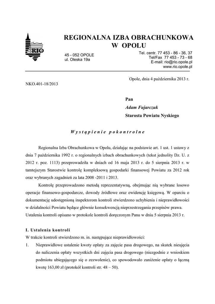 REGIONALNA IZBA OBRACHUNKOWA W OPOLU Tel. centr. 77 453 - 86 - 36, 37 Tel/Fax 77 453 - 73 - 68 E-mail: [email protected] www.rio.opole.pl 45 - 052 OPOLE ul. Oleska 19a Opole, dnia 4 października 2013 r. NKO.401-18/2013 Pan Adam Fujarczuk Starosta Powiatu Nyskiego Wystąpienie pokontrolne Regionalna Izba Obrachunkowa w Opolu, działając na podstawie art. 1 ust. 1 ustawy z dnia 7 października 1992 r. o regionalnych izbach obrachunkowych (tekst jednolity Dz. U. z 2012 r. poz. 1113) przeprowadziła w dniach od 16 maja 2013 r. do 5 sierpnia 2013 r. w tamtejszym Starostwie kontrolę kompleksową gospodarki finansowej Powiatu za 2012 rok oraz wybranych zagadnień za lata 2008 -2011 i 2013. Kontrolę przeprowadzono metodą reprezentatywną, obejmując nią wybrane losowo operacje finansowo-gospodarcze, dowody źródłowe oraz ewidencję księgową. W oparciu o dokumentację udostępnioną inspektorom kontroli stwierdzono uchybienia i nieprawidłowości w działalności Powiatu będące głównie konsekwencją nieprzestrzegania przepisów prawa. Ustalenia kontroli opisano w protokole kontroli doręczonym Panu w dniu 5 sierpnia 2013 r. I. Ustalenia kontroli W trakcie kontroli stwierdzono m. in. następujące nieprawidłowości: 1. Nieprawidłowe ustalenie kwoty opłaty za zajęcie pasa drogowego, na skutek nieujęcia do naliczenia opłaty wszystkich dni zajęcia pasa drogowego (niezgodnie z wnioskiem podmiotu ubiegającego się o zezwolenie), co spowodowało zaniżenie opłaty o łączną kwotę 163,00 zł (protokół kontroli str. 48 – 50). Odpowiedzialność za powyższe ponoszą starszy specjalista ds. technicznych oraz Zastępca Dyrektora Zarządu Dróg Powiatowych w Nysie. 2. Brak w dokumentacji przetargowej pisemnego uzasadnienia indywidualnej oceny oferty przez poszczególnych członków komisji lub akceptacji „Karty indywidualnej oceny oferty” (protokół kontroli str. 70 – 71, 78, 86). Odpowiedzialność ponoszą członkowie komisji przetargowej. 3. Zaniżenie wartości środka trwałego o kwotę 9 900,00 zł na skutek nieujęcia w kosztach ulepszenia poniesionych kosztów sporządzenia dokumentacji projektowej (protokół kontroli str. 88 – 89). Odpowiedzialność ponosi Naczelnik Wydziału Inwestycji i Programowania. 4. Nieustalenie w Zespole Szkół i Placówek Oświatowych im. Emila Godlewskiego w Nysie oraz w Zespole Szkół w Paczkowie procedur dotyczących prowadzenia wyodrębnionej ewidencji księgowej dla każdego typu szkoły, co uniemożliwiło ww. jednostkom prawidłowe ustalenie wydatków bieżących jednostki w szczegółowości do typu i rodzaju szkoły (protokół kontroli str. 134-139). Odpowiedzialność ponoszą Dyrektor Zespołu Szkół i Placówek Oświatowych im. Emila Godlewskiego w Nysie oraz Dyrektor Zespołu Szkół w Paczkowie. Na uwagę zasługuje fakt, że niektóre nieprawidłowości stwierdzone przez kontrolujących zostały w trakcie kontroli usunięte. Dotyczyło to nieprawidłowości wymienionych w punktach 1 – 3 i polegało na: – wznowieniu w dwóch przypadkach postępowania i wydaniu decyzji, którymi zmieniono wadliwe decyzje w sprawie opłat za zajęcie pasa drogowego, – zwiększeniu zaniżonej wartości środka trwałego o kwotę 9 900,00 zł, wydaniu zarządzenia nr 20/2013 z dnia 26.07.2013 r. w sprawie powołania stałej komisji do przeprowadzania postępowań o udzielenie zamówienia publicznego, ustalenia jej składu osobowego oraz określenia zasad i trybu jej działania, którym uchylono zawierające nieaktualne przepisy zarządzenie nr 40/10 Starosty Nyskiego z dnia 10.12.2010 r. Ponadto w odniesieniu do nieprawidłowości wymienionej w punkcie 4 w celu prawidłowej realizacji obowiązku wynikającego z art. 90 ustawy z dnia 7 września 1991 r. o systemie oświaty, tj. ustalenia wydatków bieżących jednostki w szczegółowości do typu i rodzaju szkoły, pismem nr EK.4331.2.7.2013.MZ Członka Zarządu Powiatu Nyskiego nadzorującego Wydział Edukacji i Kultury z dnia 30.07.2013 r. zobowiązano Dyrektorów wszystkich szkół 2 prowadzonych przez Powiat Nyski do prowadzenia odrębnej analityki wydatków dla każdego typu szkoły. II. Wnioski pokontrolne W celu usunięcia stwierdzonych nieprawidłowości oraz usprawnienia prowadzenia zagadnień objętych kontrolą, Regionalna Izba Obrachunkowa w Opolu działając na podstawie art. 9 ust. 2 powołanej na wstępie ustawy o regionalnych izbach obrachunkowych, wnosi o pełne wykorzystanie ustaleń zawartych w protokole kontroli oraz o podjęcie skutecznych działań w celu wyeliminowania powstałych nieprawidłowości, a w szczególności o realizację następujących wniosków: 1. Przy wydawaniu zezwoleń na zajęcie pasa drogowego do ustalenia kwoty opłaty za zajęcie pasa drogowego przyjmować pełną liczbę dni zajmowania pasa drogowego stosownie do przepisu art. 40 ust. 4 ustawy z dnia 21 marca 1985 r. o drogach publicznych (tekst jednolity Dz. U. z 2013 r. poz. 260 z późn. zm.) 2. Wdrożyć procedury zapewniające prawidłowe ustalenie przez oświatowe jednostki budżetowe Powiatu Nyskiego wydatków bieżących w szczegółowości do typu i rodzaju szkoły celem zapewnienia przestrzegania art. 90 ustawy z dnia 7 września 1991 r. o systemie oświaty (tekst jednolity Dz. U. z 2004 r. Nr 256, poz. 2572 z późn. zm.). Stosownie do postanowień art. 9 ust. 3 cyt. ustawy o regionalnych izbach obrachunkowych, oczekuję w terminie 30 dni od daty otrzymania niniejszego wystąpienia pokontrolnego pisemnej informacji o wykonaniu wniosków pokontrolnych w nim zawartych lub przyczynach ich niewykonania. Poinformowanie Izby niezgodnie z prawdą o wykonaniu wniosków pokontrolnych w myśl art. 27 ww. ustawy zagrożone jest karą grzywny. Zgodnie z art. 9 ust. 3 i 4 ustawy o regionalnych izbach obrachunkowych do wniosków zawartych w wystąpieniu pokontrolnym przysługuje prawo wniesienia zastrzeżeń do Kolegium Izby w terminie 14 dni od daty otrzymania wystąpienia pokontrolnego. 