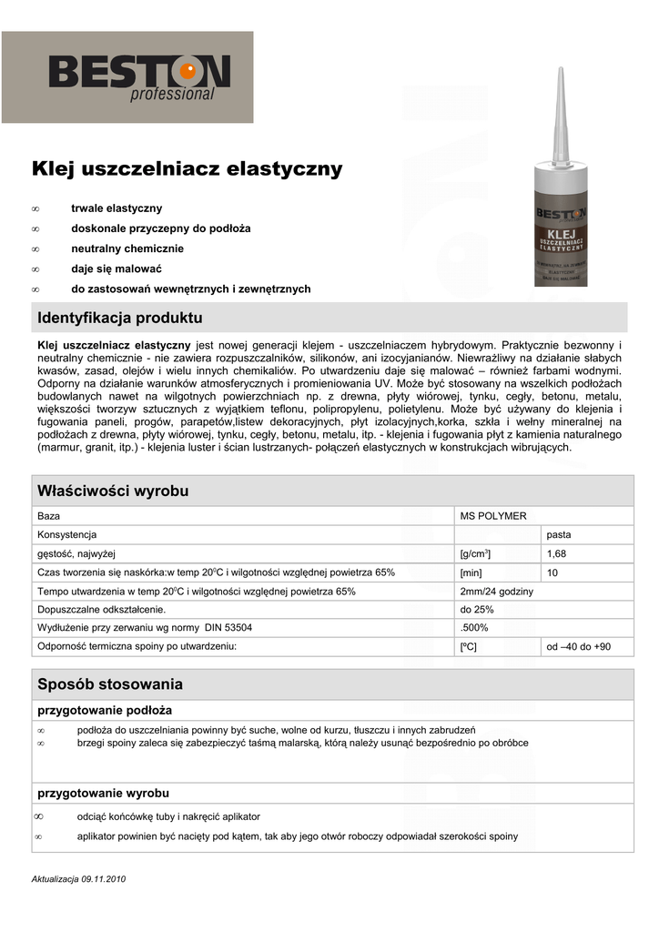 Klej uszczelniacz elastyczny • trwale elastyczny • doskonale przyczepny do podłoża • neutralny chemicznie • daje się malować • do zastosowań wewnętrznych i zewnętrznych Identyfikacja produktu Klej uszczelniacz elastyczny jest nowej generacji klejem - uszczelniaczem hybrydowym. Praktycznie bezwonny i neutralny chemicznie - nie zawiera rozpuszczalników, silikonów, ani izocyjanianów. Niewrażliwy na działanie słabych kwasów, zasad, olejów i wielu innych chemikaliów. Po utwardzeniu daje się malować – również farbami wodnymi. Odporny na działanie warunków atmosferycznych i promieniowania UV. Może być stosowany na wszelkich podłożach budowlanych nawet na wilgotnych powierzchniach np. z drewna, płyty wiórowej, tynku, cegły, betonu, metalu, większości tworzyw sztucznych z wyjątkiem teflonu, polipropylenu, polietylenu. Może być używany do klejenia i fugowania paneli, progów, parapetów,listew dekoracyjnych, płyt izolacyjnych,korka, szkła i wełny mineralnej na podłożach z drewna, płyty wiórowej, tynku, cegły, betonu, metalu, itp. - klejenia i fugowania płyt z kamienia naturalnego (marmur, granit, itp.) - klejenia luster i ścian lustrzanych- połączeń elastycznych w konstrukcjach wibrujących. Właściwości wyrobu Baza MS POLYMER Konsystencja pasta gęstość, najwyżej [g/cm3] 1,68 Czas tworzenia się naskórka:w temp 200C i wilgotności względnej powietrza 65% [min] 10 Tempo utwardzenia w temp 20 C i wilgotności względnej powietrza 65% 2mm/24 godziny Dopuszczalne odkształcenie. do 25% Wydłużenie przy zerwaniu wg normy DIN 53504 .500% Odporność termiczna spoiny po utwardzeniu: [ºC] 0 Sposób stosowania przygotowanie podłoża • • podłoża do uszczelniania powinny być suche, wolne od kurzu, tłuszczu i innych zabrudzeń brzegi spoiny zaleca się zabezpieczyć taśmą malarską, którą należy usunąć bezpośrednio po obróbce przygotowanie wyrobu • odciąć końcówkę tuby i nakręcić aplikator • aplikator powinien być nacięty pod kątem, tak aby jego otwór roboczy odpowiadał szerokości spoiny Aktualizacja 09.11.2010 od –40 do +90 aplikacja • • • • • • • nakładać ręcznym lub pneumatycznym pistoletem do uszczelniaczy. uszczelnianie -fugę wygładzić wodą lub roztworem mydła przed utworzeniem się naskórka. klejenie- klej nałożyć pasmami na jedną z powierzchni i docisnąć klejone elementy do siebie. świeże zabrudzenia czyścić benzyną ekstrakcyjną aplikacja i wysychanie wyrobu nie może odbywać się w złych warunkach atmosferycznych. temperatura stosowania od +10C do +300C malować po całkowitym utwardzeniu się masy Parametry techniczne Wymiary spoin: [mm] Zalecane proporcje -szerokość:głębokość 1:1 Min 2 Kolorystyka Biały, brązowy Sposób pakowania Opakowania o pojemności 290ml Wydajność ok. 15 mb fugi o wymiarach 5 mm x 5 mm. Okres gwarancji 12 miesięcy od daty produkcji Wskazania BHP I PPOŻ Przechowywać pojemnik w miejscu dobrze wentylowanym. Unikać zanieczyszczenia skóry. Pomieszczenie po zastosowaniu wyrobu wietrzyć do zaniku zapachu i po tym czasie nadaje się do użytkowania. Usuwać produkt i jego opakowanie w sposób bezpieczny. Przechowywać w miejscu niedostępnym dla dzieci. Aktualizacja 09.11.2010