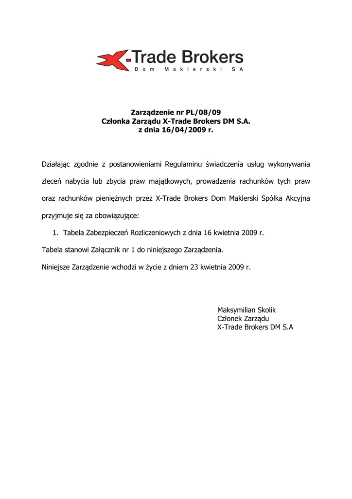 Zarządzenie nr PL/08/09 Członka Zarządu X-Trade Brokers DM S.A. z dnia 16/04/2009 r. Działając zgodnie z postanowieniami Regulaminu świadczenia usług wykonywania zleceń nabycia lub zbycia praw majątkowych, prowadzenia rachunków tych praw oraz rachunków pieniężnych przez X-Trade Brokers Dom Maklerski Spółka Akcyjna przyjmuje się za obowiązujące: 1. Tabela Zabezpieczeń Rozliczeniowych z dnia 16 kwietnia 2009 r. Tabela stanowi Załącznik nr 1 do niniejszego Zarządzenia. Niniejsze Zarządzenie wchodzi w życie z dniem 23 kwietnia 2009 r. Maksymilian Skolik Członek Zarządu X-Trade Brokers DM S.A Załącznik Nr 1 do Zarządzenia PL/O8/09 TABELA ZABEZPIECZEŃ ROZLICZENIOWYCH z dnia 16/04/2009 r. Saldo na Rachunku Pieniężnym Klienta w PLN Wielkość Zabezpieczenia Rozliczeniowego pobieranego przy otwieraniu transakcji na walutowych instrumentach finansowych oraz na instrumencie TNOTE (wielkości wyrażone jako % nominału otwartej pozycji) Wielkość Zabezpieczenia Rozliczeniowego pobieranego przy otwieraniu transakcji na instrumentach finansowych opartych o ceny indeksów giełdowych wymienionych w punkcie 1 (wielkości wyrażone jako % wartości otwartej pozycji) Wielkość Zabezpieczenia Rozliczeniowego pobieranego przy otwieraniu transakcji na instrumentach finansowych opartych o ceny towarów i indeksów giełdowych wymienionych w punkcie 2 (wielkości wyrażone jako % wartości otwartej pozycji) 0-200 000 200 001-400 000 400 001-800 000 800 001-1 000 000 1 000 001-2 000 000 powyżej 2 000 000 Saldo na Rachunku Pieniężnym Klienta w PLN 1.00% 1.52% 3.03% 4.00% 10.00% 20.00% 2.00% 3.03% 6.06% 8.00% 20.00% 40.00% 3.00% 4.55% 9.09% 12.00% 30.00% 60.00% Wielkość Zabezpieczenia Rozliczeniowego pobieranego przy otwieraniu transakcji na instrumentach finansowych opartych o ceny akcji wymienionych w punkcie 3 (wielkości wyrażone jako % wartości otwartej pozycji) Wielkość Zabezpieczenia Rozliczeniowego pobieranego przy otwieraniu transakcji na instrumentach finansowych opartych o ceny akcji wymienionych w punkcie 8 (wielkości wyrażone jako % wartości otwartej pozycji) 7.00% 10.61% 21.21% 28.00% 70.00% 100.00% 15.00% 22.80% 45.45% 60.00% 100.00% 100.00% 0-200 000 200 001-400 000 400 001-800 000 800 001-1 000 000 1 000 001-2 000 000 powyżej 2 000 000 Uwagi: 1. Zabezpieczenie Rozliczeniowe pobierane przy otwieraniu transakcji na następujących instrumentach: USACASH, USBCASH, USCCASH, RUSCASH, CZKCASH, BOVESPA, US30, US500, UK100, DE30, FRA40, EU50, SPA35, ITA40, SUI20, RUS50, HUNComp, BRAComp, JAP225, HKComp, CHNComp. 2. Zabezpieczenie Rozliczeniowe pobierane przy otwieraniu transakcji na następujących instrumentach: W20PLN, GOLD, SILVER, PLATINUM, PALLADIUM, COPPER, ALUMINIUM, ZINC, NICKEL, LEAD, TIN, OIL, NATGAS, GASOLINE, HEATINGOIL, CORN, SOYBEAN, WHEAT, RICE, SUGAR, COTTON, COFFEE, COCOA, SOYOIL, SOYMEAL, LEANHOGS, CATTLE. 3. Zabezpieczenie Rozliczeniowe pobierane przy otwieraniu transakcji na następujących instrumentach: EBAY, YAHOO, MICROSOFT, INTEL, NOKIA, IBM, PFIZER, EXXONMOBIL, GE. 4. Zabezpieczenie Rozliczeniowe pobierane przy otwieraniu transakcji na Opcyjnych Instrumentach Finansowych każdorazowo pobierane jest w wysokości 0.00% nominału otwartej pozycji w przypadku kupna Opcyjnego Instrumentu Finansowego. 5. Zabezpieczenie Rozliczeniowe pobierane przy otwieraniu transakcji na Opcyjnych Instrumentach Finansowych każdorazowo pobierane jest w wysokości 1.00% nominału otwartej pozycji w przypadku sprzedaży Opcyjnego Instrumentu Finansowego opartego na instrumentach: USDPLN, EURPLN, EURUSD, GBPUSD, USDCHF, USDJPY, EURJPY, EURCHF, EURGBP, AUDUSD, USDCAD, GBPJPY, NZDUSD, USDCZK, EURCZK oraz 2.00% nominału otwartej pozycji w przypadku sprzedaży Opcyjnego Instrumentu Finansowego opartego na instrumentach: GOLD, SILVER, COPPER, ZINC, OIL, W20PLN, US30, US500, EU50, UK100, DE30, SPA35. 6. W przypadku gdy zmiana Salda na Rachunku Pieniężnym Klienta powoduje zmianę wielkości naliczanego Zabezpieczenia Rozliczeniowego, zmiana dotyczy wszystkich Otwartych Pozycji, również tych otwartych przed zmianą wielkości salda. 7. W przypadku rachunków, co do których istnieje uzasadnione podejrzenie, że są zarządzane przez jedną osobę lub grupę powiązanych ze sobą osób salda takich rachunków są sumowane i Zabezpieczenie Rozliczeniowe dla wszystkich takich rachunków jest ustalane w jednakowej wysokości zgodnie z powyższą tabelą. 8. Zabezpieczenie Rozliczeniowe pobierane przy otwieraniu transakcji na następujących instrumentach: KB.CZ, ERSTE.CZ, UNI.CZ, TELO2.CZ, CEZ.CZ, SAN.ES, TEF.ES, REP.ES, IBE.ES, ACX.ES, CITIGROUP. 2