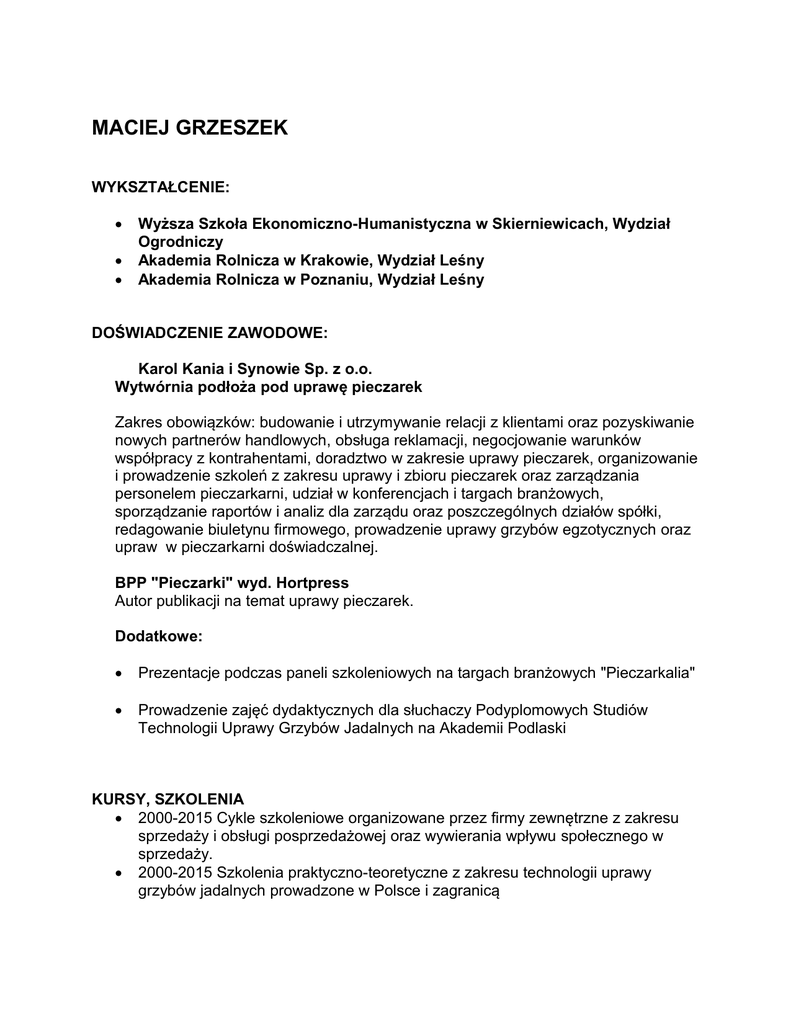 MACIEJ GRZESZEK WYKSZTAŁCENIE: Wyższa Szkoła Ekonomiczno-Humanistyczna w Skierniewicach, Wydział Ogrodniczy Akademia Rolnicza w Krakowie, Wydział Leśny Akademia Rolnicza w Poznaniu, Wydział Leśny DOŚWIADCZENIE ZAWODOWE: Karol Kania i Synowie Sp. z o.o. Wytwórnia podłoża pod uprawę pieczarek Zakres obowiązków: budowanie i utrzymywanie relacji z klientami oraz pozyskiwanie nowych partnerów handlowych, obsługa reklamacji, negocjowanie warunków współpracy z kontrahentami, doradztwo w zakresie uprawy pieczarek, organizowanie i prowadzenie szkoleń z zakresu uprawy i zbioru pieczarek oraz zarządzania personelem pieczarkarni, udział w konferencjach i targach branżowych, sporządzanie raportów i analiz dla zarządu oraz poszczególnych działów spółki, redagowanie biuletynu firmowego, prowadzenie uprawy grzybów egzotycznych oraz upraw w pieczarkarni doświadczalnej. BPP "Pieczarki" wyd. Hortpress Autor publikacji na temat uprawy pieczarek. Dodatkowe: Prezentacje podczas paneli szkoleniowych na targach branżowych "Pieczarkalia" Prowadzenie zajęć dydaktycznych dla słuchaczy Podyplomowych Studiów Technologii Uprawy Grzybów Jadalnych na Akademii Podlaski KURSY, SZKOLENIA 2000-2015 Cykle szkoleniowe organizowane przez firmy zewnętrzne z zakresu sprzedaży i obsługi posprzedażowej oraz wywierania wpływu społecznego w sprzedaży. 2000-2015 Szkolenia praktyczno-teoretyczne z zakresu technologii uprawy grzybów jadalnych prowadzone w Polsce i zagranicą