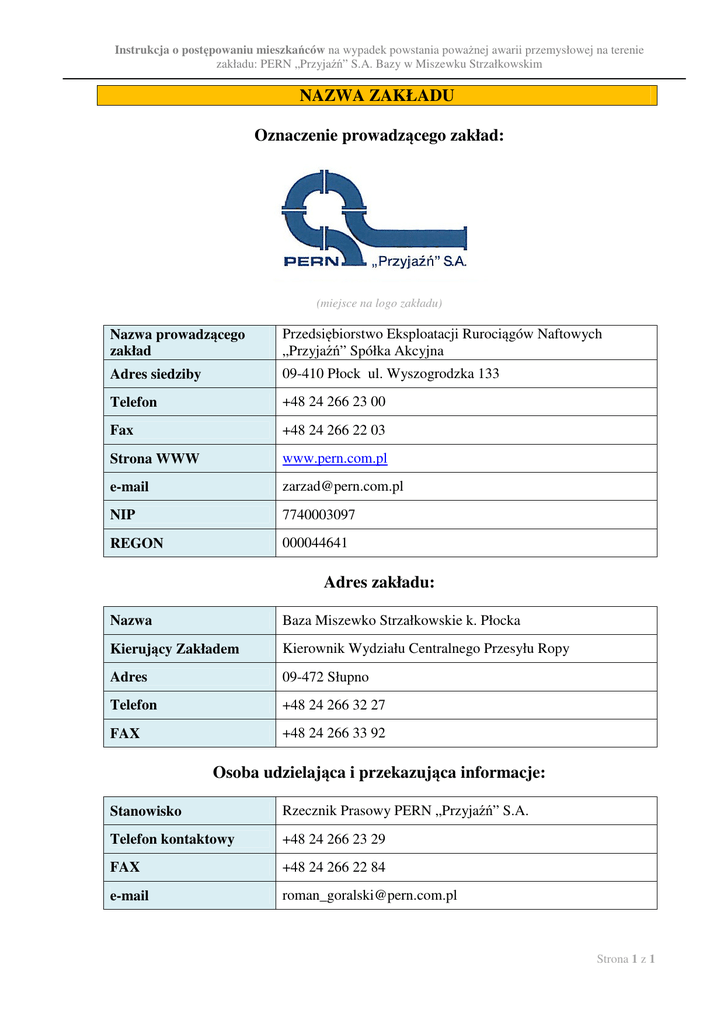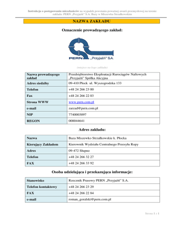 Instrukcja o postępowaniu mieszkańców na wypadek powstania poważnej awarii przemysłowej na terenie zakładu: PERN „Przyjaźń” S.A. Bazy w Miszewku Strzałkowskim NAZWA ZAKŁADU Oznaczenie prowadzącego zakład: (miejsce na logo zakładu) Nazwa prowadzącego zakład Przedsiębiorstwo Eksploatacji Rurociągów Naftowych „Przyjaźń” Spółka Akcyjna Adres siedziby 09-410 Płock ul. Wyszogrodzka 133 Telefon +48 24 266 23 00 Fax +48 24 266 22 03 Strona WWW www.pern.com.pl e-mail [email protected] NIP 7740003097 REGON 000044641 Adres zakładu: Nazwa Baza Miszewko Strzałkowskie k. Płocka Kierujący Zakładem Kierownik Wydziału Centralnego Przesyłu Ropy Adres 09-472 Słupno Telefon +48 24 266 32 27 FAX +48 24 266 33 92 Osoba udzielająca i przekazująca informacje: Stanowisko Rzecznik Prasowy PERN „Przyjaźń” S.A. Telefon kontaktowy +48 24 266 23 29 FAX +48 24 266 22 84 e-mail [email protected] Strona 1 z 1 Instrukcja o postępowaniu mieszkańców na wypadek powstania poważnej awarii przemysłowej na terenie zakładu: PERN „Przyjaźń” S.A. Bazy w Miszewku Strzałkowskim PODSTAWOWE INFORMACJE O ZAKŁADZIE 1. Rodzaj zakładu ze względu na stwarzane ryzyko, charakter działalności zakładu, rodzaj zagrożeń możliwych do wystąpienia w zakładzie. Działalność użytkownika Bazy w Miszewku Strzałkowskim polega na przyjmowaniu, magazynowaniu i wydawaniu ropy naftowej. Ropa naftowa przyjmowana jest do magazynowania rurociągiem „Przyjaźń” z terytorium Białorusi poprzez Bazę Adamowo oraz rurociągiem „Pomorskim” z Bazy w Gdańsku. Ropa naftowa magazynowana jest w zbiornikach stalowych o pojemności od 32.000m³ do 100.000m³. Baza ma możliwość przesyłu ropy do PKN ORLEN S.A. w Płocku, w kierunku zachodniej granicy Państwa i dalej do Niemiec, oraz poprzez Bazę w Gdańsku do rafinerii Grupy Lotos oraz do Naftoportu. Prawdopodobieństwo wystąpienia poważnej awarii przemysłowej na terenie Bazy Miszewko Strzałkowskie, której skutki mogą dotknąć mieszkańców Gminy Słupno jest bardzo małe. Wszystkie zbiorniki magazynowe zabezpieczone są przed niekontrolowanym rozlewem. Zagrożenie ogranicza się do możliwości przeniesienia zadymienia w kierunku siedziby/miejsca zamieszkania, w przypadku dużego pożaru na terenie zakładu. W tym przypadku oceniając zagrożenie, polegające na rozprzestrzenianiu się silnego zadymienia, należy podać że pióropusz dymu o ciemnej barwie będzie się przemieszczał zgodnie z kierunkiem wiatru. Zasięg zadymienia zależeć będzie od aktualnych warunków meteorologicznych, jednak nie przekroczy on kilkunastu kilometrów. Zadymienie nie niesie poważnych zagrożeń ekologicznych. Możliwe są następujące skutki: a) spowodowanie przejściowego zagrożenia dla zdrowia ludności z powodu wdychania produktów niezupełnego i niecałkowitego spalania. Skala zjawiska może być na tyle intensywna, że niezbędna okaże się czasowa ewakuacja, b) skażenie powierzchniowe roślinności (drzewa, trawy, uprawy roślinne) produktami niecałkowitego spalania. Będzie ono tym większe, im roślinność będzie bliżej źródła pożaru. Obszar tego rodzaju szczególnego narażenia nie będzie większy niż 2 – 3 km od miejsca pożaru. Negatywne oddziaływanie zadymienia wywołanego spalaniem się ropy naftowej będzie przedmiotem specjalistycznych badań, c) skażenie wód powierzchniowych. W określonych, niekorzystnych, warunkach pogodowych (brak wiatru, mgła, opady atmosferyczne) produkty niecałkowitego spalania mogą opaść na powierzchnię wód. 2. Rodzaje zagrożeń możliwych do wystąpienia w zakładzie oraz skutki możliwe do przewidzenia. Lp. Nazwa zagrożenia* Skutki** 1. duży pożar na terenie zakładu możliwość przeniesienia zadymienia w kierunku siedziby/miejsca zamieszkania 2. rozlewisko spowodowane awarią rurociągu technologicznego możliwość skażenia gruntu * wybuch, pożar, działanie toksyczne dla środowiska (człowieka), działanie rakotwórcze itp. ** skażenie środowiska, zatrucia, poparzenia itp. Strona 2 z 2 Instrukcja o postępowaniu mieszkańców na wypadek powstania poważnej awarii przemysłowej na terenie zakładu: PERN „Przyjaźń” S.A. Bazy w Miszewku Strzałkowskim 3. Współpraca ze służbami odpowiedzialnymi za bezpieczeństwo, w zakresie postępowania w przypadku wystąpienia awarii oraz ograniczania jej skutków. − Państwowa Straż Pożarna: Komenda Miejska Państwowej Straży Pożarnej w Płocku, Komenda Wojewódzka Państwowej Straży Pożarnej w Warszawie, − Wojewódzki Inspektorat Ochrony Środowiska w Warszawie Delegatura w Płocku − Inne: Zakładowe Straże Pożarne, Policja, Pogotowie Ratunkowe 4. Środki zapobiegawcze i działania, które będą podjęte w przypadku wystąpienia awarii. Zakład wprowadził m.in. następujące środki zapobiegawcze: • Monitorowanie poziomu ropy naftowej w zbiornikach i zabezpieczenie zbiorników przed przepełnieniem, • Kontrola stanu dna zbiorników i zabezpieczenie przed przenikaniem ropy naftowej z rozlewisk w obrębie obwałowania do gruntu i wód gruntowych, • Wyposażenie zbiorników w stałe i półstałe urządzenia gaśnicze i zabezpieczające, • Opracowanie właściwych procedur i instrukcje technologiczne. W przypadku powstania zagrożenia zostaną uruchomione siły i środki Zakładowej Straży Pożarnej PERN, powiadomione zostaną jednostki ratownicze Państwowej Straży Pożarnej, a informacja o zdarzeniu zostanie przekazana dodatkowo do: 1) Wójta Gminy Słupno, tel. 24 2679560, 2) Punktu Kontaktowego Zarządzania Kryzysowego Urzędu Gminy Słupno, tel. 728336798 3) Sołtysa wsi Cekanowo, tel. 24 2619366, 4) Sołtysa wsi Miszewko Strzałkowskie, tel. 24 2619074, 5) Sołtysa wsi Mirosław, tel. 24 2669120. Powyższe realizuje Starszy Zmiany w Bazie Miszewko Strzałkowskie – tel. 24 26 63 222. ZASADY OGÓLNE 1. Sygnały alarmowe (alarmy): Na terenie Bazy Miszewko Strzałkowskie Pożar, rozlewisk