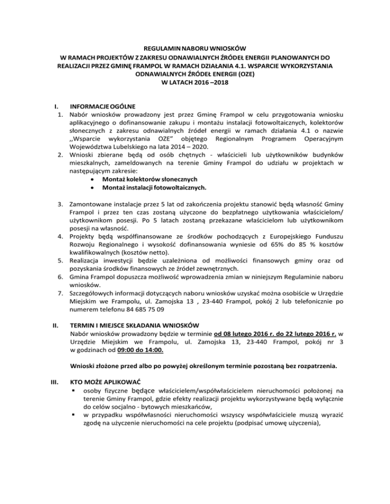 REGULAMIN NABORU WNIOSKÓW W RAMACH PROJEKTÓW Z ZAKRESU ODNAWIALNYCH ŹRÓDEŁ ENERGII PLANOWANYCH DO REALIZACJI PRZEZ GMINĘ FRAMPOL W RAMACH DZIAŁANIA 4.1. WSPARCIE WYKORZYSTANIA ODNAWIALNYCH ŹRÓDEŁ ENERGII (OZE) W LATACH 2016 –2018 I. INFORMACJE OGÓLNE 1. Nabór wniosków prowadzony jest przez Gminę Frampol w celu przygotowania wniosku aplikacyjnego o dofinansowanie zakupu i montażu instalacji fotowoltaicznych, kolektorów słonecznych z zakresu odnawialnych źródeł energii w ramach działania 4.1 o nazwie ,,Wsparcie wykorzystania OZE” objętego Regionalnym Programem Operacyjnym Województwa Lubelskiego na lata 2014 – 2020. 2. Wnioski zbierane będą od osób chętnych - właścicieli lub użytkowników budynków mieszkalnych, zameldowanych na terenie Gminy Frampol do udziału w projektach w następującym zakresie: • Montaż kolektorów słonecznych • Montaż instalacji fotowoltaicznych. 3. Zamontowane instalacje przez 5 lat od zakończenia projektu stanowić będą własność Gminy Frampol i przez ten czas zostaną użyczone do bezpłatnego użytkowania właścicielom/ użytkownikom posesji. Po 5 latach zostaną przekazane właścicielom lub użytkownikom posesji na własność. 4. Projekty będą współfinansowane ze środków pochodzących z Europejskiego Funduszu Rozwoju Regionalnego i wysokość dofinansowania wyniesie od 65% do 85 % kosztów kwalifikowalnych (kosztów netto). 5. Realizacja inwestycji będzie uzależniona od możliwości finansowych gminy oraz od pozyskania środków finansowych ze źródeł zewnętrznych. 6. Gmina Frampol dopuszcza możliwość wprowadzenia zmian w niniejszym Regulaminie naboru wniosków. 7. Szczegółowych informacji dotyczących naboru wniosków uzyskać można osobiście w Urzędzie Miejskim we Frampolu, ul. Zamojska 13 , 23-440 Frampol, pokój 2 lub telefonicznie po numerem telefonu 84 685 75 09 II. TERMIN I MIEJSCE SKŁADANIA WNIOSKÓW Nabór wniosków prowadzony będzie w terminie od 08 lutego 2016 r. do 22 lutego 2016 r. w Urzędzie Miejskim we Frampolu, ul. Zamojska 13, 23-440 Frampol, pokój nr 3 w godzinach od 09:00 do 14:00. Wnioski złożone przed albo po powyżej określonym terminie pozostaną bez rozpatrzenia. III. KTO MOŻE APLIKOWAĆ osoby fizyczne będące właścicielem/współwłaścicielem nieruchomości położonej na terenie Gminy Frampol, gdzie efekty realizacji projektu wykorzystywane będą wyłącznie do celów socjalno - bytowych mieszkańców, w przypadku współwłasności nieruchomości wszyscy współwłaściciele muszą wyrazić zgodę na użyczenie nieruchomości na cele projektu (podpisać umowę użyczenia), IV. DOKUMENTY WYMAGANE NA ETAPIE APLIKOWANIA O ZAKWALIFIKOWANIE MIESZKAŃCA DO PROJEKTU 1. Montaż instalacji kolektorów słonecznych Ankieta dotycząca udziału w projekcie polegającym na zakupie i montażu instalacji kolektorów słonecznych, Deklaracja dotycząca udziału w projekcie polegającym na zakupie i montażu instalacji kolektorów słonecznych, 2. Montaż instalacji fotowoltaicznych Ankieta dotycząca udziału w projekcie polegającym na zakupie i montażu instalacji fotowoltaicznych, Deklaracja dotycząca udziału w projekcie polegającym na zakupie i montażu instalacji fotowoltaicznych, Kopię rachunków za energię elektryczną za 2015 r. UWAGA 1. Po zakwalifikowaniu do projektu Wnioskodawcy zostaną wezwani do Urzędu Miejskiego we Frampolu wraz z dowodem osobistym w celu podpisania umowy dotyczącej wyrażenie zgody na bezpłatne użyczenie swej nieruchomości na cele projektu. 2. W przypadku współwłasności nieruchomości wszyscy współwłaściciele muszą wyrazić zgodę na użyczenie nieruchomości na cele projektu (podpisać umowę użyczenia) 3. Ze względu na konieczność pozyskania mapy w Starostwie Powiatowym, która jest wymagana na etapie projektowania dokumentacji technicznej instalacji, Wnioskodawcy zostaną poinformowani poprzez Ogłoszenie na stronie internetowej Urzędu o terminie złożenia wymaganego dokumentu. V. INFORMACJE DOTYCZĄCE WSZYSTKICH PROJEKTÓW. 1. Mieszkańcy Gminy Frampol mogą aplikować zarówno o zakup i montaż ogniw fotowoltaicznych jak i solarów słonecznych. Należy jednak wziąć pod uwagę możliwości techniczne w tym w szczególności powierzchnię budynku/ nieruchomości umożliwiającą prawidłowy montaż urządzenia. Dla przykładu informuje się, że instalacja fotowoltaiczna o mocy 3 KW zajmuje powierzchnię 21 m2. 2. W związku z ograniczeniami wprowadzonymi w Regionalnym Programie Operacyjnym Województwa Lubelskiego na lata 2014 – 2020 istnieje możliwość ubiegania się o dofinansowanie na te projekty, w których łączna moc instalacji z OZE nie przekracza 2 MW przy energii słonecznej. Dlatego też deklaracje mieszkańców będą rozpatrywane według kolejności ich składania, aby łączna moc instalacji nie przekroczyła wartości granicznych, gdyż wtedy wniosek zostałby odrzucony ze względów formalnych. 3. Instalacje zamontowane na i w budynkach nie mogą być wykorzystywane do prowadzenia działalności rolniczej oraz działalności gospodarczej w tym agroturystyki – przeznaczone są wyłącznie na potrzeby gospodarstwa domowego. 4. Dach budynku, na którym będzie montowana instalacja, nie może być pokryty eternitem. W przypadku pokrycia eternitem istnieje możliwość wykonania instalacji przy fasadzie budynku lub na gruncie. VI. PROCEDURA CZYNNOŚCI DOKONYWANYCH PO OTRZYMANIU DOFINSOWANIA Z ŚRODKÓW RPO WOJEWÓDZTWA LUBELSKIEGO NA LATA 2014 – 2020 NA REALIZACJĘ PROJEKTU PREZ GMINĘ FRANPOL Po uzyskaniu od Instytucji Zarządzającej Programem, jaką jest Urząd Marszałkowski Województwa Lubelskiego w Lublinie pozytywnej oceny i zakwalifikowaniem projektu do dofinansowania mieszkańcy zakwalifikowani do udziału w projekcie (po zweryfikowaniu spełnienia warunków udziału w projekcie oraz uwzględnieniu mocy instalacji) w stosownym czasie zostaną poproszeni o: 1. Uczestnik projek