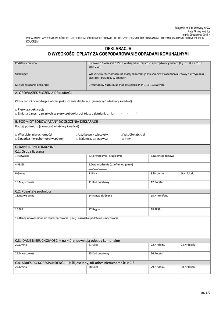 Załącznik nr 1 do Uchwały Nr XV Rady Gminy Kuźnica z dnia 29 czerwca 2016 r. POLA JASNE WYPEŁNIA WŁAŚCICIEL NIERUCHOMOŚCI KOMPUTEROWO LUB RĘCZNE DUŻYMI ,DRUKOWANYMI LITERAMI, CZARNYM LUB NIEBIESKIM KOLOREM ______________________________________________________________________________________________________________________________________________________________________ DEKLARACJA O WYSOKOŚCI OPŁATY ZA GOSPODAROWANIE ODPADAMI KOMUNALNYMI Podstawa prawna: Ustawa z 13 września 1996 r. o utrzymaniu czystości i porządku w gminach (t. j. Dz. U. z 2016 r. poz. 250) Składający: Właściciel nieruchomości, na której zamieszkują mieszkańcy w rozumieniu ustawy o utrzymaniu czystości i porządku w gminach Miejsce składania deklaracji Urząd Gminy Kuźnica, ul. Plac Tysiąclecia P. P. 1 16-123 Kuźnica A. OBOWIĄZEK ZŁOŻENIA DEKLARACJI Okoliczności powodujące obowiązek złożenia deklaracji: (zaznaczyć właściwy kwadrat) □ Pierwsza deklaracja □ Zmiana danych zawartych w pierwszej deklaracji (data zaistnienia zmian ___-___-_____) B. PODMIOT ZOBOWIĄZANY DO ZŁOŻENIA DEKLARACJI Rodzaj podmiotu (zaznaczyć właściwy kwadrat) □ Właściciel nieruchomości □ Zarządca nieruchomości wspólnej □ Użytkownik wieczysty □ Najemca, dzierżawca □ Współwłaściciel □ Inny C. DANE IDENTYFIKACYJNE C.1. Osoba fizyczna 1.Nazwisko 2.Pierwsze imię, drugie imię 3.Nazwisko rodowe 4.PESEL 5.Data urodzenia (dzień-miesiąc-rok) ___-___-_____ 6.Gmina 7.Ulica 8.Nr domu 10.Miejscowość 11.Kod pocztowy 12.Poczta 13.Nazwa pełna 14.Nazwa skrócona 15.Nr telefonu 16.NIP 17.Regon 18.PESEL 9.Nr lokalu C.2. Pozostałe podmioty 19.Osoby upoważnione do reprezentowania: (imię i nazwisko, podstawa umocowania) C.3. DANE NIERUCHOMOŚCI – na której powstają odpady komunalne 20.Gmina 21.Ulica 22.Nr domu 24.Miejscowość 25.Kod pocztowy 26.Poczta 23.Nr lokalu C.4. ADRES DO KORESPONDENCJI – jeśli jest inny, niż adres nieruchomości z C.3. 27.Gmina 28.Ulica 29.Nr domu 30.Nr lokalu str. 1/2 31.Miejscowość 32.Kod pocztowy 33.Poczta D. OŚWIADCZENIE WŁAŚCICIELA NIERUCHOMOŚCI Oświadczam, że na terenie nieruchomości wskazanej w dziale C niniejszej deklaracji zamieszkuje (podać liczbę mieszkańców zamieszkujących na nieruchomości) Stawka opłaty określona w Uchwale Rady Gminy Kuźnica w sprawie wyboru metody ustalania opłaty za gospodarowanie odpadami komunalnymi oraz ustalania wysokości tej opłaty za odbiór odpadów ZMIESZANYCH / ZBIERANYCH SELEKTYWNIE* (niepotrzebne skreślić) Miesięczna kwota opłaty (kwotę z poz. 35 należy pomnożyć przez liczbę osób wskazaną w poz. 34) Opłata kwartalna (kwotę z poz. 36 należy pomnożyć przez 3 miesiące) 34. osób 35. zł/osobę 36. zł/miesiąc 37. zł/kwartał Jednocześnie oświadczam, iż odpady z nieruchomości będą zbierane w sposób: (zaznaczyć właściwy kwadrat) *□ selektywny □ zmieszany M3 Na terenie nieruchomości znajduje się kompostownik: TAK / NIE* (niepotrzebne skreślić) (w przypadku zaznaczenia pozycji ”tak”, proszę podać pojemność kompostownika) 38.Miejscowość, data 39.Czytelny podpis Pouczenie: 1. Niniejsza deklaracja stanowi podstawę prawną do wystawienia tytułu wykonawczego, zgodnie z art. 3a ustawy z dnia 17 czerwca 1996 r. o postępowaniu egzekucyjnym w administracji (t.j. Dz. U. z 2016 r. poz. 599). 2. Właściciel nieruchomości jest obowiązany złożyć deklarację do Wójta Gminy Kuźnica o wysokości opłat za gospodarowanie odpadami komunalnymi w terminie 14 dni od dnia zamieszkania na danej nieruchomości pierwszego mieszkańca, powstania na danej nieruchomości odpadów komunalnych lub zmiany przez gminę wysokości opłaty za gospodarowanie odpadami komunalnymi. 3. W przypadku zmiany danych będących podstawą ustalenia wysokości należnej opłaty za gospodarowanie odpadami komunalnymi właściciel nieruchomości obowiązany jest złożyć nową deklarację do Wójta Gminy Kuźnica w terminie 14 dni od dnia nastąpienia zmiany. Opłatę za gospodarowanie odpadami komunalnymi w zmienionej wysokości uiszcza się za kwartał, w którym nastąpiła zmiana. 4. Do osób zamieszkałych na terenie nieruchomości nie zalicza się osób przebywających poza miejscem zamieszkania powyżej 2 miesięcy. 5. W przypadku niezłożenia deklaracji w terminie określonym w pkt.2 albo uzasadnionych wątpliwości co do danych zawartych w deklaracji, Wójt Gminy określi w drodze decyzji, wysokość opłaty za gospodarowania odpadami biorąc pod uwagę uzasadnione szacunki, w tym średnią ilość odpadów komunalnych powstających na nieruchomościach o podobnym charakterze. 6. Opłatę za gospodarowanie odpadami komunalnymi należy uiszczać do 15 dnia po upływie każdego kwartału, którego dotyczy opłata (zgodnie z Uchwałą Nr XVIII/109/12 Rady Gminy Kuźnica w sprawie określenia terminu, częstotliwości i trybu uiszczania opłat za gospodarowania odpadami komunalnymi) do 15 kwietnia br. za I kwartał, do 15 lipca br. II kwartał, do15 października br. do 15 stycznia następnego roku za IV kwartał. 7. Sposób zbierania odpadów będzie podlegał bieżącej kontroli. W przypadku nie wywiązania się z obowiązku selektywnego zbierania odpadów komunalnych właściwy organ w drodze decyzji naliczy opłatę za odprowadzanie odpadów zmieszanych wraz z zaległymi odsetkami. 8. Opłatę należy uiścić przelewem na konto bankowe nr 37809300000000112420000010 Bank Spółdzielczy w Sokółce lub w kasie Urzędu Gminy Kuźnica ul. Pl. Tysiąclecia PP 1 16-123 Kuźnica. 9. Niniejszą deklarację należy złożyć w siedzibie Urzędu Gminy Kuźnica ul. Pl. Tysiąclecia P.P. 1, przesłać drogą pocztową na wskazany wyżej adres lub za pomocą środków komunikacji elektronicznej (Elektroniczna Platforma Usług Administracji Publicznej, Cyfrowy Urząd Wrót Podlasia). 10. Osoba fizyczna wypełnia pola A, B, C.1, C.3, C.4, D, E. Objaśnienia: * selektywne gromadzenie odpadów - gr