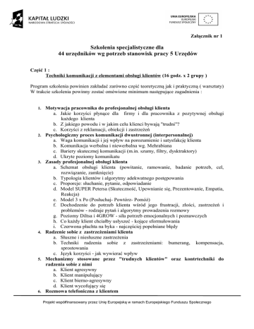 Załącznik nr 1 Szkolenia specjalistyczne dla 44 urzędników wg potrzeb stanowisk pracy 5 Urzędów Część 1 : Techniki komunikacji z elementami obsługi klientów (16 godz. x 2 grupy ) Program szkolenia powinien zakładać zarówno część teoretyczną jak i praktyczną ( warsztaty) W trakcie szkolenia powinny zostać omówione minimum następujące zagadnienia : 1. 2. 3. 4. 5. 6. Motywacja pracownika do profesjonalnej obsługi klienta a. Jakie korzyści płynące dla firmy i dla pracownika z pozytywnej obsługi każdego klienta b. Z jakiego powodu i w jakim celu klienci bywają "trudni"? c. Korzyści z reklamacji, obiekcji i zastrzeżeń Psychologiczny proces komunikacji dwustronnej (interpersonalnej) a. Waga komunikacji i jej wpływ na porozumienie i satysfakcję klienta b. Komunikacja werbalna i niewerbalna wg. Mehrabiana c. Bariery skutecznej komunikacji (m.in. szumy, filtry, dysktraktory) d. Ukryte poziomy komunikatu Zasady profesjonalnej obsługi klienta a. Schemat obsługi klienta (powitanie, ramowanie, badanie potrzeb, cel, rozwiązanie, zamknięcie) b. Typologia klientów i algorytmy adekwatnego postępowania c. Proporcje: słuchanie, pytanie, odpowiadanie d. Model SUPER Petersa (Skuteczność, Upewnianie się, Prezentowanie, Empatia, Reakcja) e. Model 3 x Po (Posłuchaj- Powtórz- Pomóż) f. Dochodzenie do potrzeb klienta wśród jego frustracji, złości, zastrzeżeń i problemów - rodzaje pytań i algorytmy prowadzenia rozmowy g. Poziomy Diltsa i 4GROW - siła potrzeb emocjonalnych i poznawczych h. Co każdy klient chciałby usłyszeć - kojące sformułowania i. Czerwona płachta na byka - najczęściej popełniane błędy Radzenie sobie z zastrzeżeniami klienta a. Słuszne i niesłuszne zastrzeżenia b. Techniki radzenia sobie z zastrzeżeniami: bumerang, kompensacja, sprostowania c. Język korzyści - jak wywierać wpływ Mechanizmy stosowane przez "trudnych klientów" oraz kontrtechniki do radzenia sobie z nimi a. Klient agresywny b. Klient manipulujący c. Klient bierno-agresywny d. Klient wycofujący się Rozmowa telefoniczna z klientem Projekt współfinansowany przez Unię Europejską w ramach Europejskiego Funduszu Społecznego a. Specyfika wywierania wpływu przez telefon b. Etapy rozmowy telefonicznej c. Biblia telefoniczna - sformułowania wyrażające troskę i dbałość o klienta oraz budujące autorytet 7. Zaawansowane aspekty obsługi klienta a. Neurolingwistyka (NLP) w wywieraniu wpływu i perswazji na kliencie oraz manipulacji nim w kontekście etyki b. Inteligencja emocjonalna i. mit o negatywnych emocjach ii. rola emocji i stresu iii. techniki kontrolowania emocji iv. techniki zmieniania emocji c. Asertywność i. Asertywność vs. agresja i wycofanie - definicje, granice, konsekwencje wyboru ii. zdarta płyta iii. otwarte drzwi / zasłona dymna iv. asertywna odmowa v. odroczenie asertywne vi. karty na stół vii. FUKO 8. Praktyczne symulacje zdarzeń zawodowych z wypracowaniem najefektywniejszych rozwiązań Część 2: Zarządzanie czasem (8 godz. x 2 grupy) i archiwizacja dokumentów (8 godz. x 2 grupy) I. Zarządzanie czasem (8 godz.) 8. analiza czasu: budżet czasu, tzw. złodzieje czasu, 9. proces wytyczania celów i priorytetów 10. zasady zarządzania priorytetami 11. efektywne zarządzanie swoją pracą w planowaniu przebiegu dnia 12. przeszkody w zarządzaniu sobą w czasie 13. delegowanie zadań ( z punktu widzenia pracownika) 14. prowadzenie spotkań a oszczędność czasu II. Archiwizacja dokumentów ( 8 godz. ) 1. 2. 3. 4. 5. 6. Zagadnienia wstępne, definicje Podstawowe czynności kancelaryjne Przyjmowanie i rozdział korespondencji Rejestracja pism, dyspozycje, dekretacja pism Formy załatwiania spraw Redagowanie pism urzędowych a. powstawanie tekstu b. zakłócenia w przekazie c. elementy konieczne pisma d. elementy dodatkowe 7. Struktura i status pisma urzędowego Projekt współfinansowany przez Unię Europejską w ramach Europejskiego Funduszu Społecznego 8. Cechy stylu urzędowego 9. Prawidłowa korekta 10. Pieczęcie i podpisywanie pism 11. Inne rodzaje tekstów a. raporty, notatki służbowe 12. Rola poczty elektronicznej a. e-mail b. podpis elektroniczny 13. Tworzenie dokumentacji na stanowiskach 14. Jednolity Rzeczowy Wykaz Akt wg nowych przepisów prawa– teoria i praktyka 15. Tworzenie teczki akt a. znak teczki, znak sprawy b. spisy spraw, rejestry c. ostateczne załatwienie sprawy 16. Archiwizowanie akt a. kategorie archiwalne b. spisy zdawczo-odbiorcze Część 3: Zamówienia publiczne ( 16 godz. x 2 grupy) 1. Wprowadzenie. Aktualny stan prawny wraz z zestawieniem najważniejszych aktów wykonawczych, koniecznych do przygotowania i przeprowadzenia postępowania. 2. Przygotowanie do postępowania o udzielenie zamówienia publicznego w trybie przetargu nieograniczonego - zagadnienia: ustalenie wartości zamówienia, opis przedmiotu zamówienia, przygotowanie siwz, przygotowanie ogłoszenia, ustalenie harmonogramu czasowego, kontrola – poszczególne czynności i ich udokumentowanie. Kontrola, odpowiedzialność. 3. Prowadzenie postępowania o udzielenie zamówienia publicznego, główne zagadnienia: wszczęcie postępowania, zapytania, żądanie wyjaśnień, zmianymodyfikacje, złożenie oferty/wadium, otwarcie ofert – BADANIE I OCENA, wybór oferty najkorzystniejszej, zawarcie umowy. Kontrola, odpowiedzialność. 4. Zamówienie z wolnej ręki – wymagania, obowiązki. Schemat postępowania i obowiązującej dokumentacji. 5. Protokół postępowania –zasady jego wypełniania (PN i WR). 6. Postępowania o udzielenie zamówienia publicznego do 14 000 euro, główne zagadnienia: regulacje wewnętrzne, wykaz przepisów i wytycznych – obowiązek/możliwość uwzględnienia w prowadzonym postępowaniu, przykładowe rozwiązania u zamawiających. Kontrola, odpowiedzialność. 7. Wytyczne w zakresie stosowania ustawy Pzp w „projektach unijnych” ( EFS, EFRR) 8. Kontrola zamówień publicznych. Wymierzanie korekt f