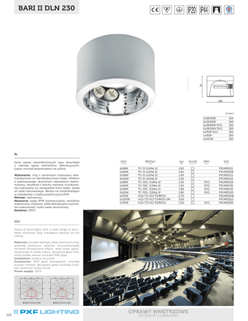 BARI II DLN 230 A PL Seria opraw oświetleniowych typu downlight z szeroką gamą elementów dekoracyjnych. Łatwy montaż bezpośrednio na suficie. Wykonanie: ring z aluminium malowany elektrostatycznie (w standardzie kolor biały), reflektor z polerowanego aluminium obwodowo fasetonowany, obudowa z blachy stalowej ocynkowanej malowanej (w standardzie kolor biały). Szyba ze szkła hartowanego. Wersja na metalohalogen w standardzie z szybą przezroczystą IP44. Montaż: nastropowy Akcesoria: szyby IP44 (przezroczysta, centralnie matowiona, matowa), szkło dekoracyjne (centralnie matowione), turbo raster aluminiowy. Zasilanie: 230 V ENG Series of downlights with a wide range of decorative elements. Easy installation directly on the ceiling. Materials: powder painted, white aluminum ring; polished aluminum reflector circumferentially facetted (honeycomb effect), steel sheet galvanized body in white colour; tempered glass (SH); metal halide version includes IP44 glass. Installation: surface mounted Accessories: IP44 glass (transparent, centrally frosted, frosted), decorative glass (centrally frosted), aluminum turbo louver Power supply: 230 V 40 40 80 80 120 120 160 160 200 200 BARI II DLN 195 110 BARI II DLN 230 OPRAWY WNĘTRZOWE INTERIOR LUMINAIRES