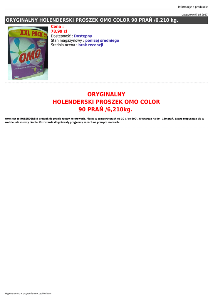 Informacje o produkcie Utworzono 07-03-2017 ORYGINALNY HOLENDERSKI PROSZEK OMO COLOR 90 PRAŃ /6,210 kg. Cena : 78,99 zł Dostępność : Dostępny Stan magazynowy : poniżej średniego Średnia ocena : brak recenzji ORYGINALNY HOLENDERSKI PROSZEK OMO COLOR 90 PRAŃ /6,210kg. Omo jest to HOLENDERSKI proszek do prania rzeczy kolorowych. Pierze w temperaturach od 30 C°do 60C°. Wystarcza na 90 - 180 prań. Łatwo rozpuszcza się w wodzie, nie niszczy tkanin. Pozostawia długotrwały przyjemny zapach na pranych rzeczach. Wygenerowano w programie www.oscGold.com